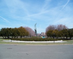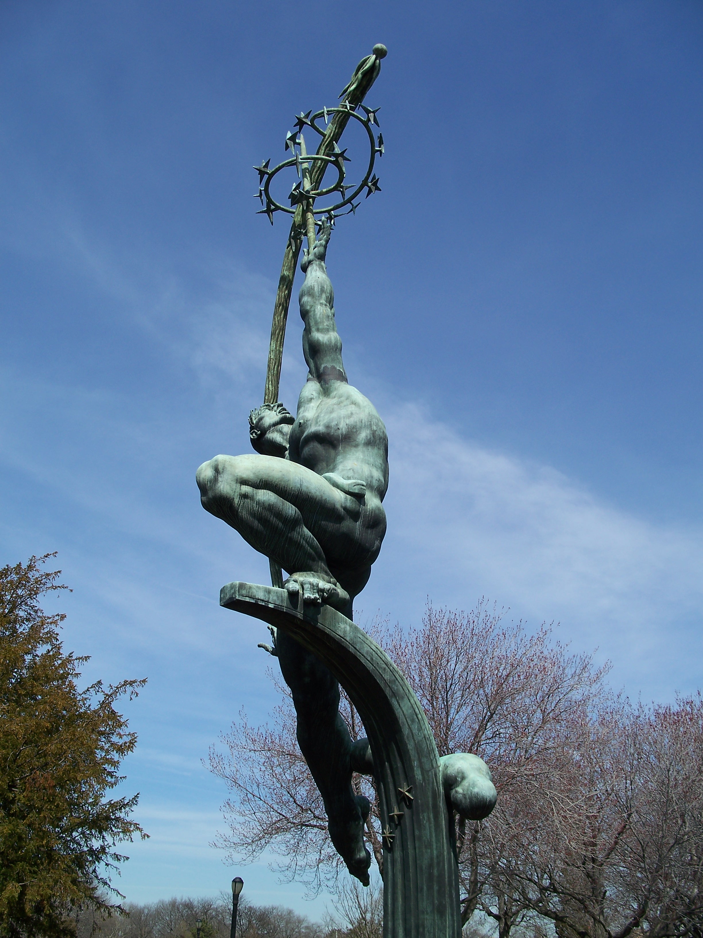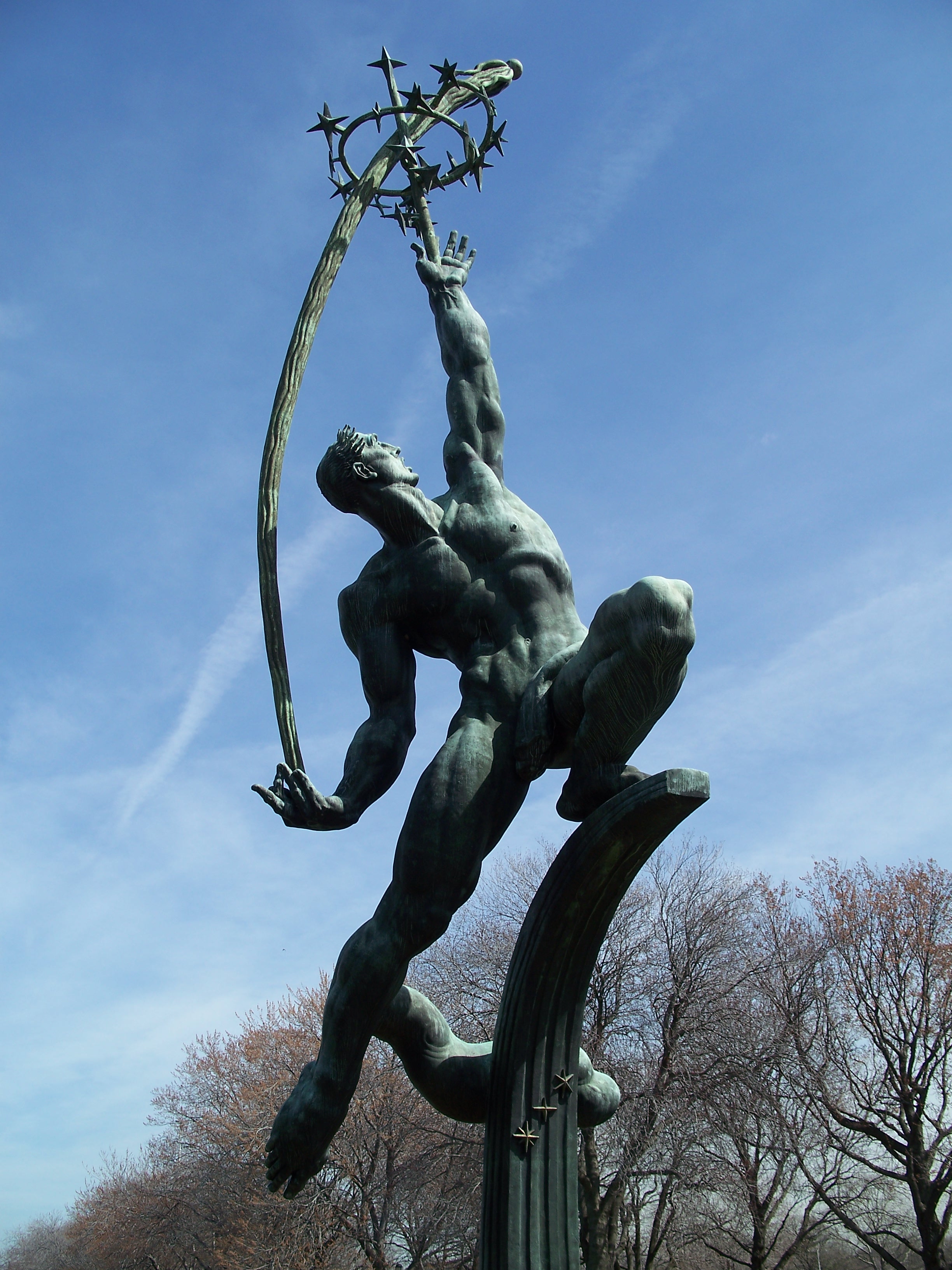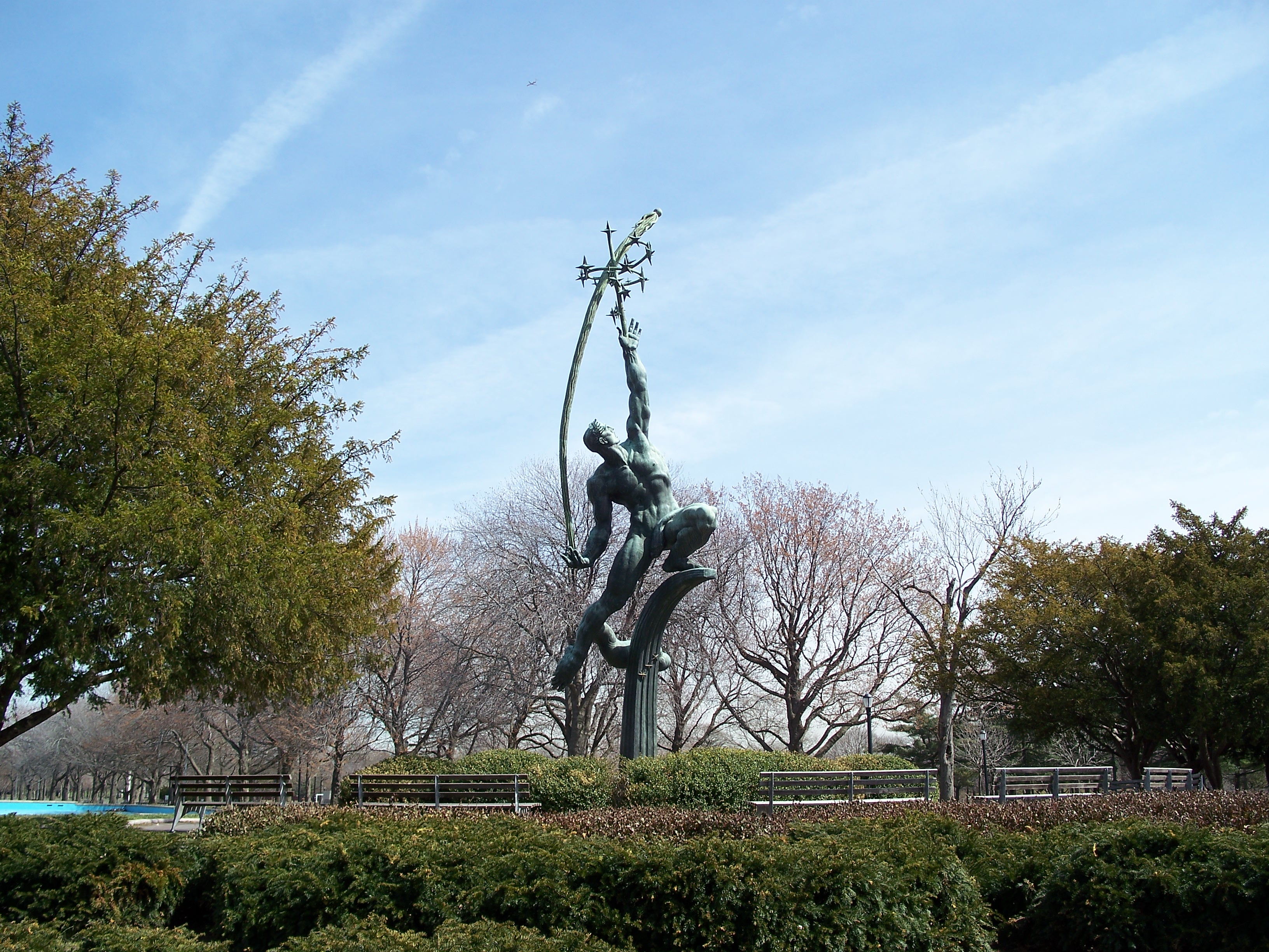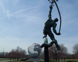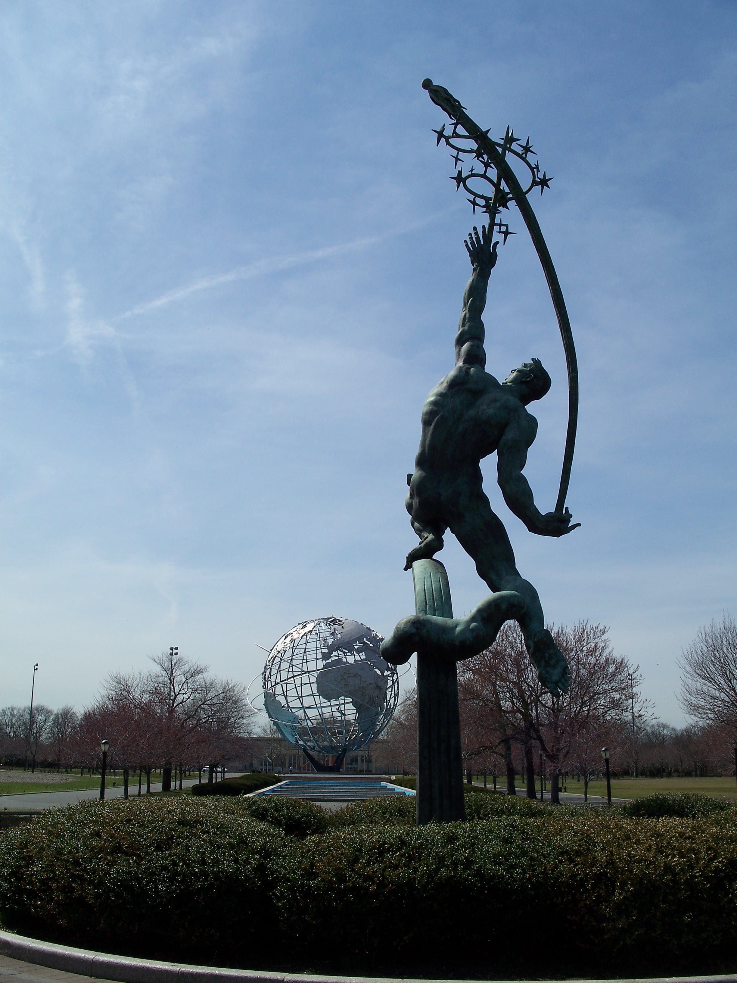 The Rocket Thrower was sculpted by Donald Delue for the 1964 World's Fair and stands between the Fountain of the Fairs and the Unisphere reflecting pool. One of my earliest memories of photographs of New York is an iconic photo of the Rocket Thrower in the foreground with a lighted Unisphere in the background. Note that his right hand is giving a one-fingered salute to the good people of Queens. Or is he flipping off the Yankees...hard to say.