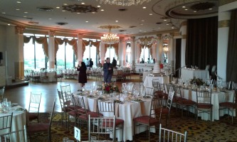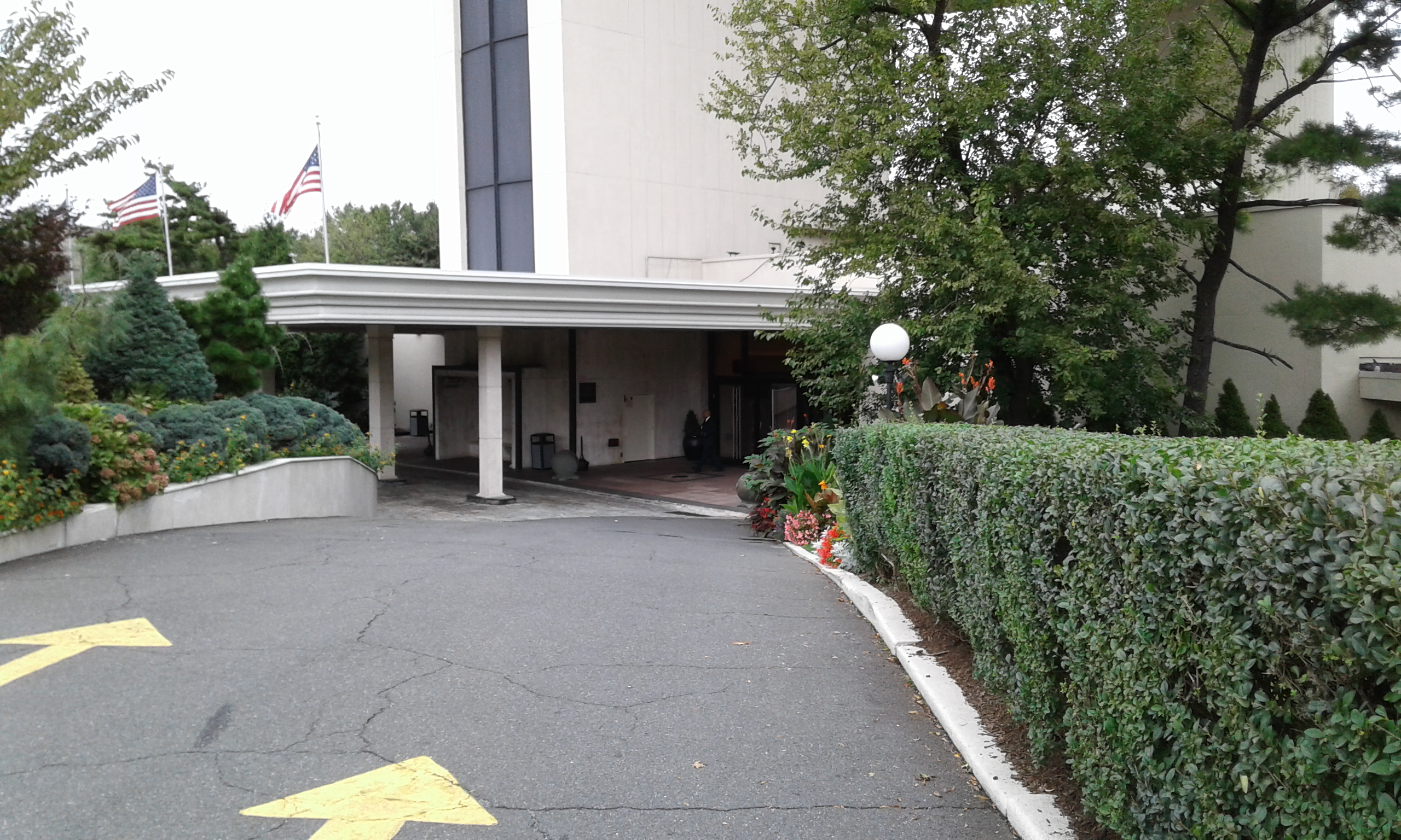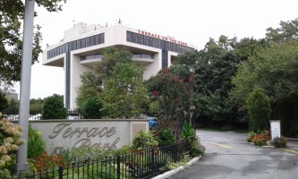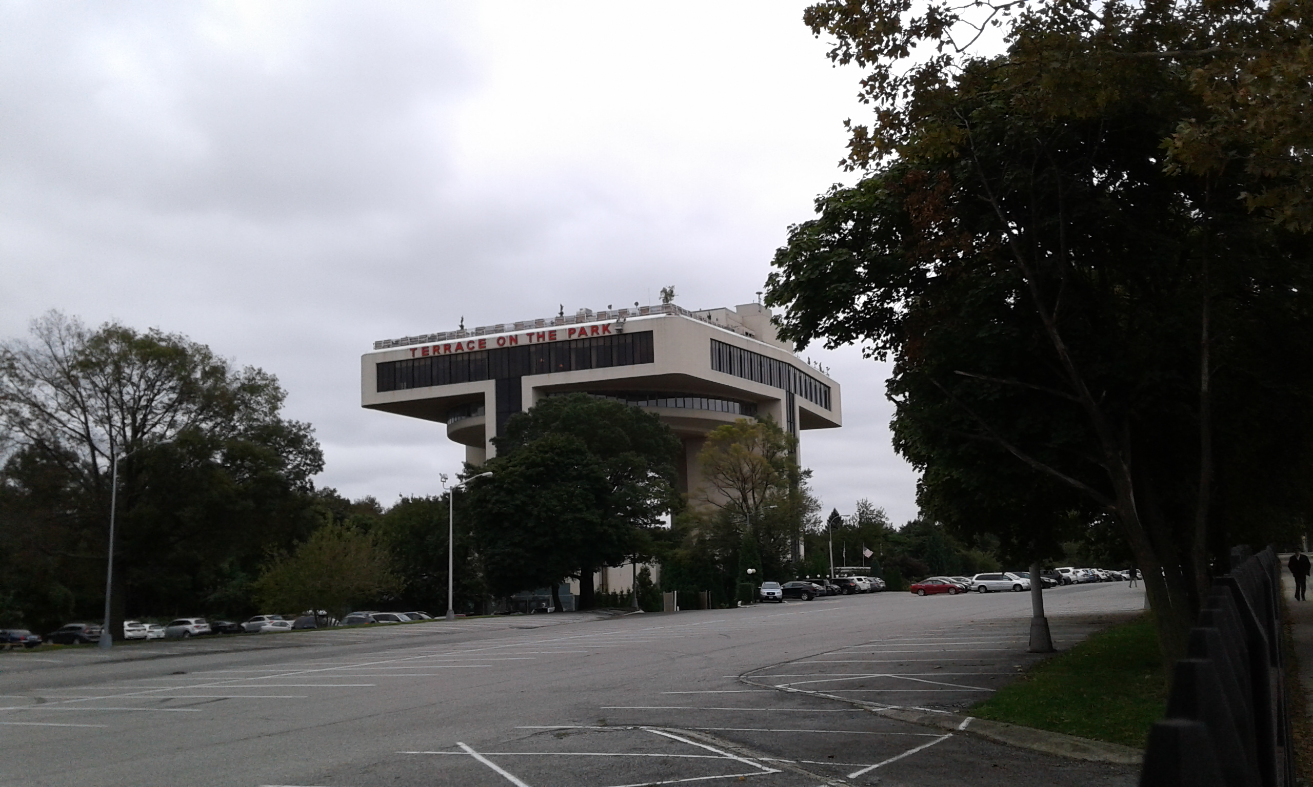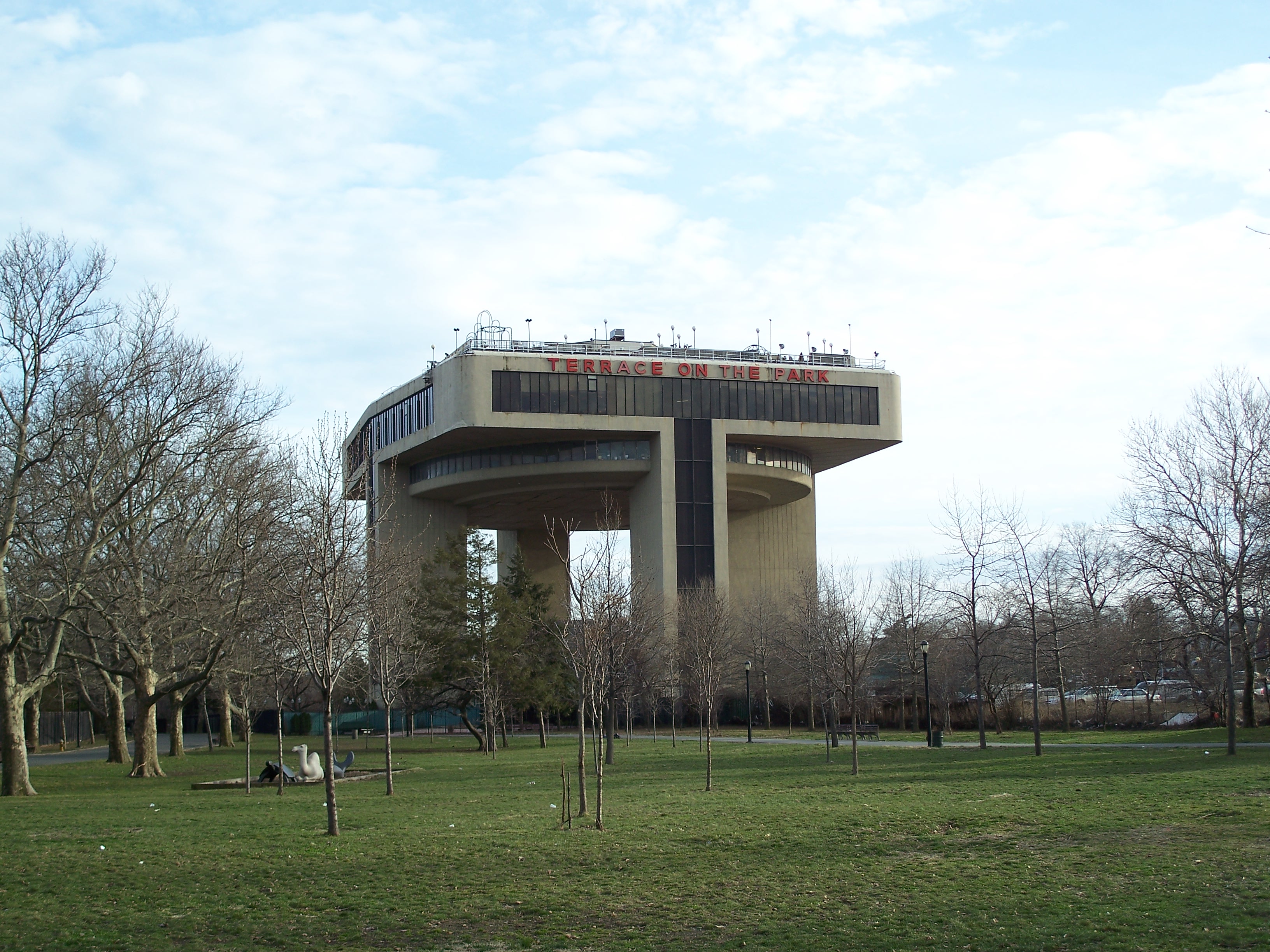 Terrace on the Park was built for the 1964 fair as a 120-foot-high heliport with a 175' x 200' landing platform. The building was part of the fair's transportation exhibit and the window layout on each side forms a "T". The top floor included a 1,100-seat restaurant with great views of the fair. The bottom floor housed the kitchen and a 400-seat cocktail lounge that served drinks from 24 locations around the world. The exhibit building featured a 12-minute film extolling the glories of the Port of New York and New Jersey on a 360-degree screen. The facility later became a catering facility that was popular for wedding receptions.