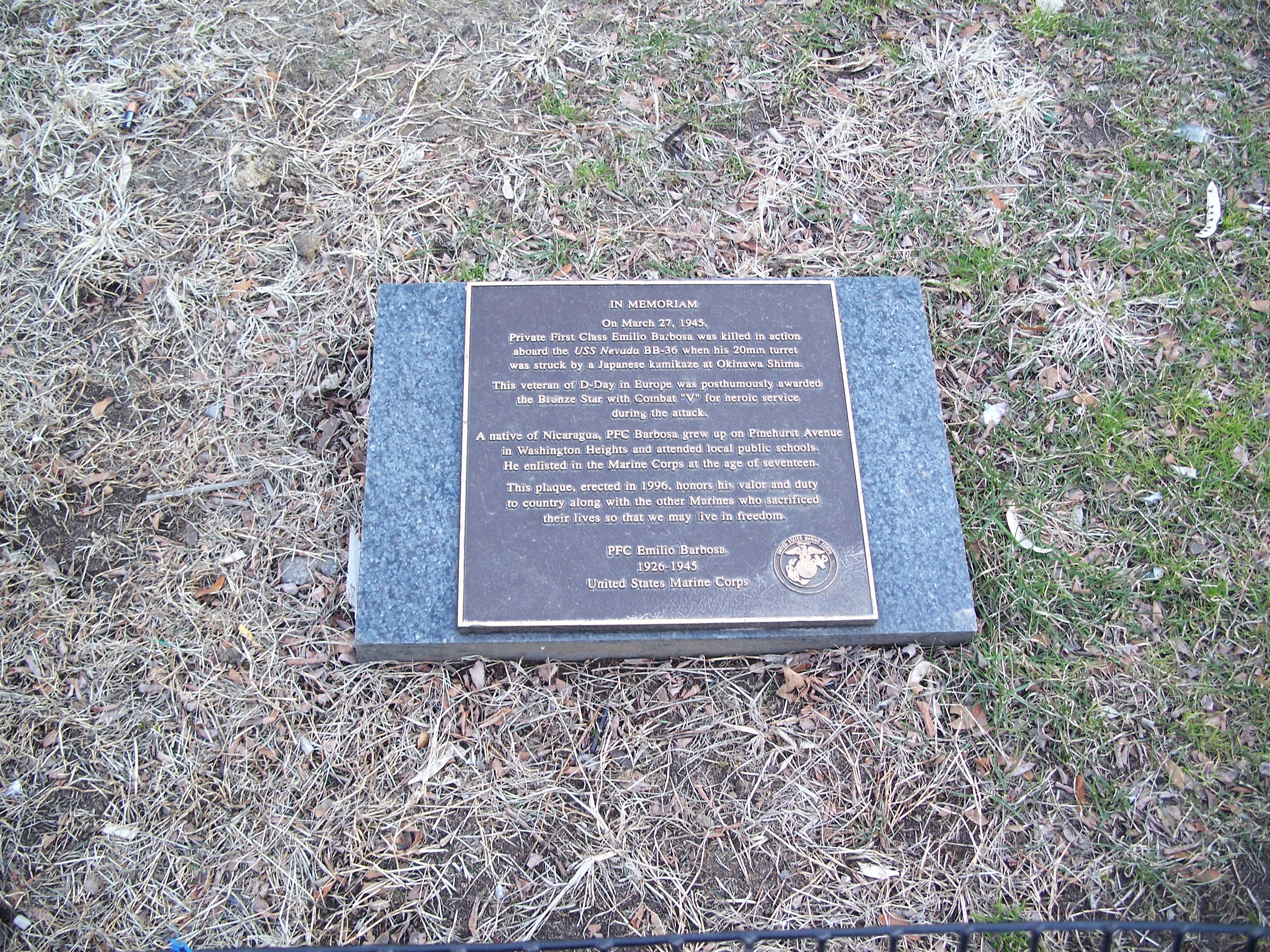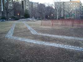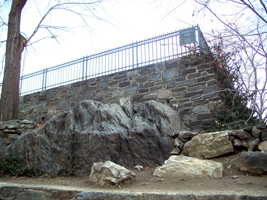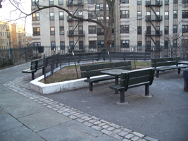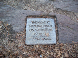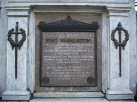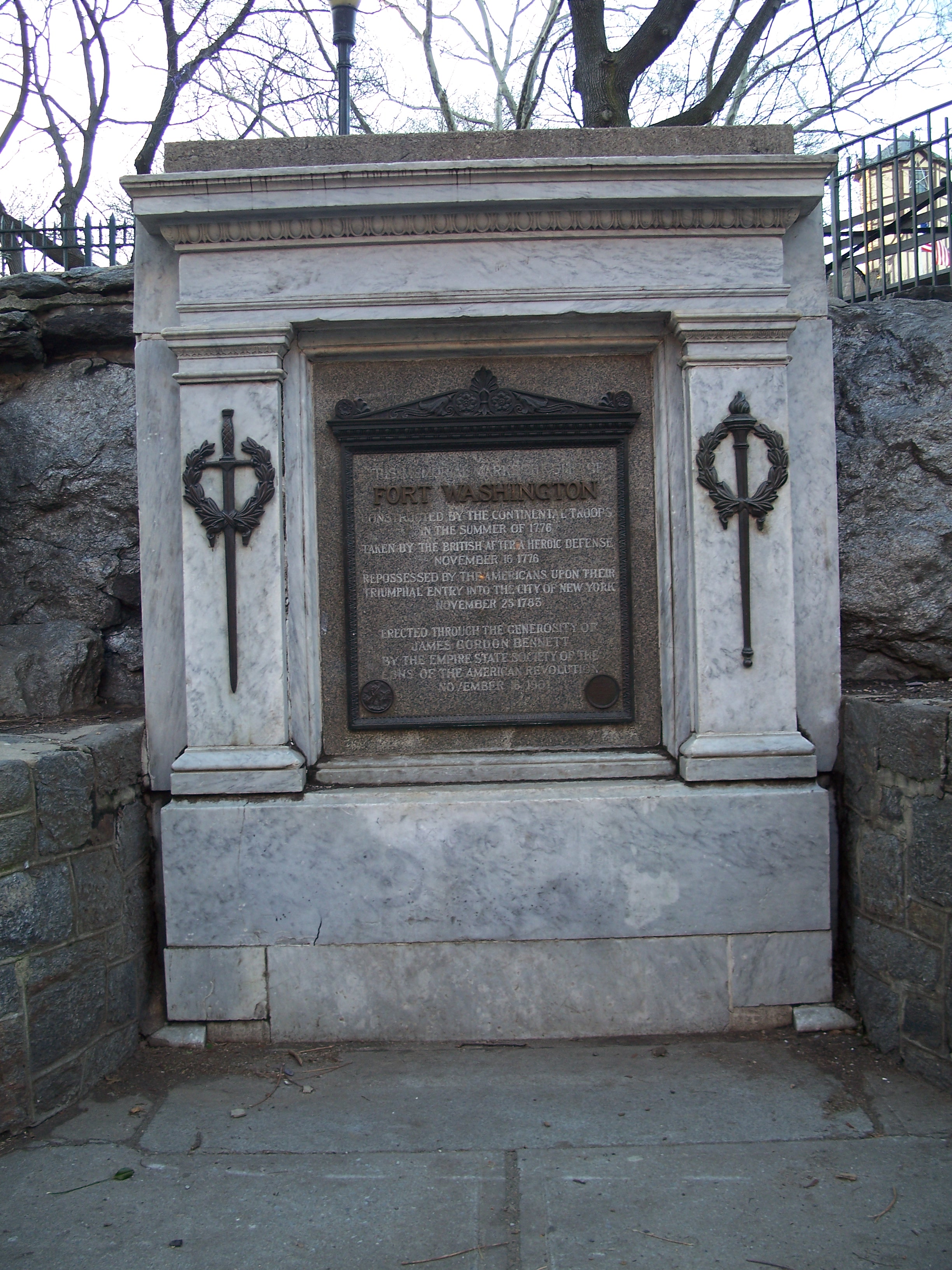 The true location of Fort Washington is in James Gordon Bennett Park, located between 183rd Street, 185th Street, Fort Washington Avenue and Pinehurst Avenue. James Gordon Bennett (1795-1872) was the founder, editor and publisher of the New York Herald and a pioneer in the American newspaper business. Bennett owned this plot of land and his son, James Gordon Bennett, Jr. (1841-1918), permitted the Sons of the American Revolution to erect the bronze and marble memorial pictured here. After Bennett died, the property was sold although the former fort location was not subdivided and was ultimately bought by the city for a park in 1928. (reference)