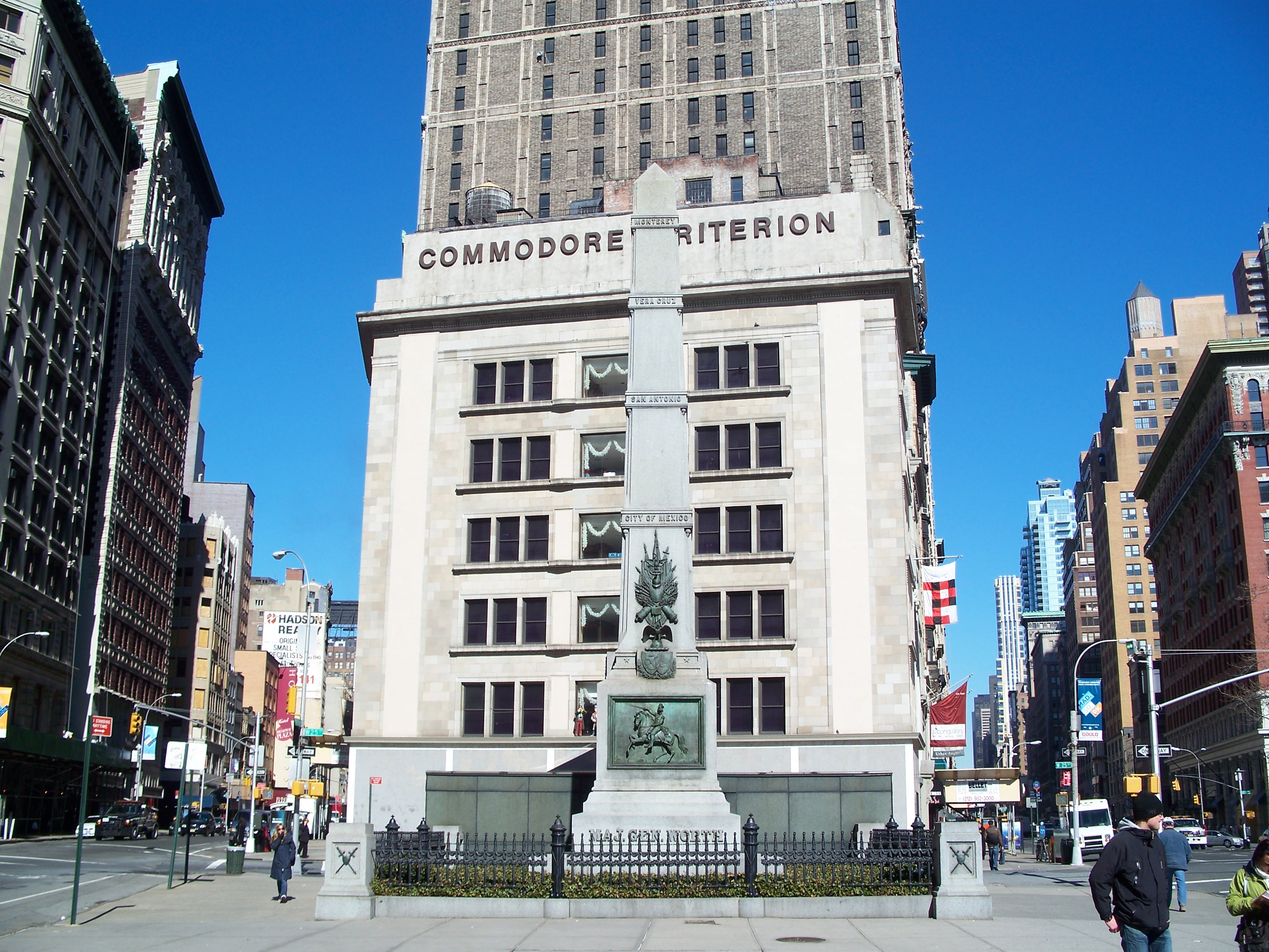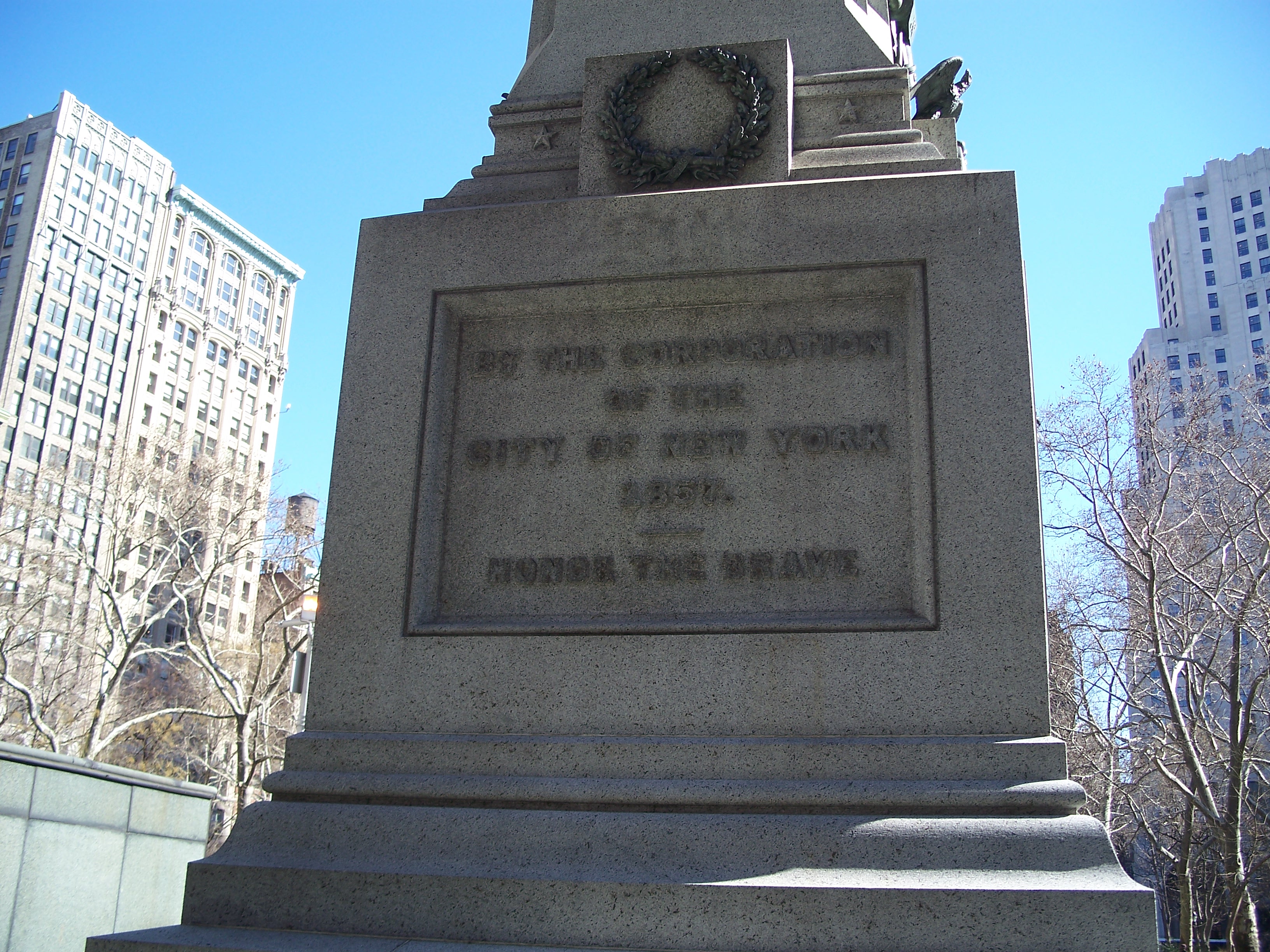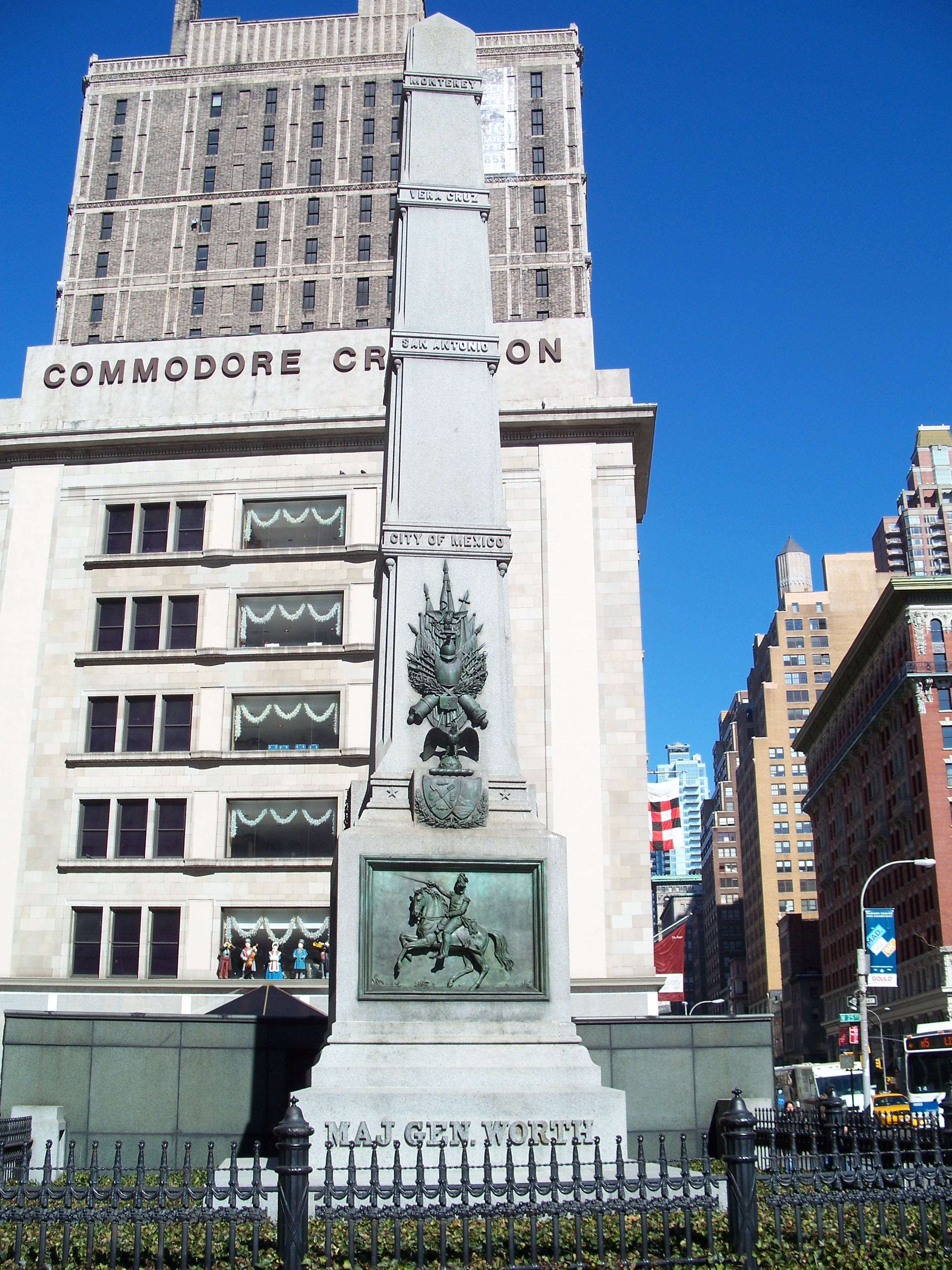 Worth was placed in command of the Department of Texas, where he died of cholera in San Antonio. The City of NY reinterred Worth from Green-Wood Cemetery in Brooklyn to this spot and erected this monument in 1857. The memorial was designed by James Goodwin Batterson (1823-1901) and is located just to the north of the confluence of Broadway and Fifth Avenue on West 25th Street just west of Madison Square Park. (Parks Dept. Historical Sign)