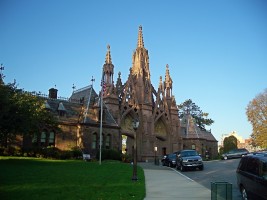 Green-Wood Cemetery was founded in 1838 when this part of Brooklyn was still rural. Brooklyn social leader Henry Evelyn Pierrepoint spearheaded the formation of the cemetery, which was inspired by the naturalistic English landscape of Mount Auburn Cemetery in Cambridge, MA. The original layout for the cemetery was designed by landscape architect David Bates Douglass. The 478 acres have a varied terrain formed by glacial moraines and feature both the highest point in Brooklyn (Battle Hill) and four glacial kettle ponds. It has been a tourist destination since the mid 19th century and, as of this writing, is the final resting place of around 600,000 persons. The cemetery was designated National Historic Landmark in 2006