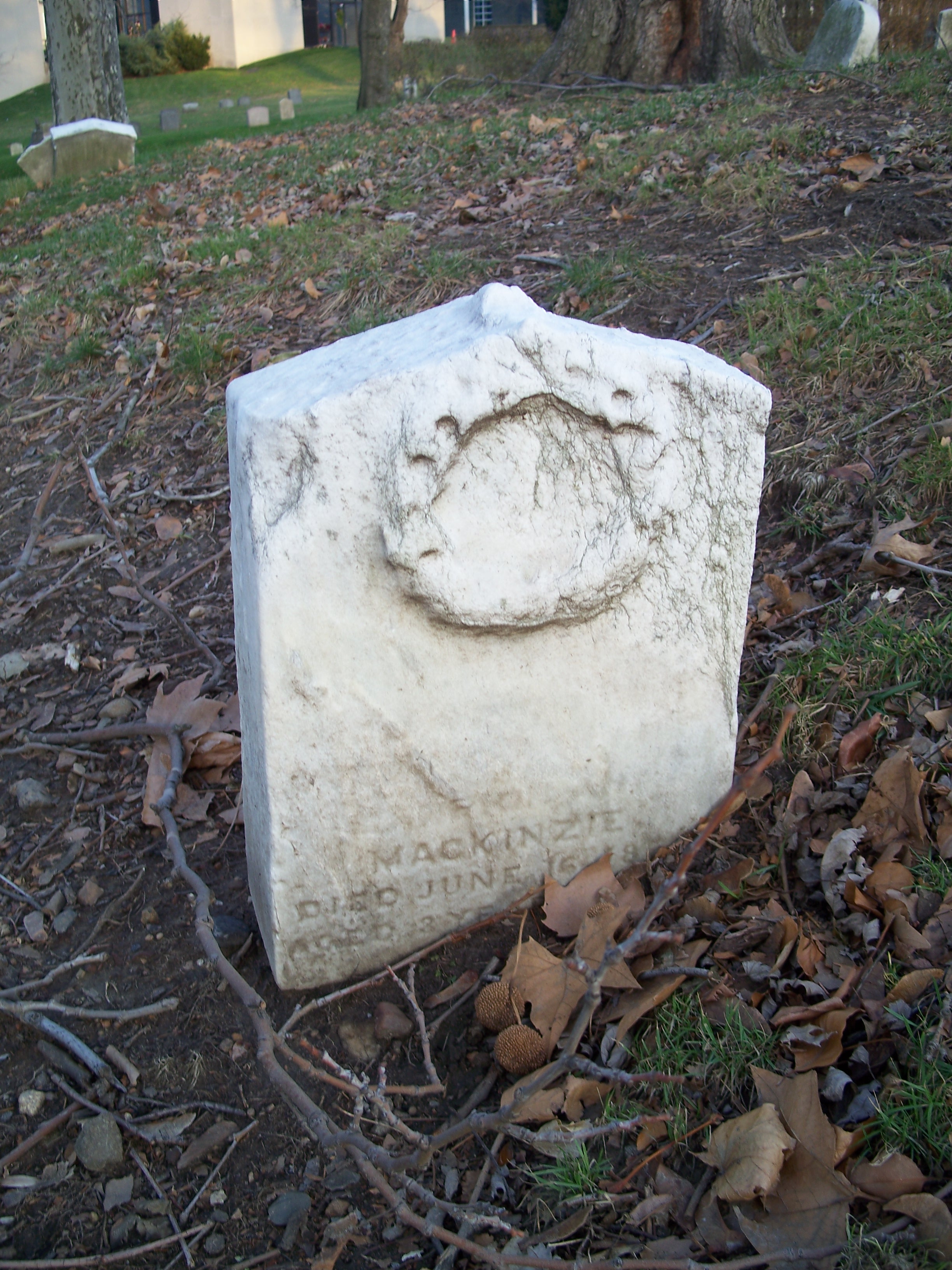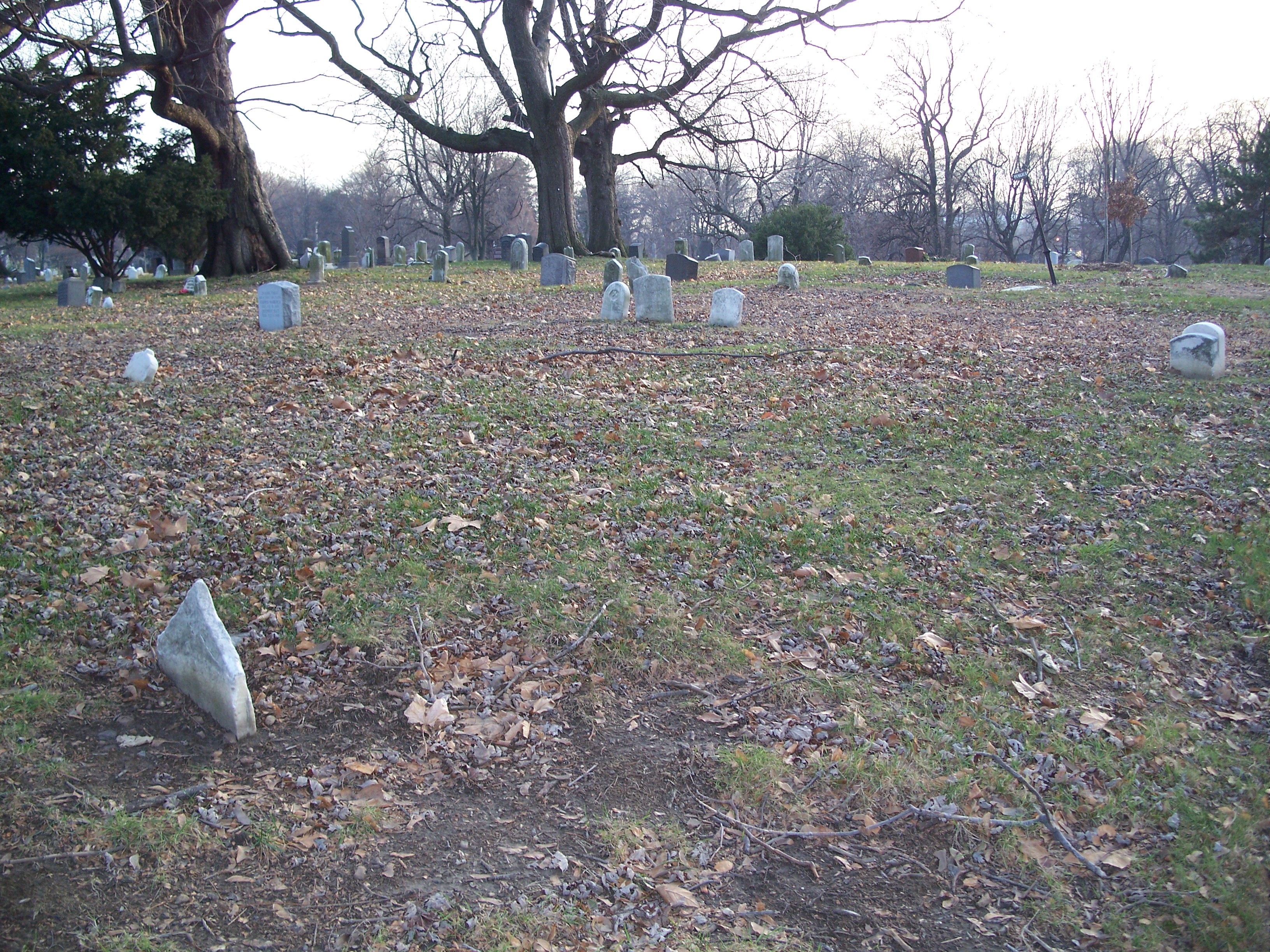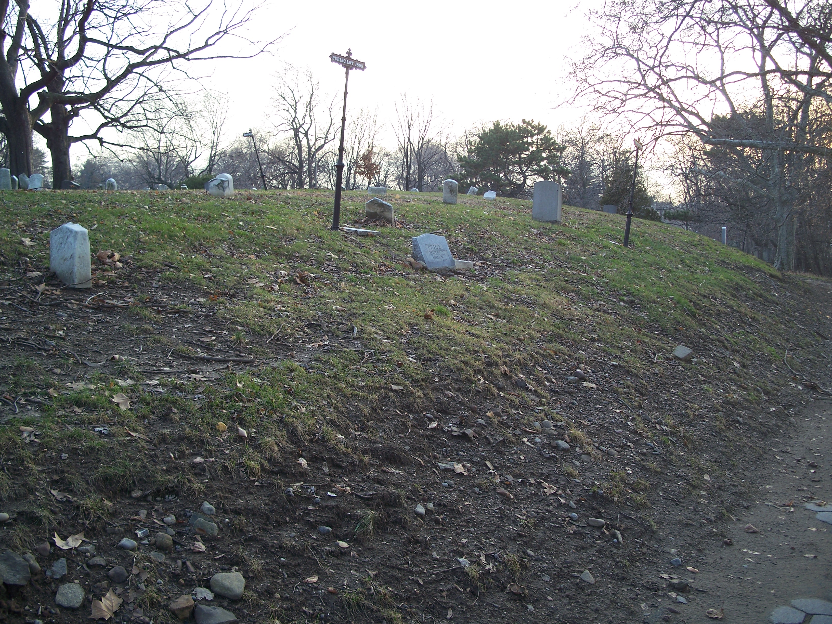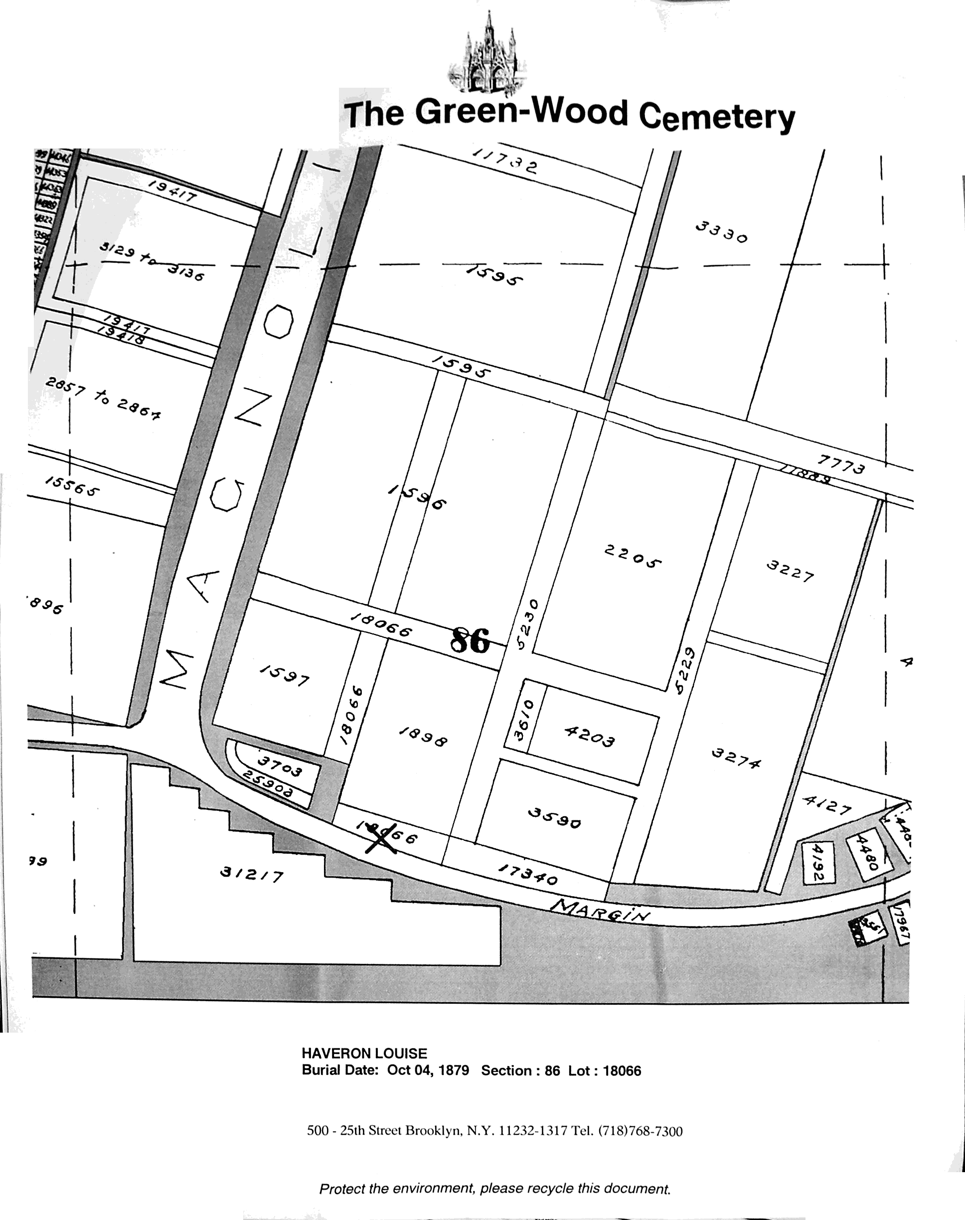 The cemetery database lists Louise Haveron (1857-1879) as being buried in section 86, lot 18066. One of her relatives said someone else had unsuccessfully looked for the grave and asked if I would give it a spin. The grave supposedly contains four persons, Louise, her parents John and Eliza, and a Mary E. McLaughlin. Although this is a fairly old section of the cemetery, thankfully, the lot was fairly small, saving me the hours of futile looking that are typical when a grave that old is in a large, indistinct lot. Lot 18066 is just to the west of lot 1898, which has a marker. A fairly recent grave for Frederic and Helen (1919-2004) Price is listed in the database indicating that this is definitely lot 18066 and that the Haverons do not have an extant grave marker of any kind. Surrounding graves for G.P Merkel (d. 1871 - lot 1597?), Daniel W. Teller (lot 17340?) and (unknown) Mackenzie are not in the database, indicating that the database seems to be missing a significant number of older graves.