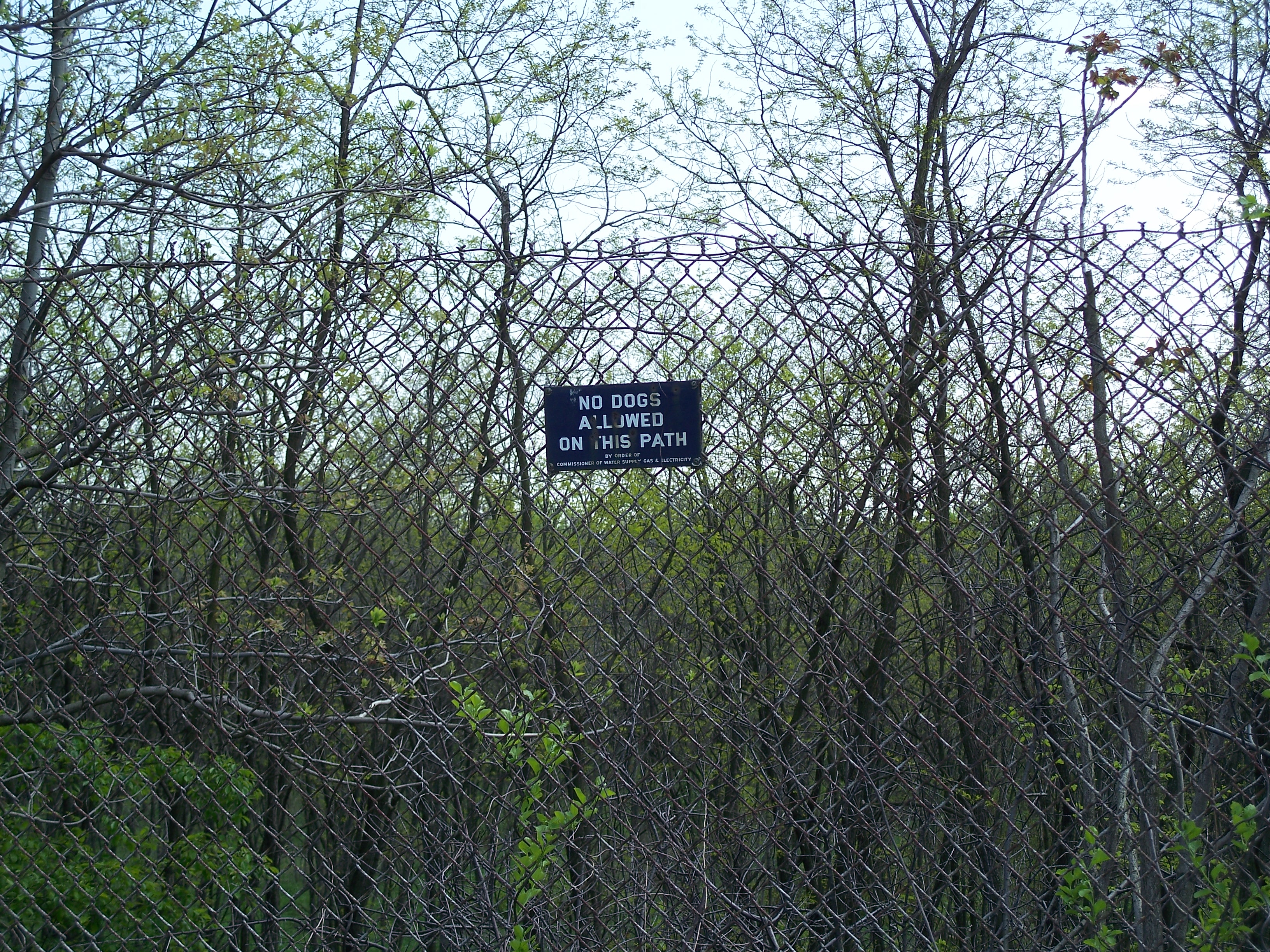 'No dogs' sign on north fence of west basin