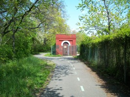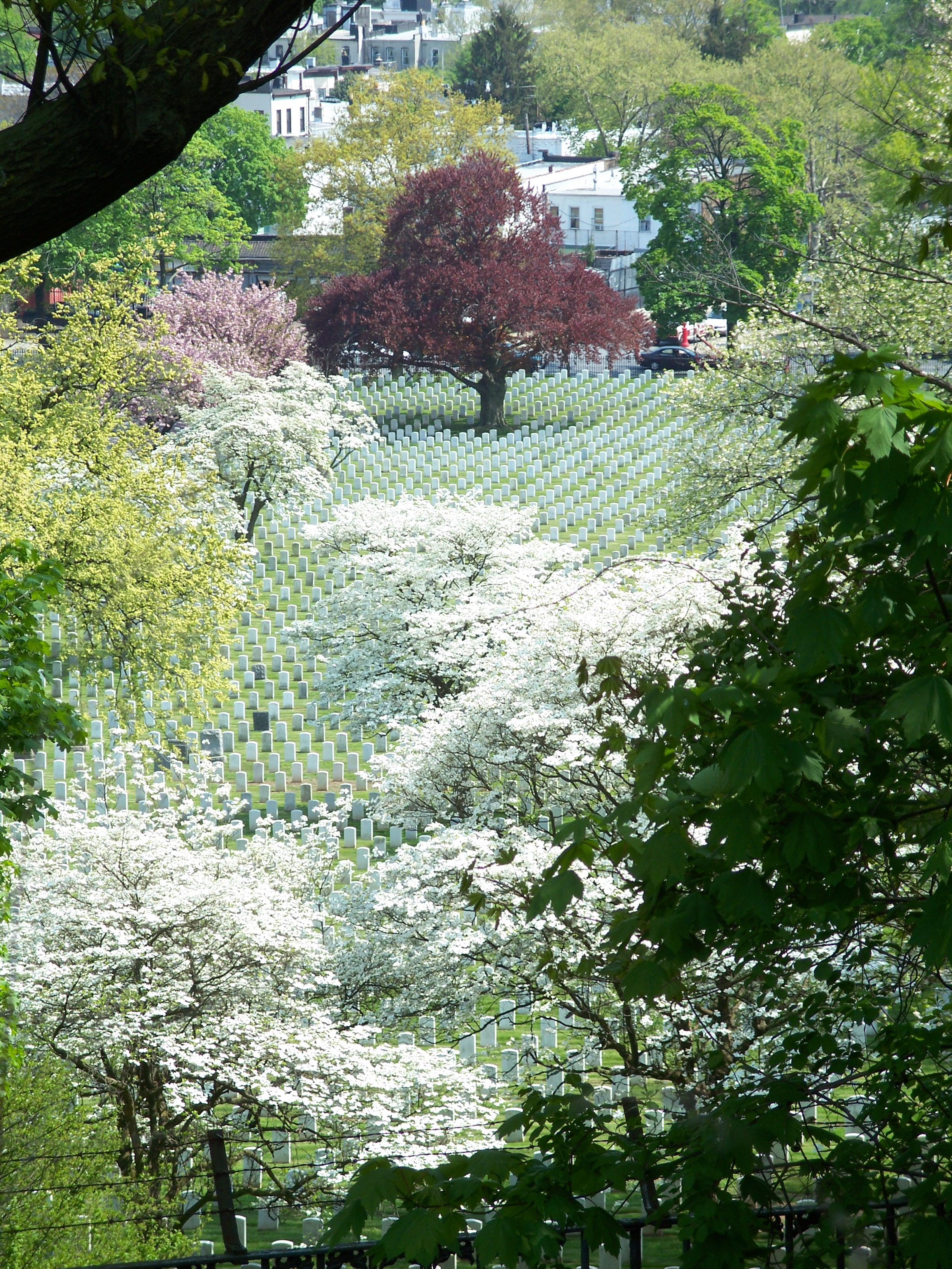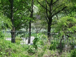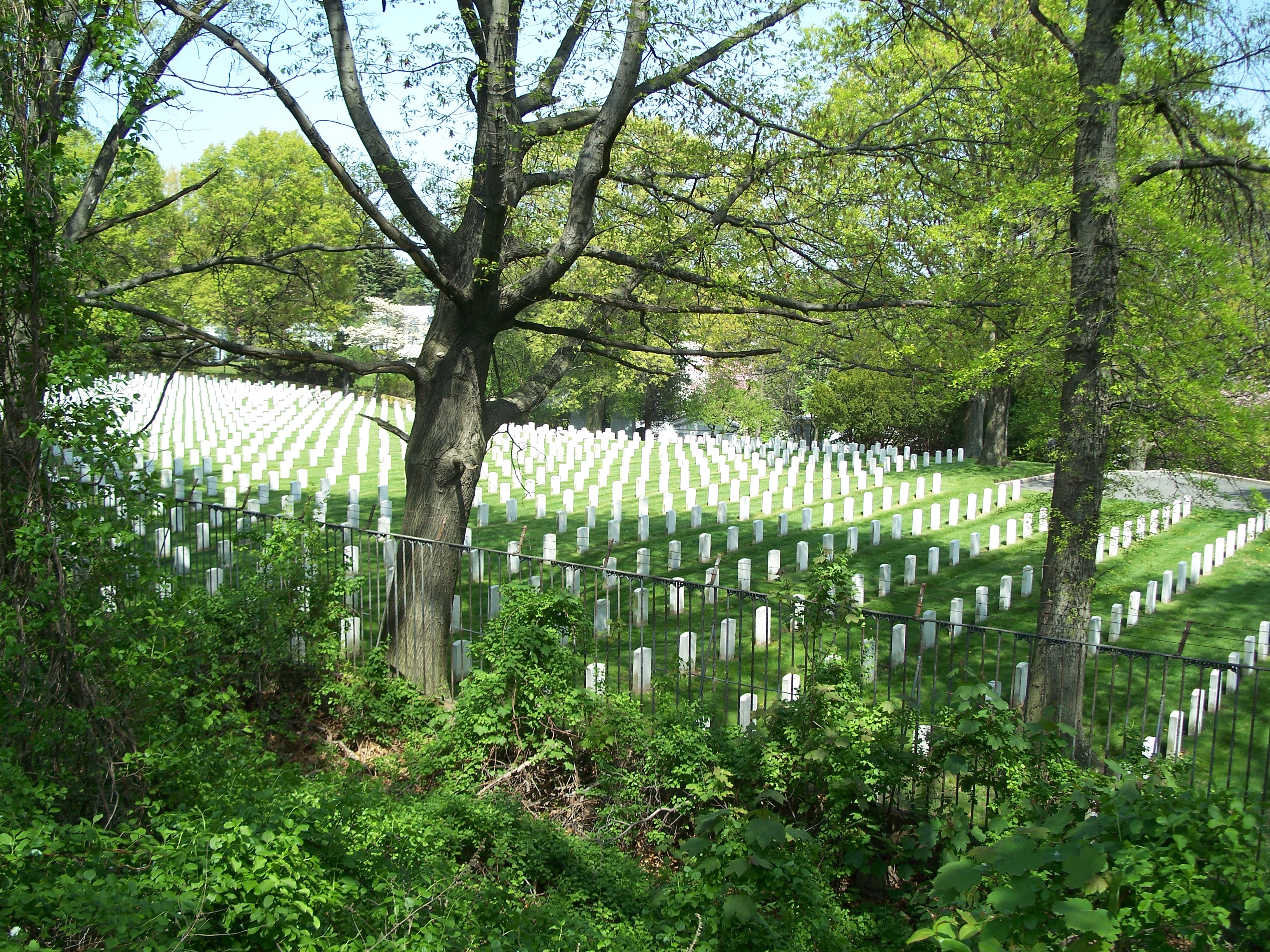 Cypress Hills Memorial Cemetery viewed from bike path on east side of the east basin