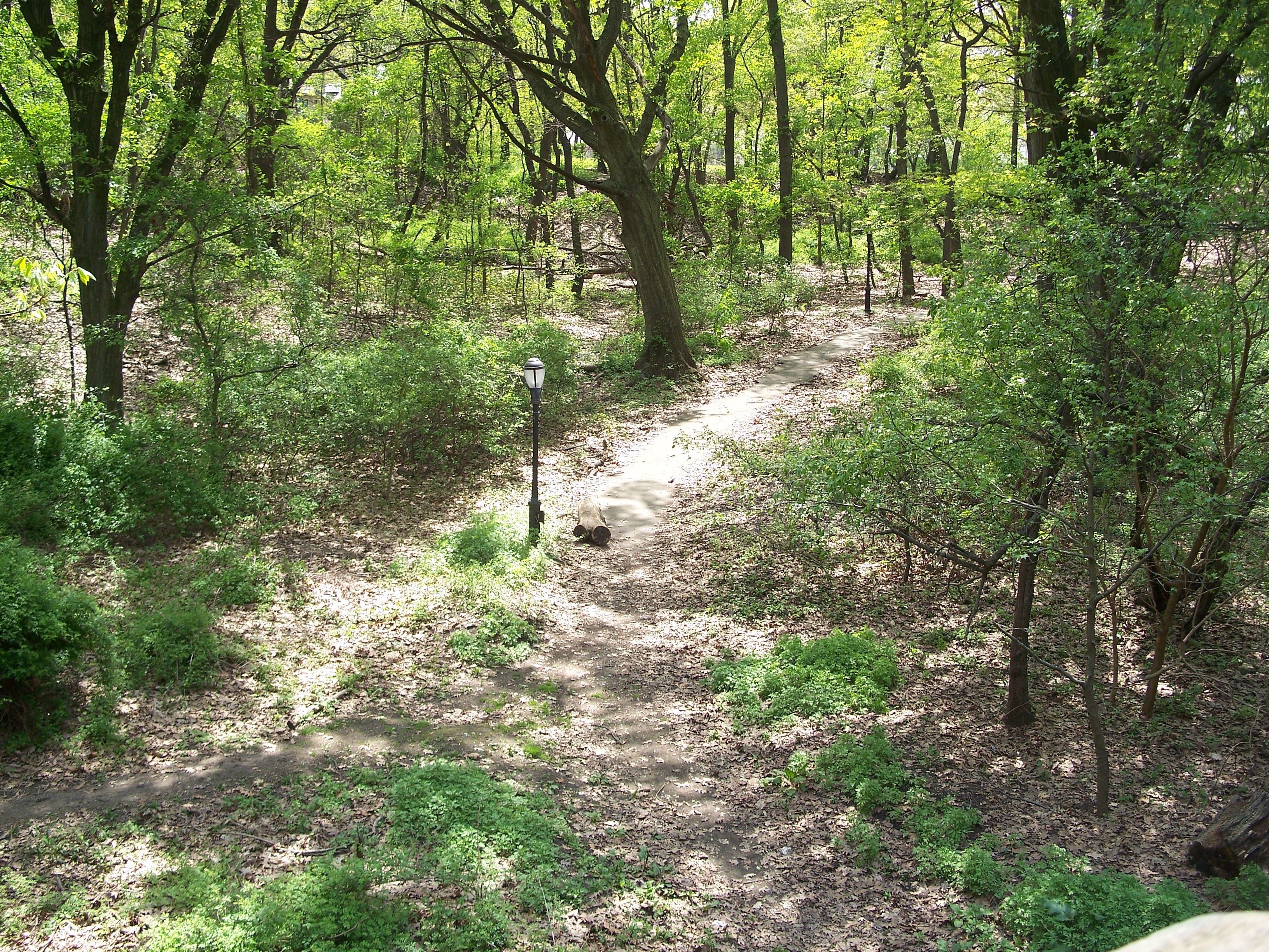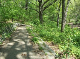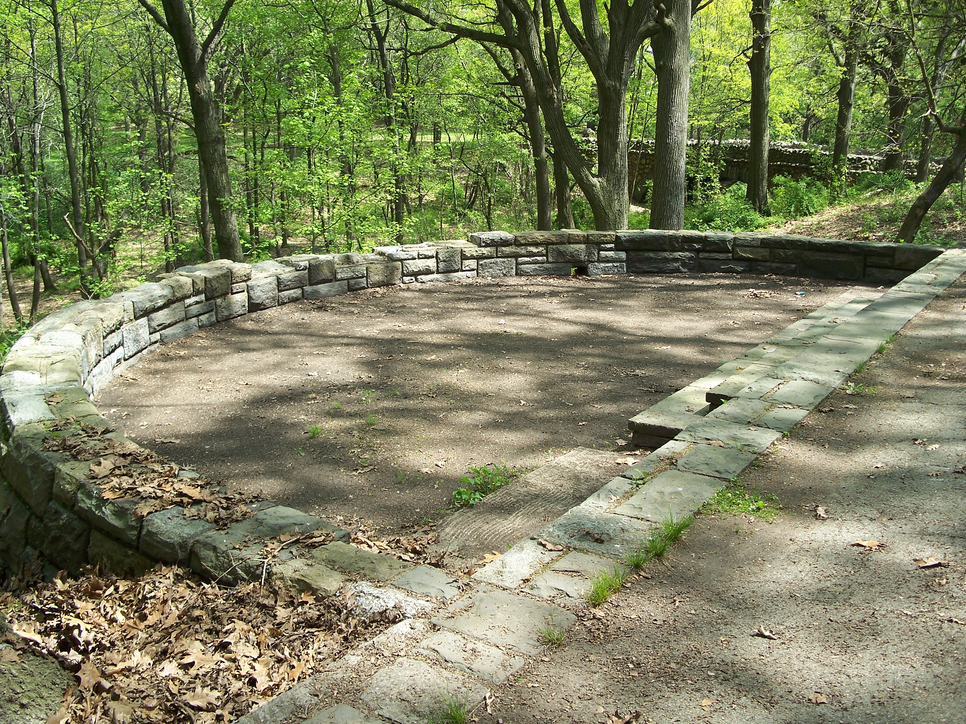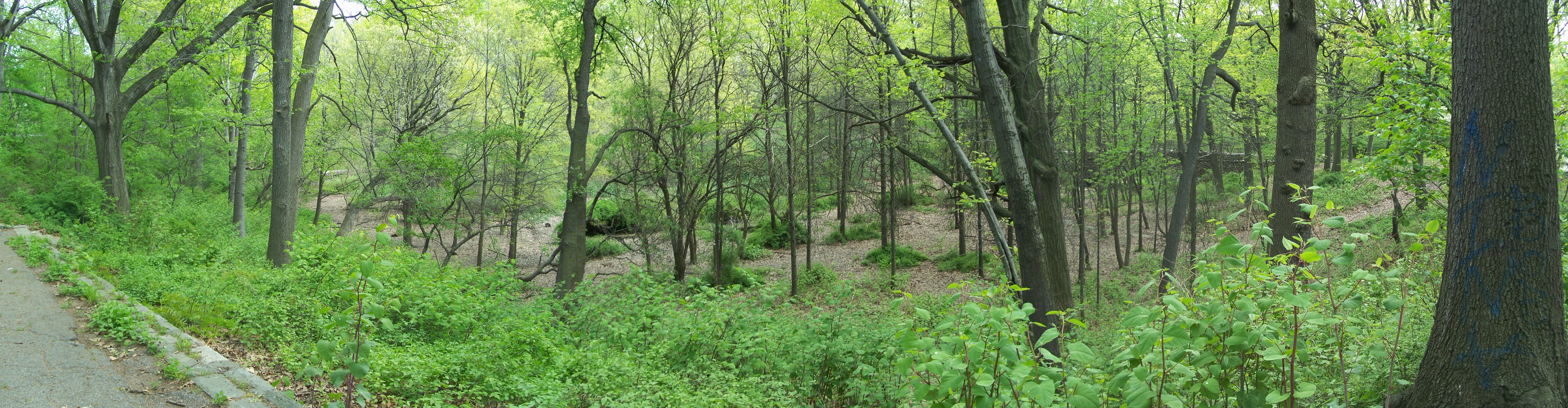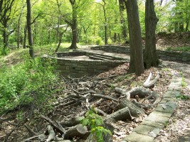 This naturally-occuring glen in the western part of the upper park has a paved walkway around its upper rim and a surprisingly ornate scenic overlook ("the fort"). From inconclusive historic photos, this glen may have contained a pond during the early years of the park (which would explain the overlook) but no trace remains. The glen is now well overgrown with trees and small plants and does not appear to be very carefully maintained or used by local residents.