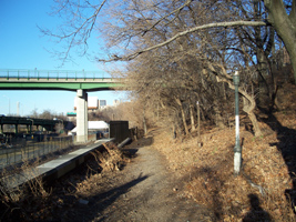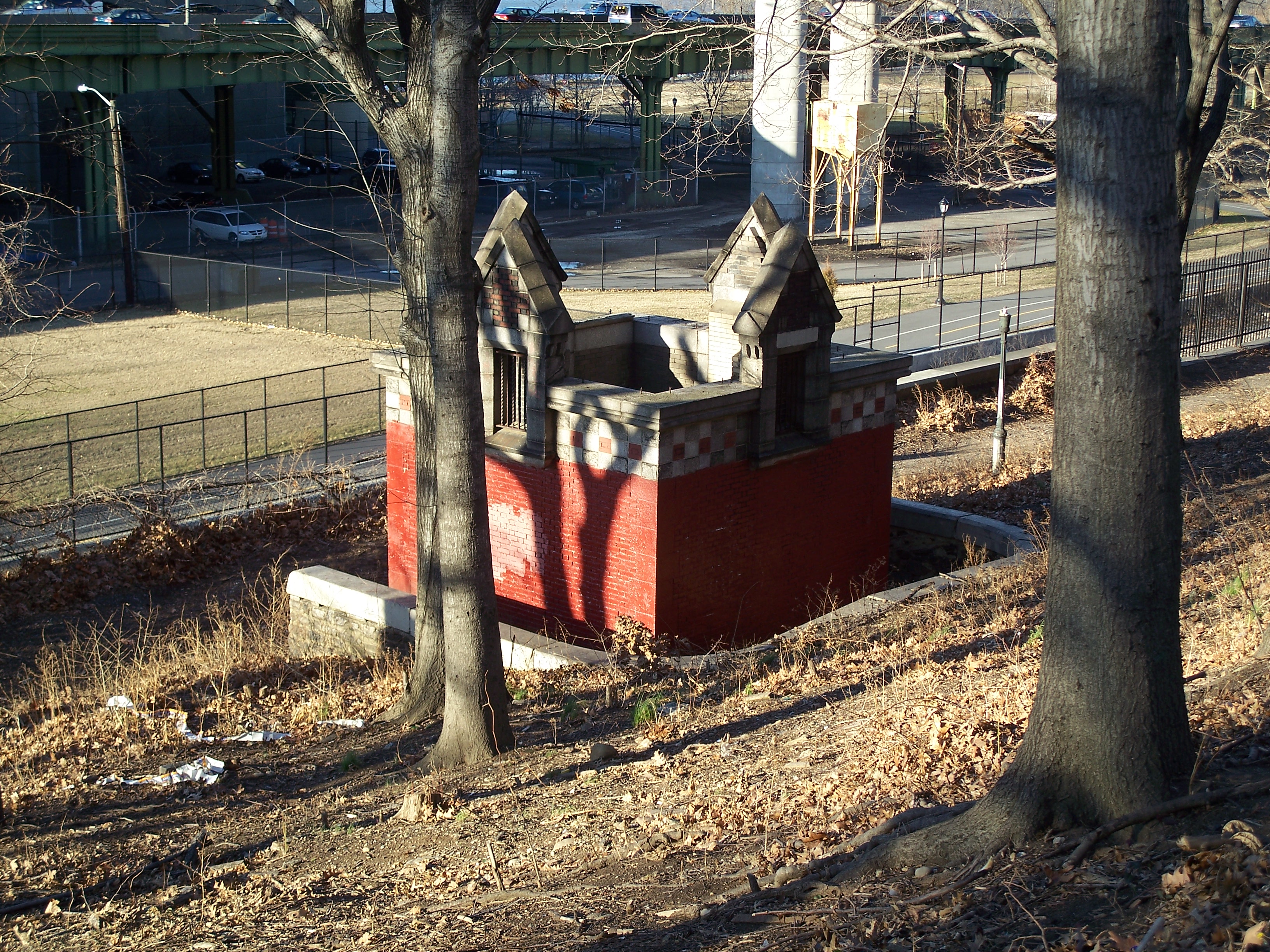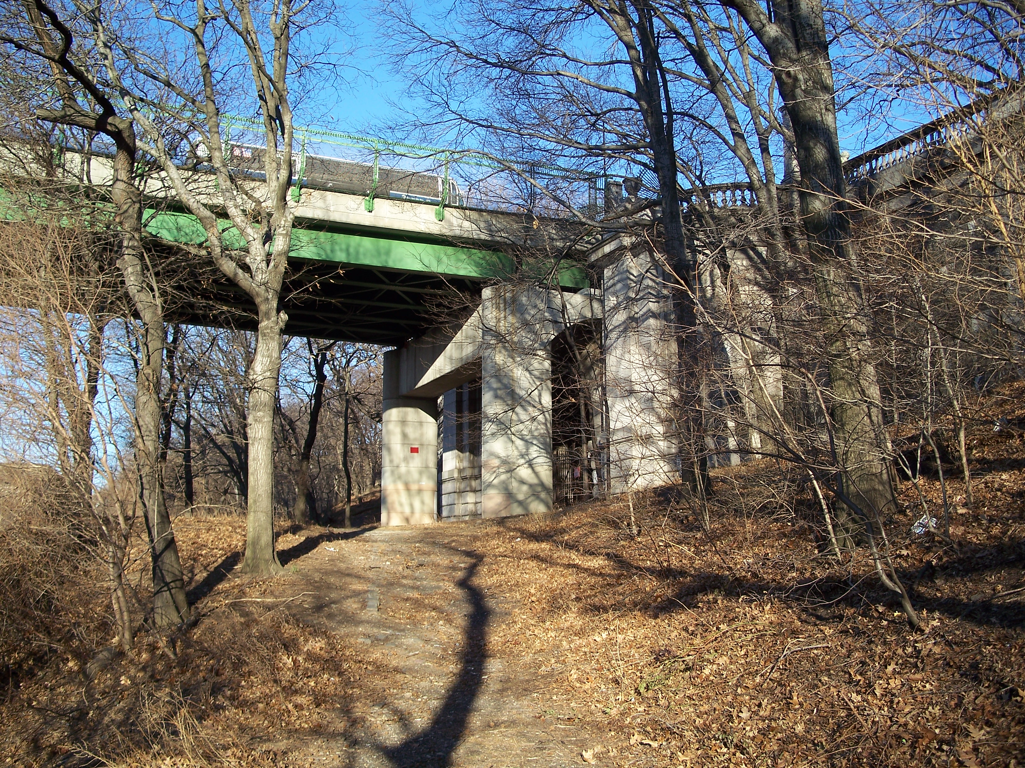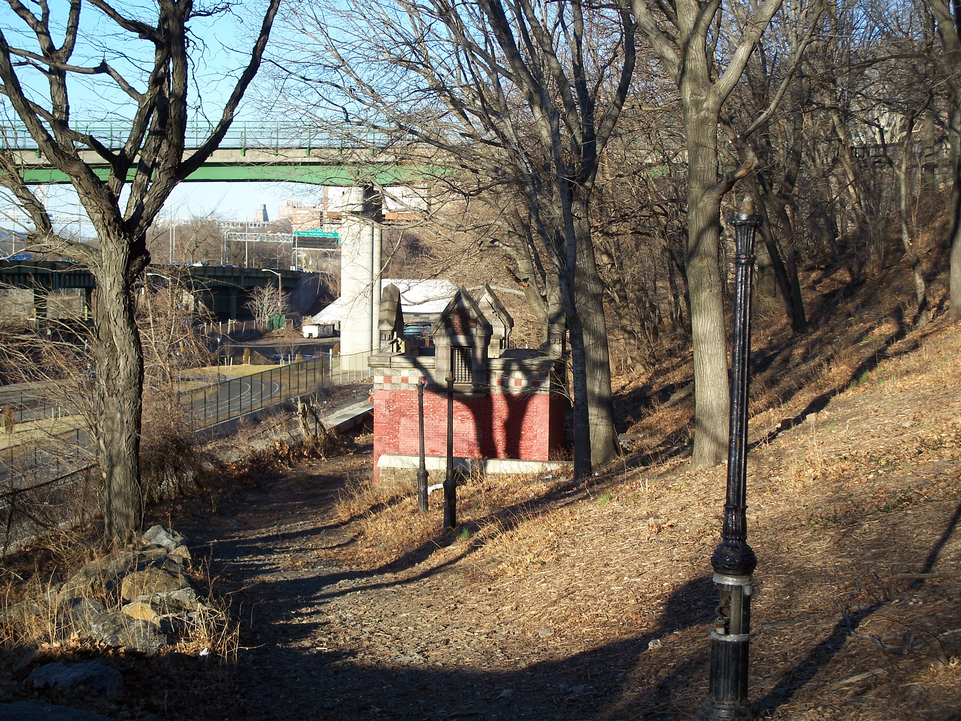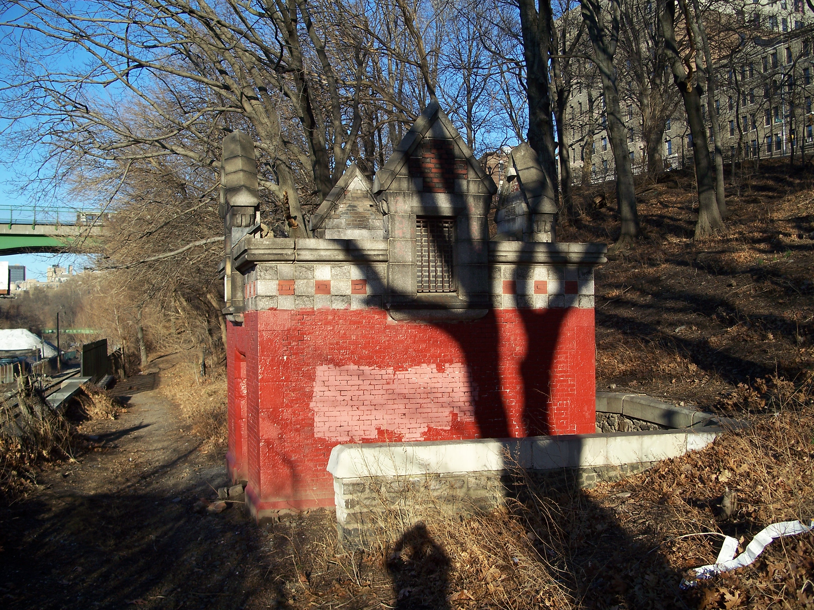 This roofless relic of a building sits between Riverside Drive and the train tracks at 143rd Street. I'm not sure what it was and cannot find any references to it on the web. It has no doors indicating that it was a comfort station and it may have been a storage or service building of some kind. From the architecture, it seems to pre-date the 1934 improvement of the park and likely is from the late 19th or early 20th century.