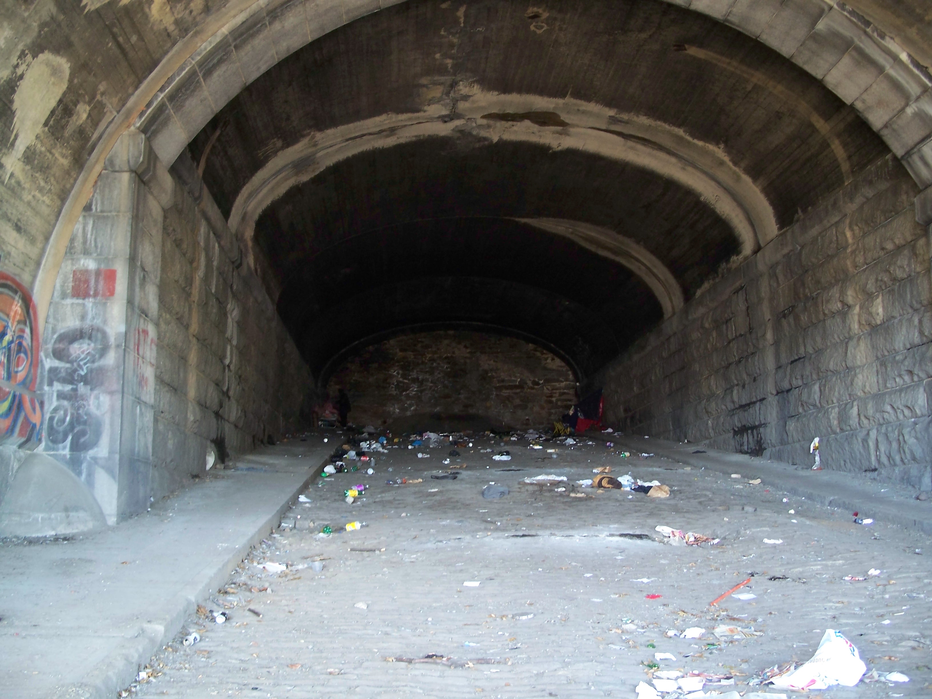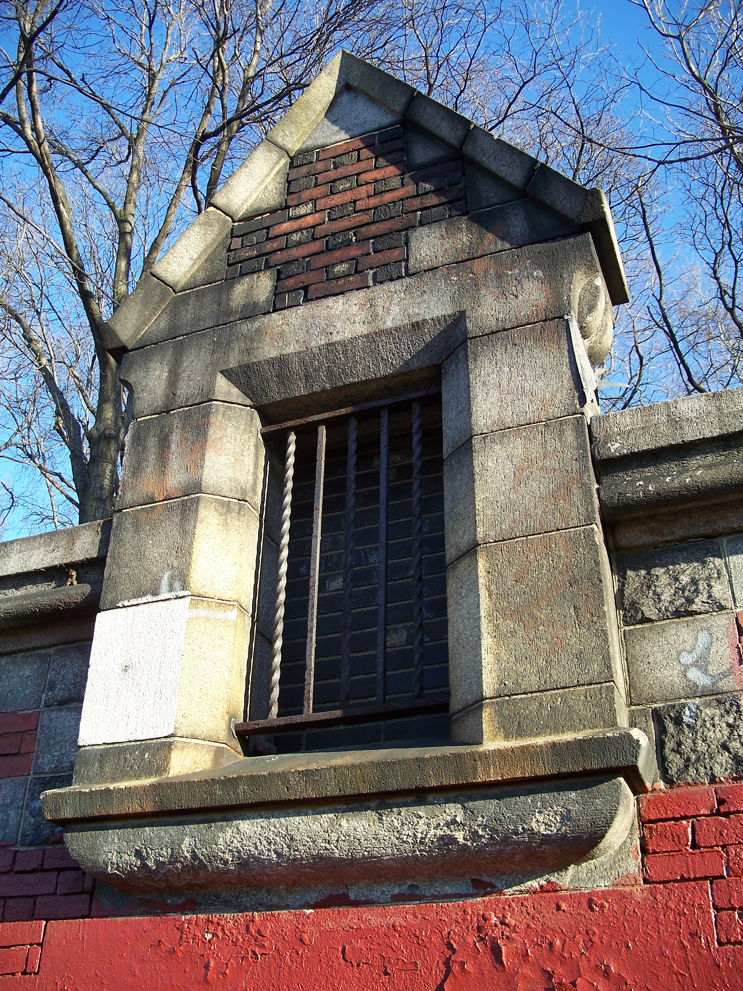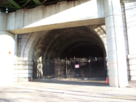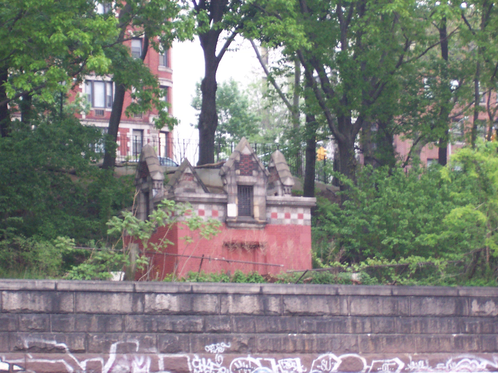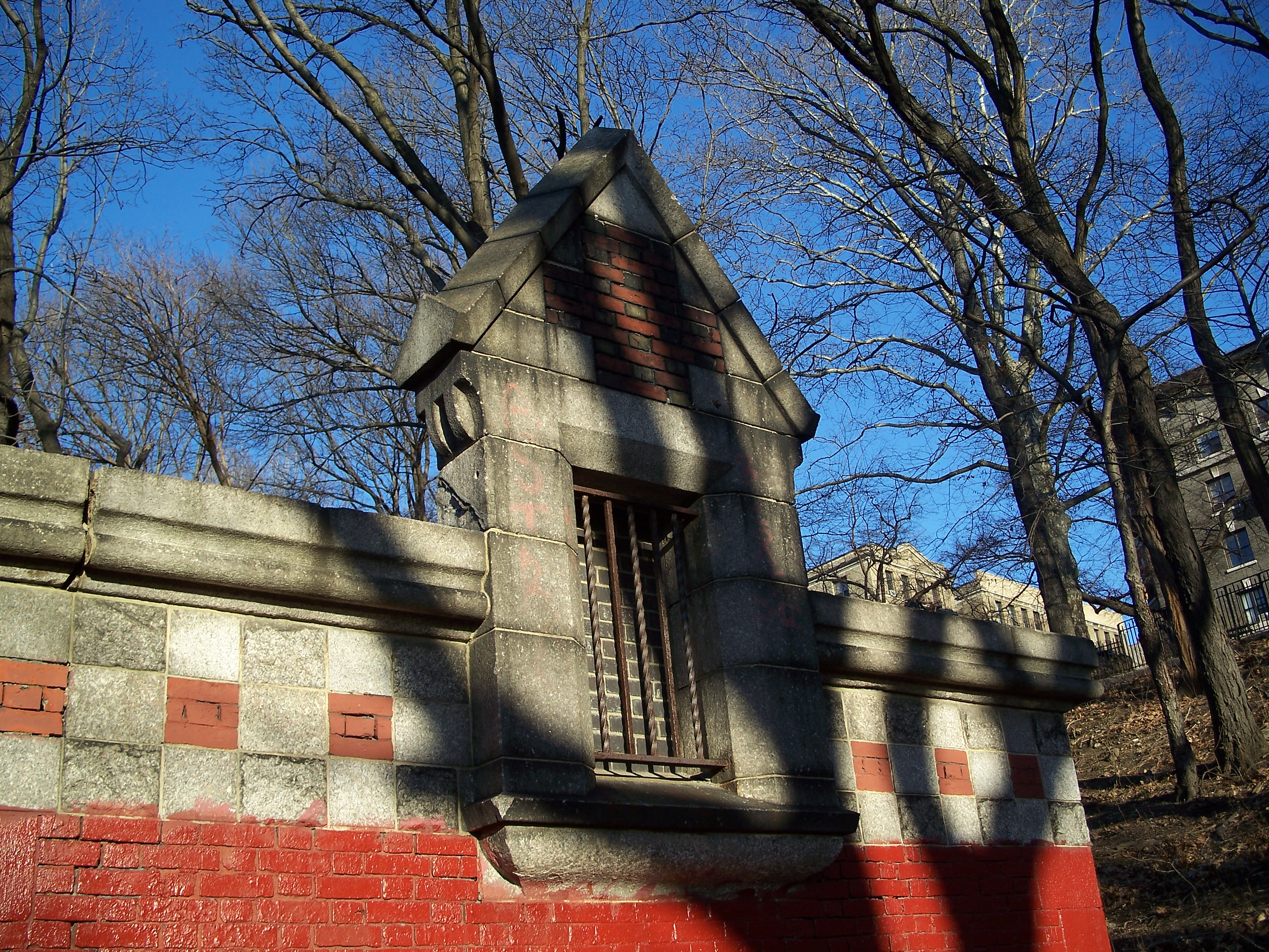 This roofless relic of a building sits between Riverside Drive and the train tracks at 143rd Street. I'm not sure what it was and cannot find any references to it on the web. It has no doors indicating that it was a comfort station and it may have been a storage or service building of some kind. From the architecture, it seems to pre-date the 1934 improvement of the park and likely is from the late 19th or early 20th century.