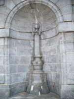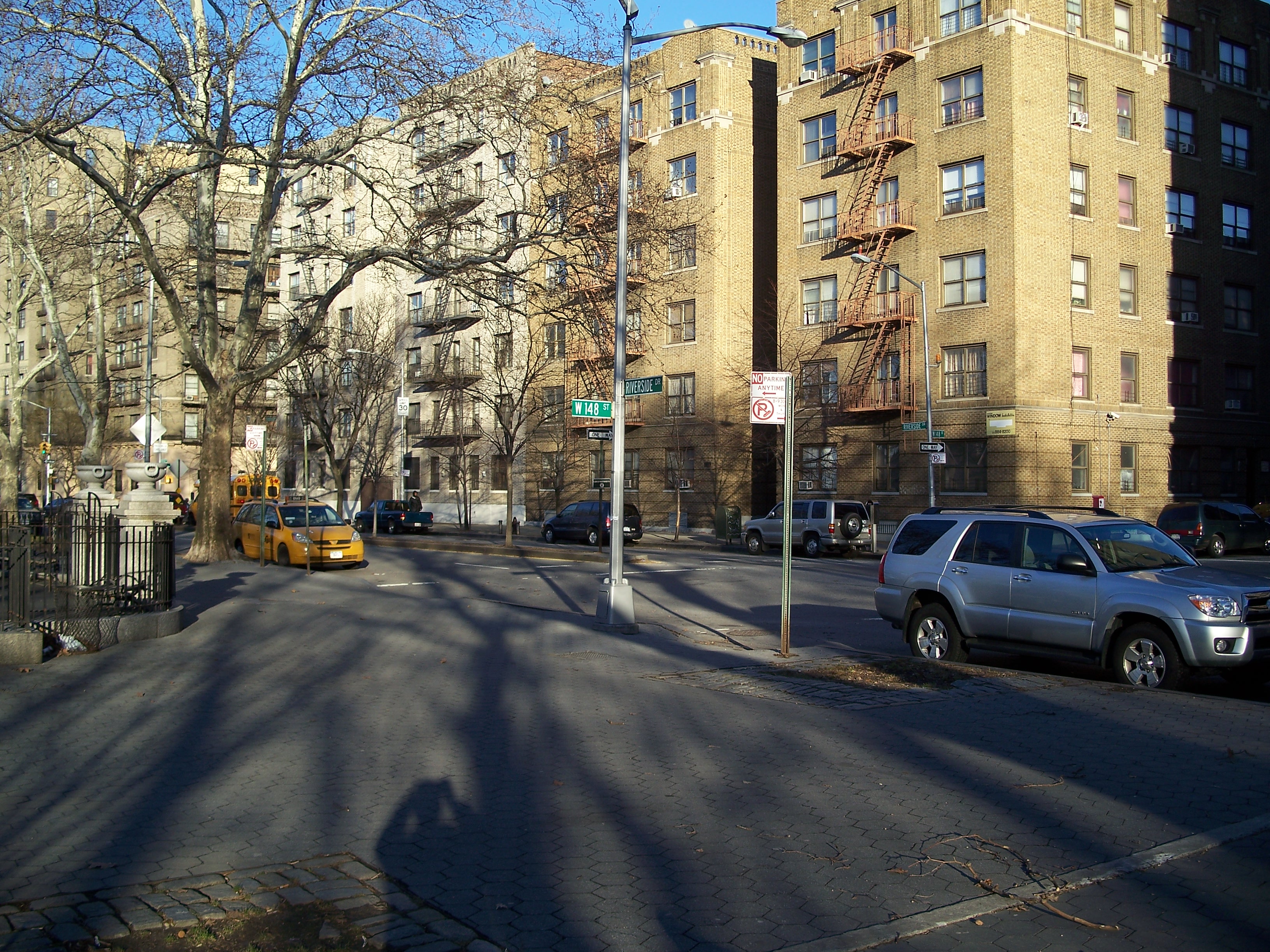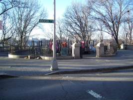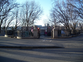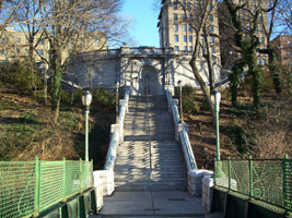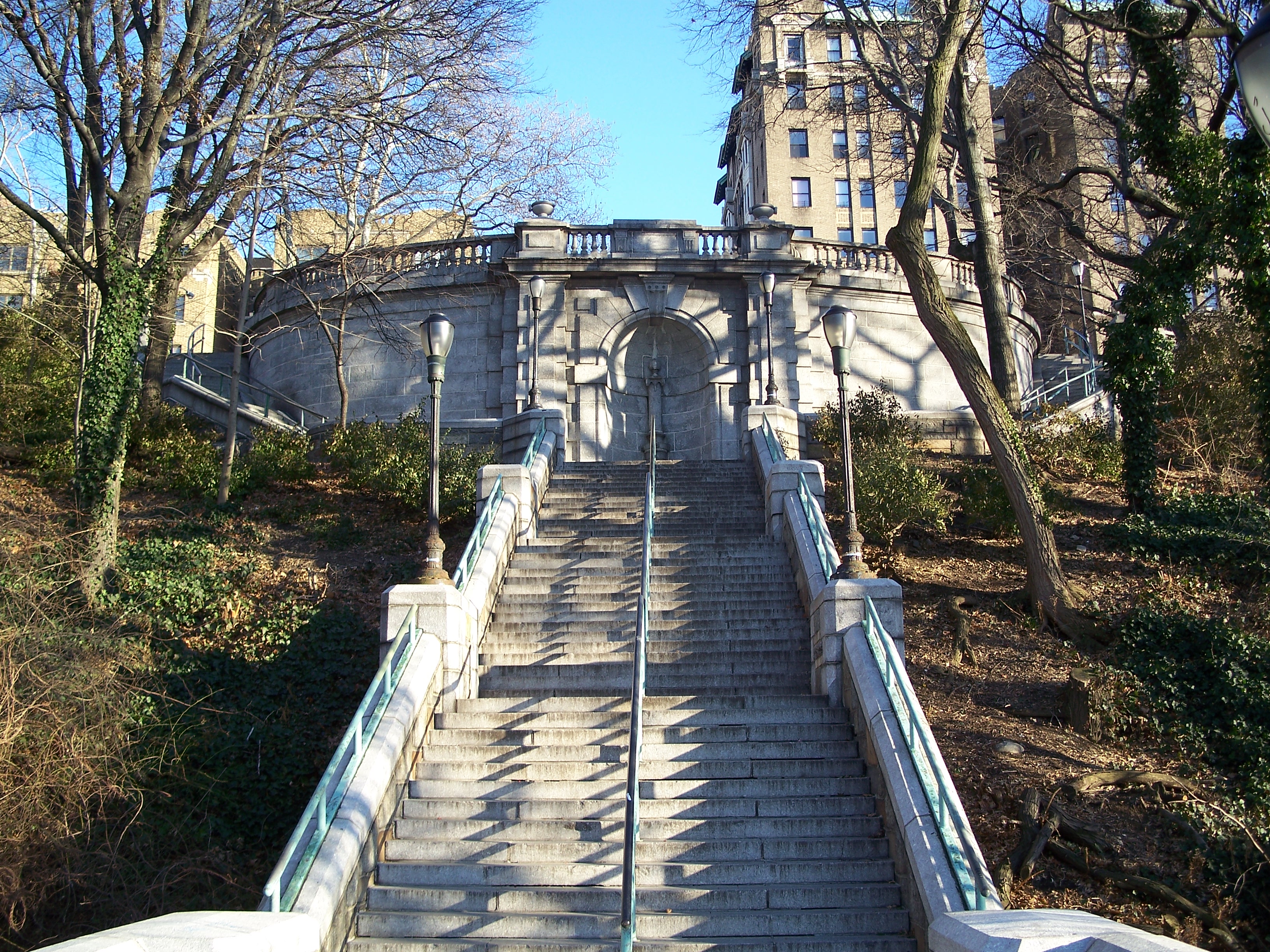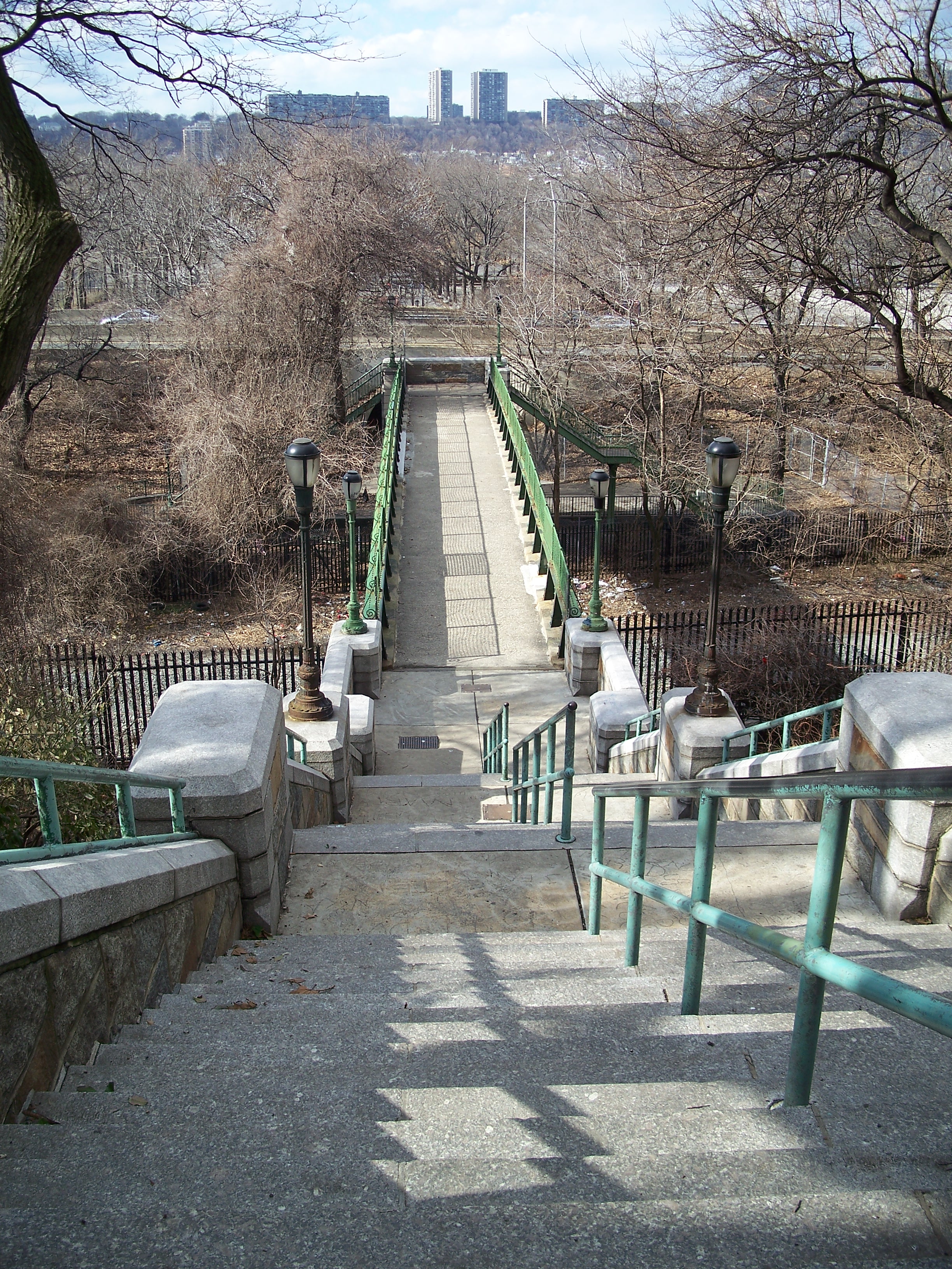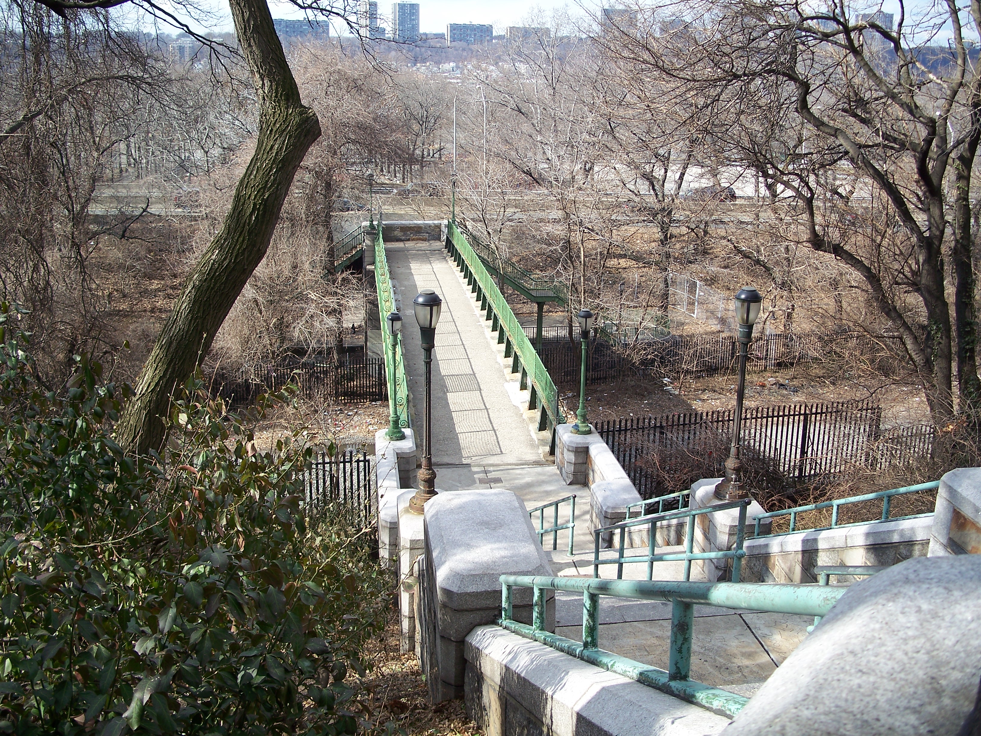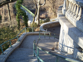This ornate limestone staircase at 148th Street carries pedestrians down to a bridge over the railroad tracks to ballfields in the northern part of Riverside Park. The bridge probably dates from the 1934 improvement but the staircase is likely from somewhat earlier, although this area of the riverfront was likely much different when the staircase was build.