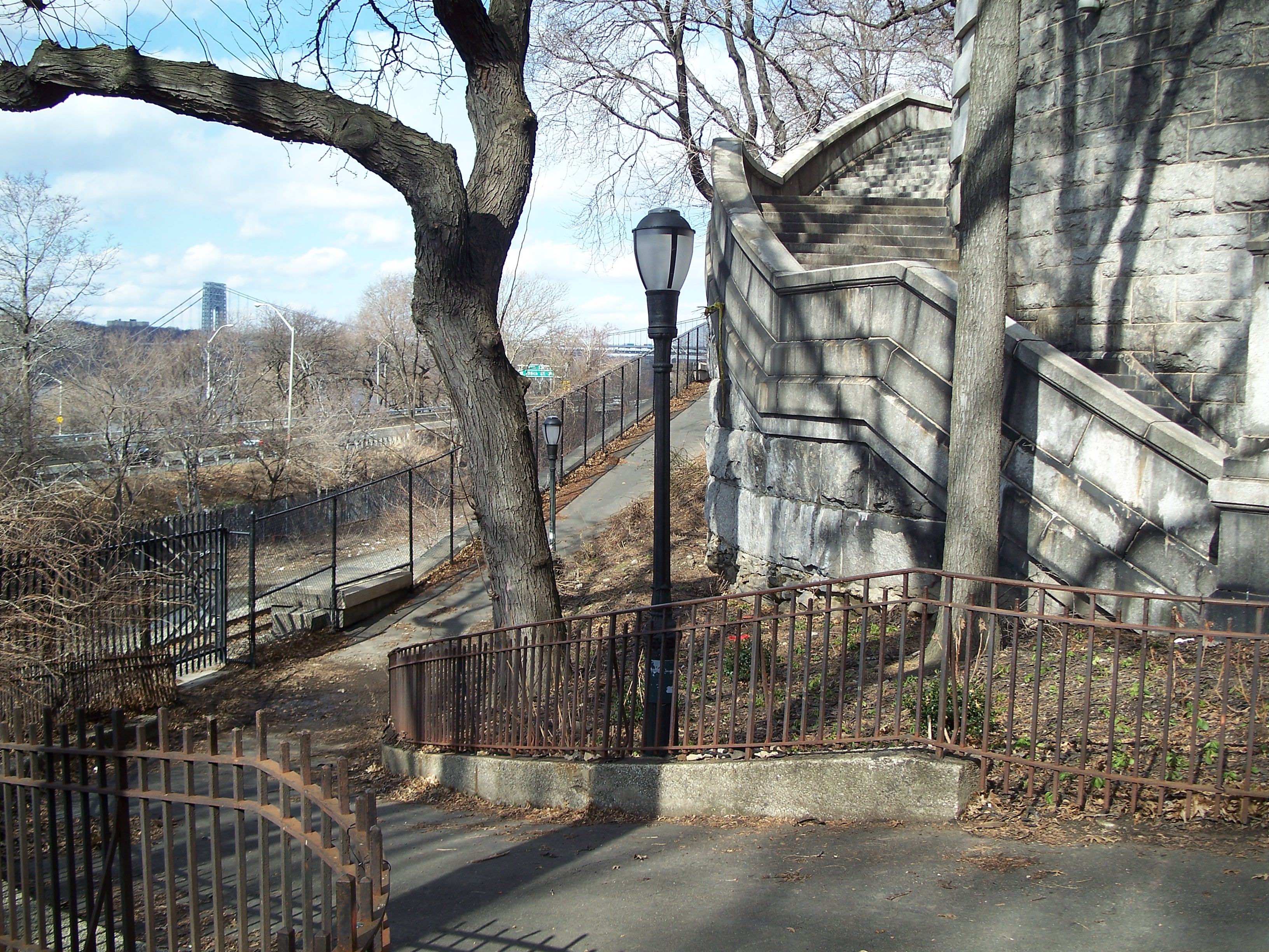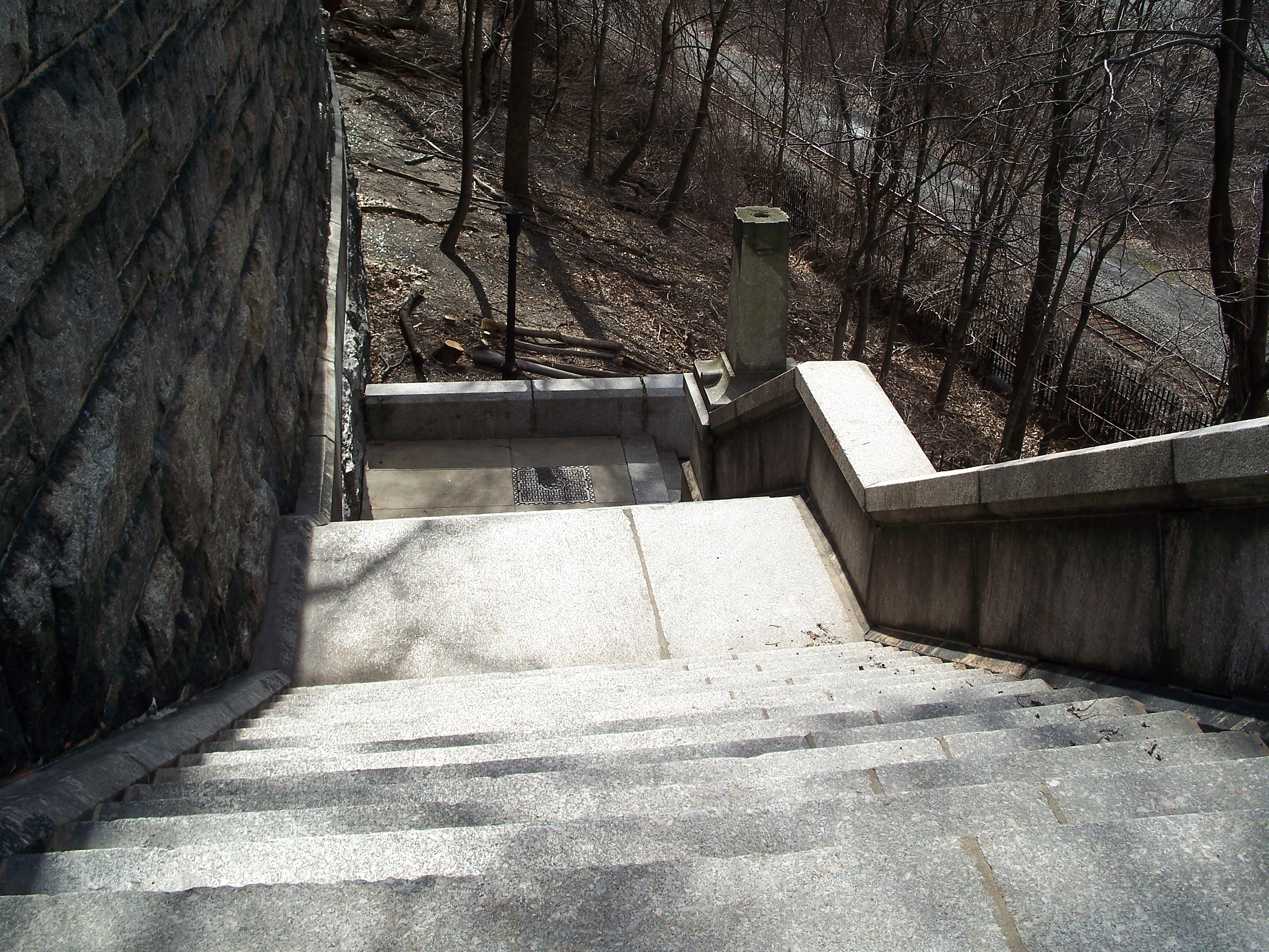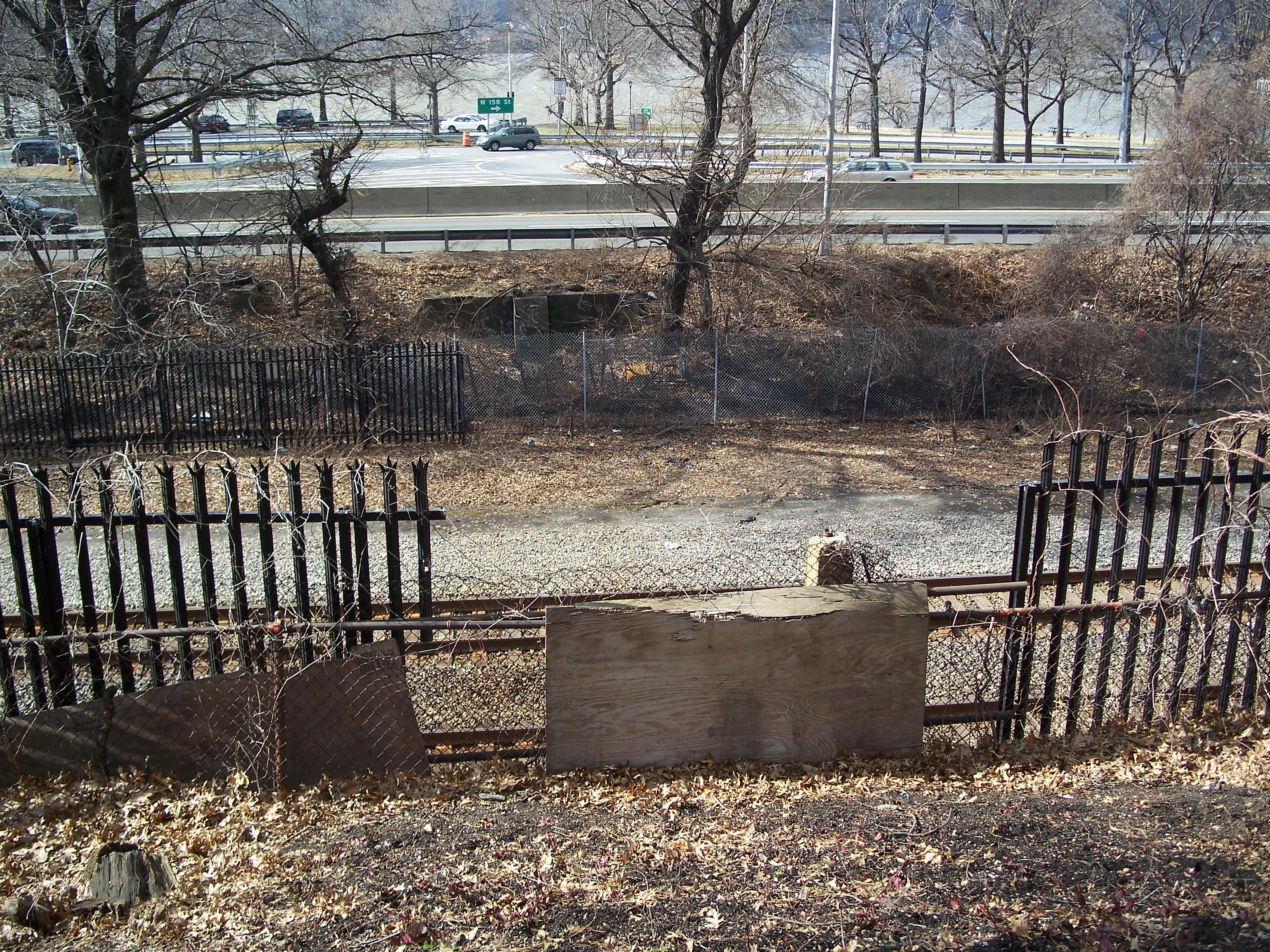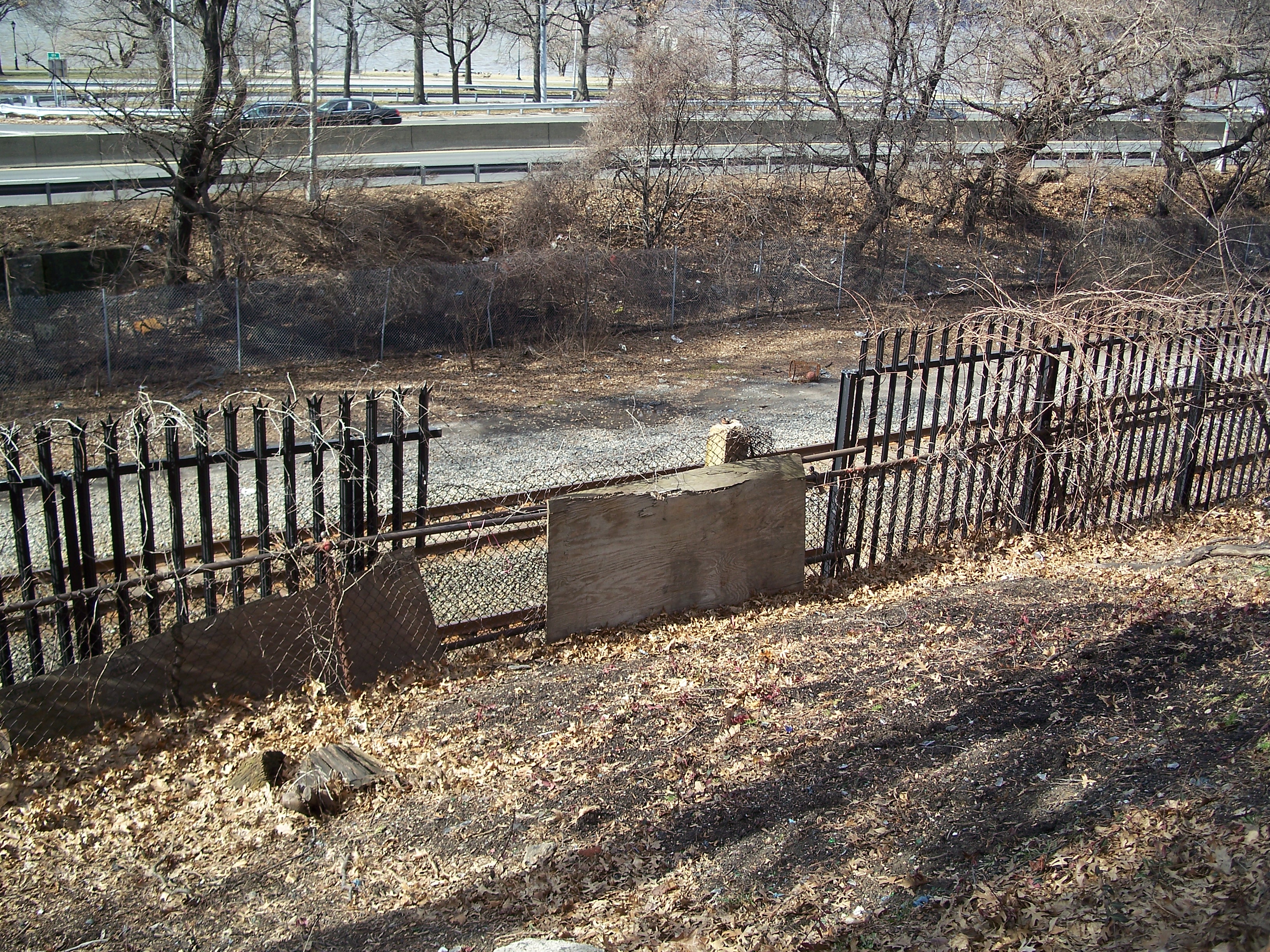 This ornate overlook and staircase structure also used to be the location of a gantry over the railroad tracks. It may have been a pedestrian bridge prior to the 1934 park improvement, but it only served to carry some conduit over the tracks when I visited in the Spring of 2005. When I returned in 2008, it was gone.