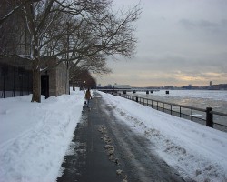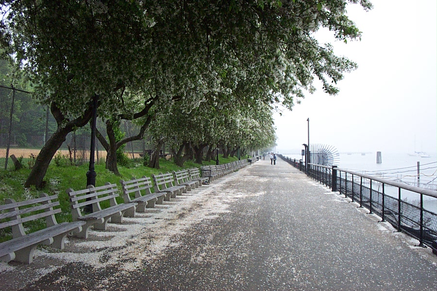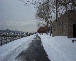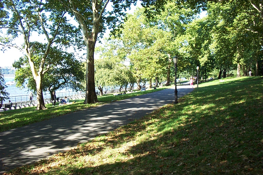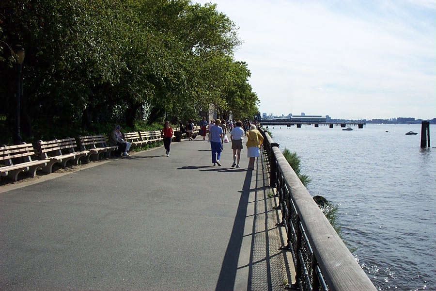 The narrow river walk separating the river from the West Side Highway is an area for biking and walking. A decade ago the effluent from factories and cities further upstream made the Hudson river a sewer. The closing of the factories and improvements mandated by the Clean Water Act brought life back to the Hudson.