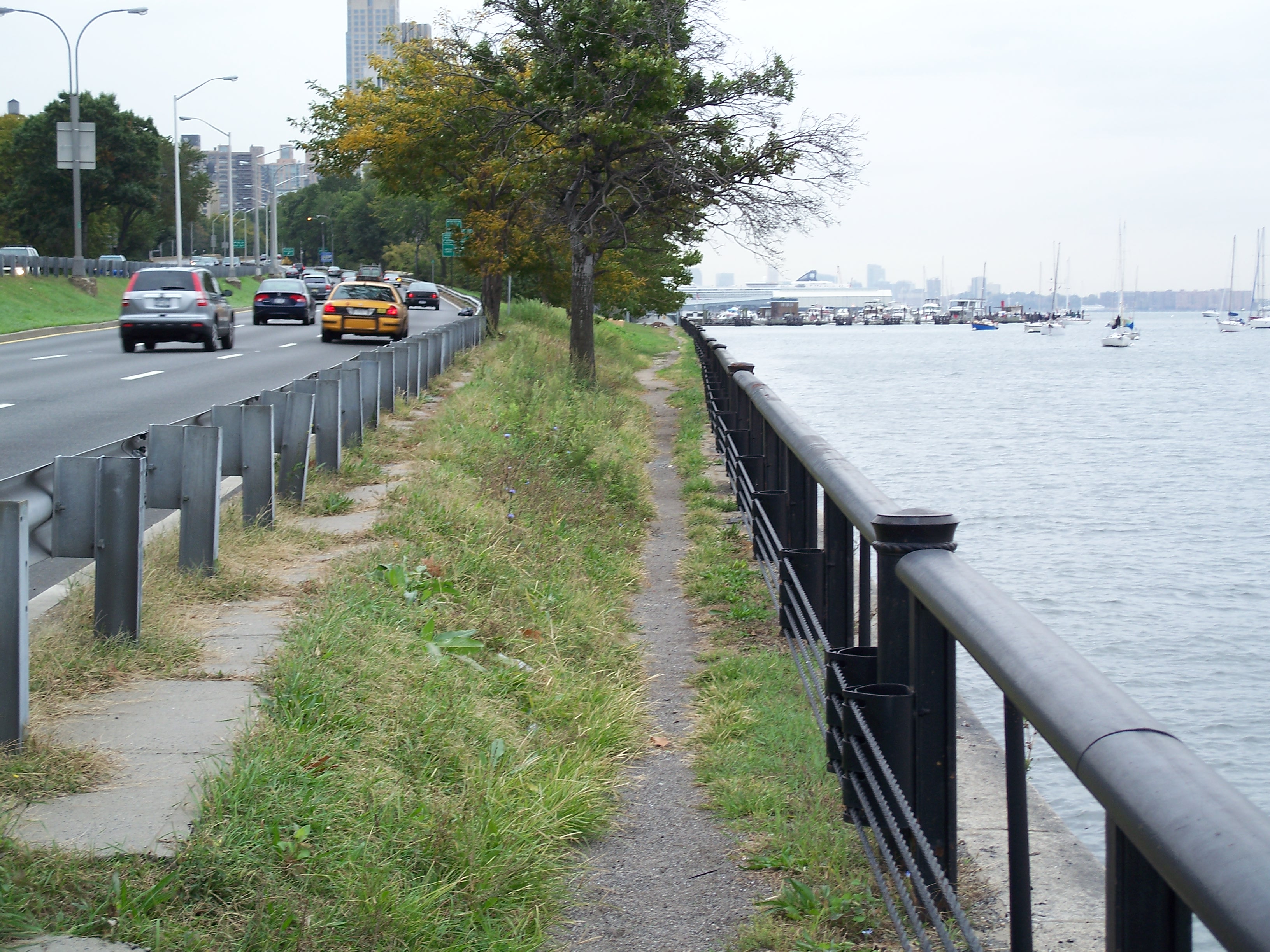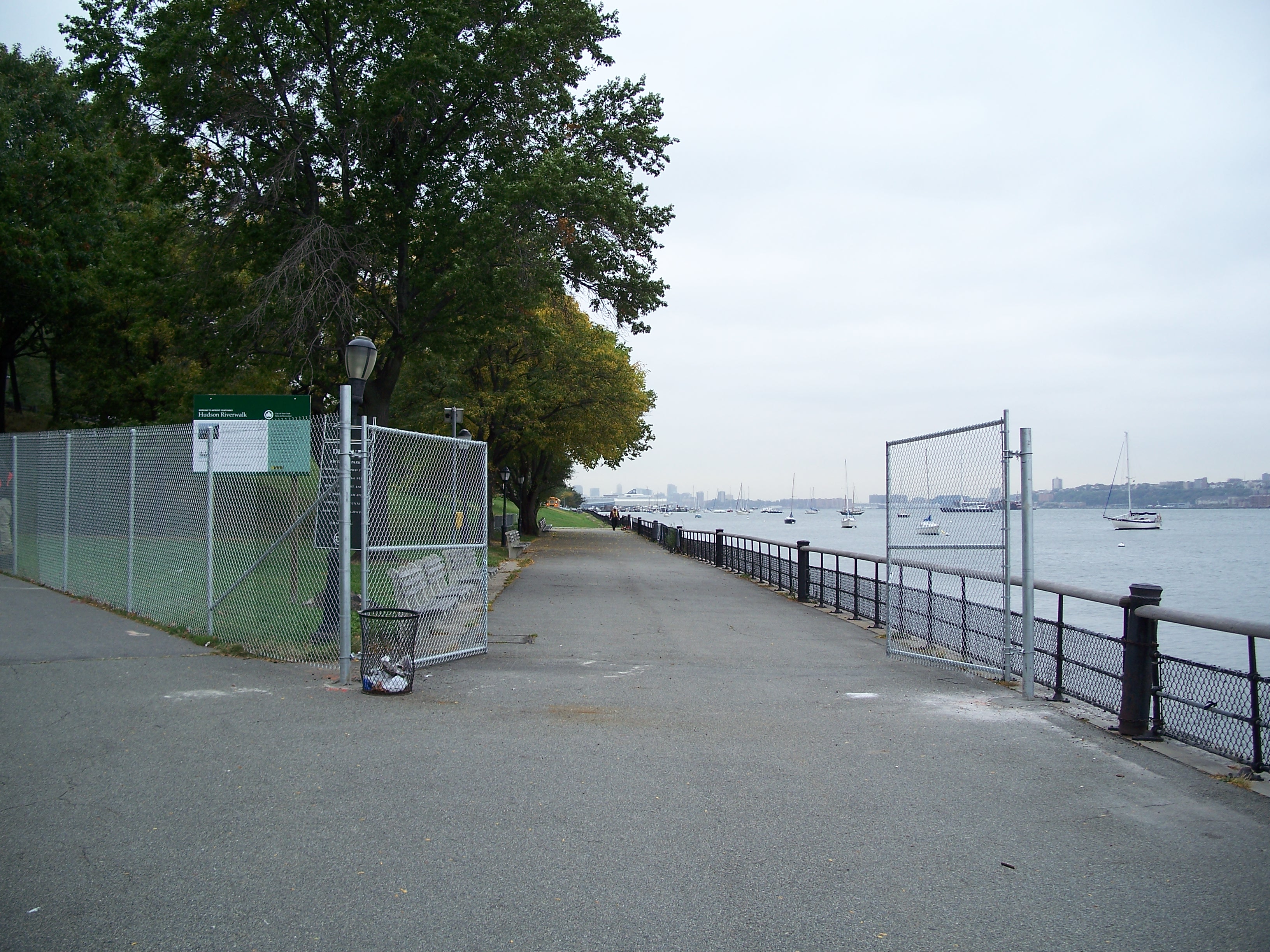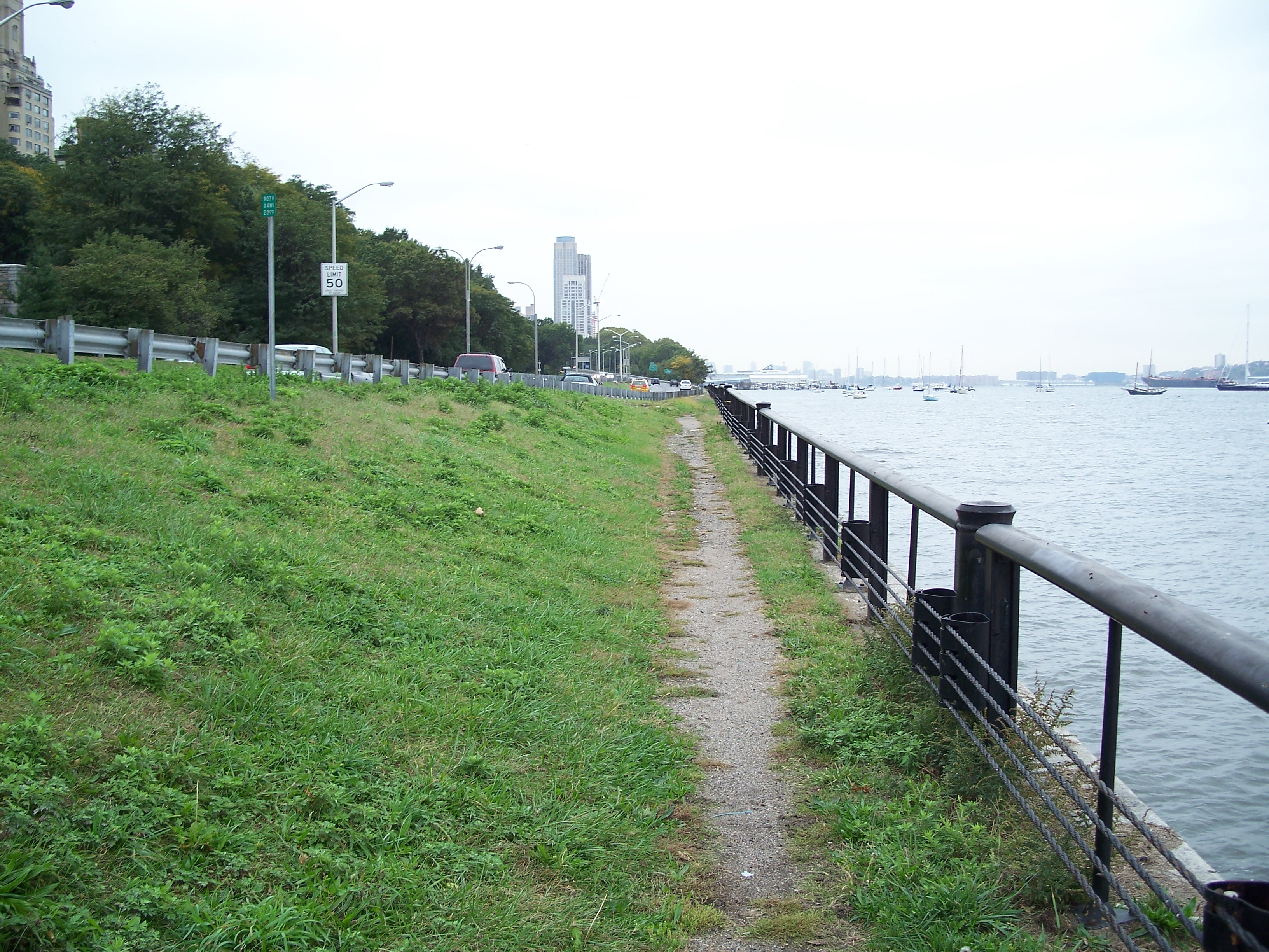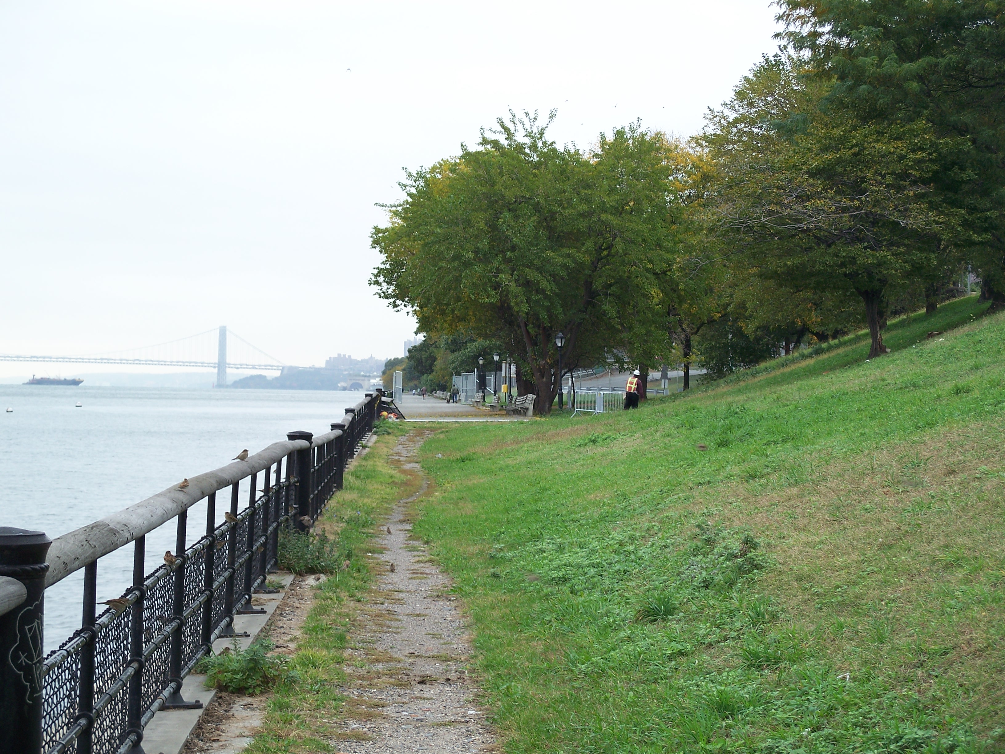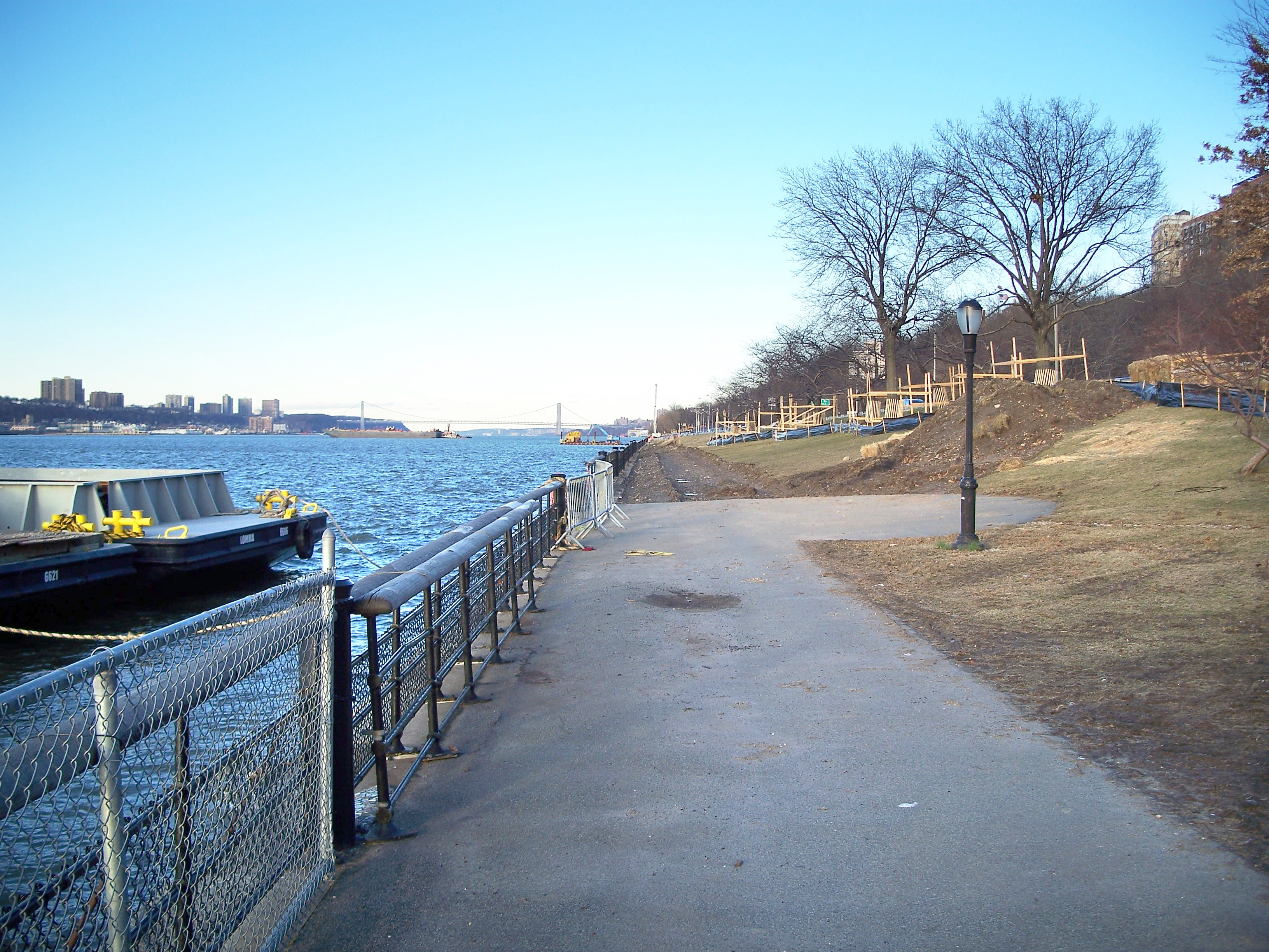This section of the Hudson riverfront had long been an odd gap in the greenbelt surrounding Manhattan. While there were lovely esplanades just to the south and the north, the placement of the railroad tracks away from the cliffs forces the Henry Hudson Parkway almost flush with the Hudson River, leaving only a narrow walkway for pedestrians. For years, this area had been minimally maintained with signs to the south and north warning pedestrians to cross under the parkway and use the esplanade that is built over the railroad tracks to the east.