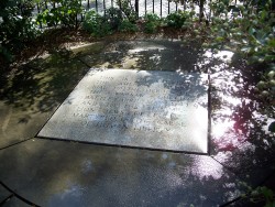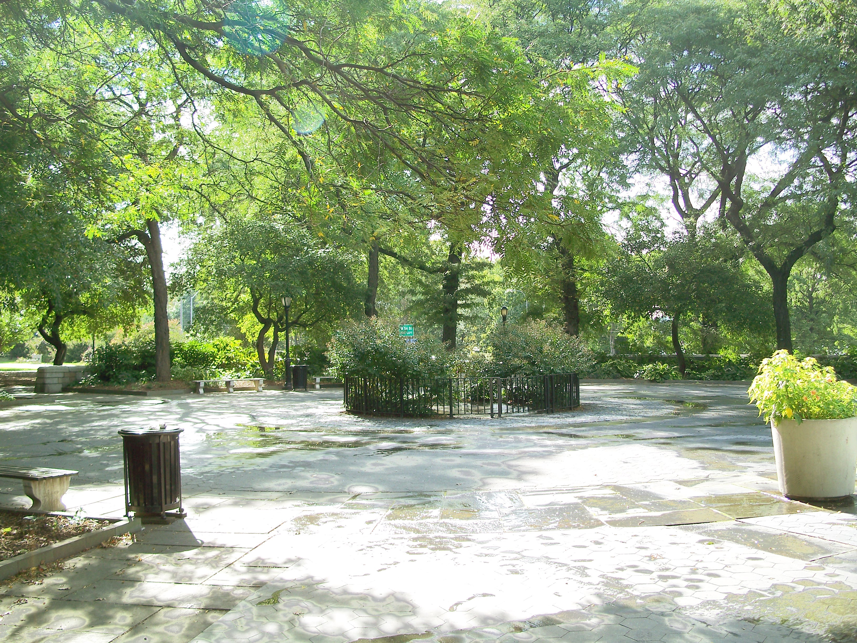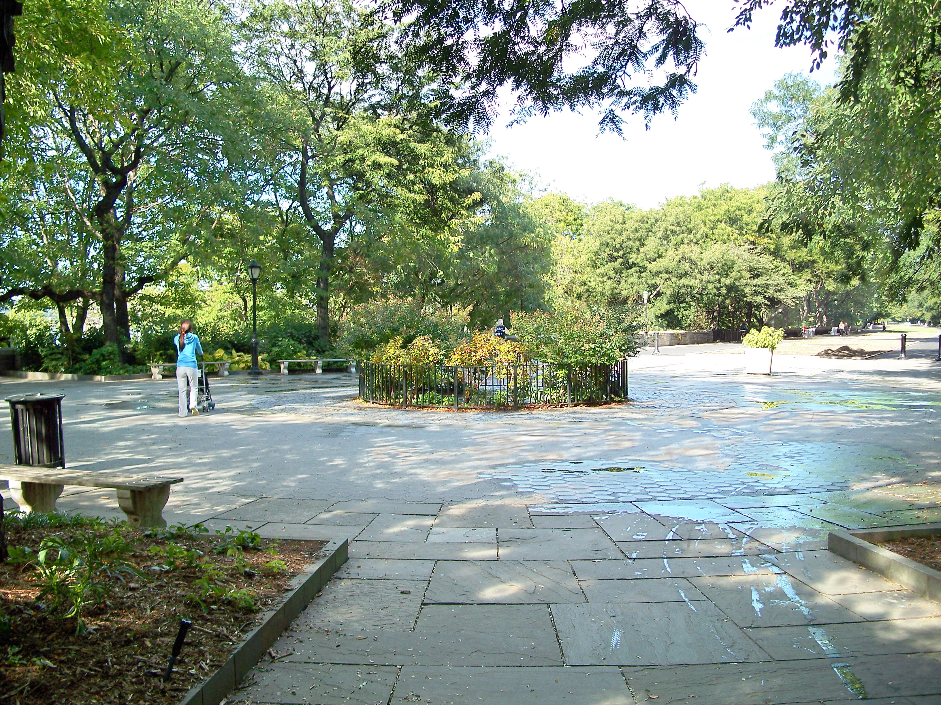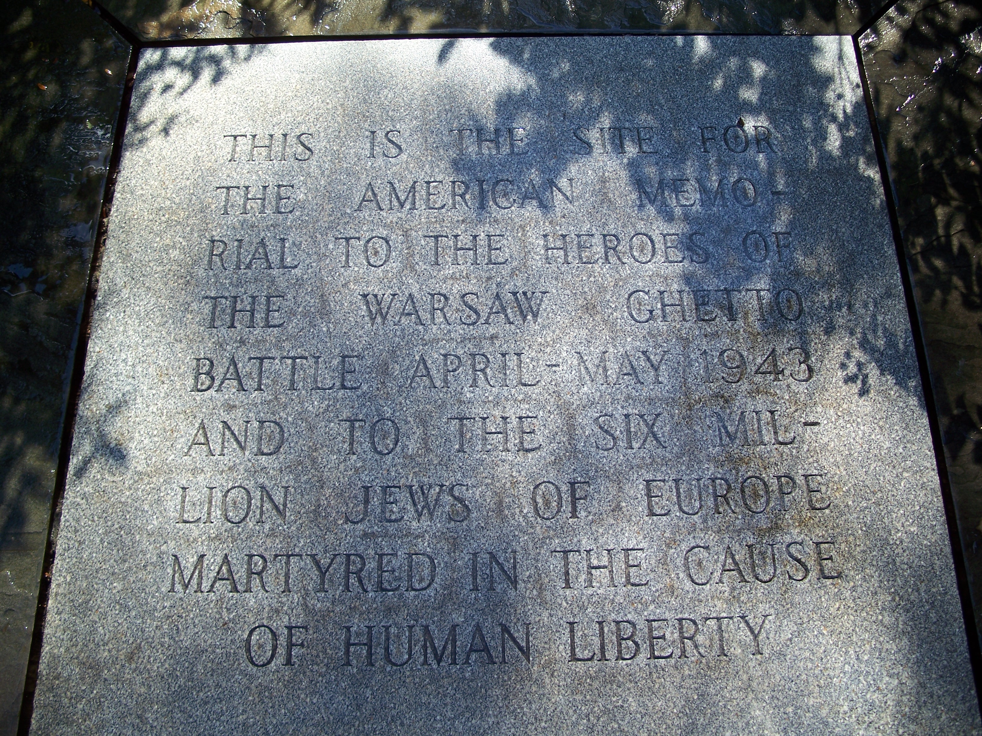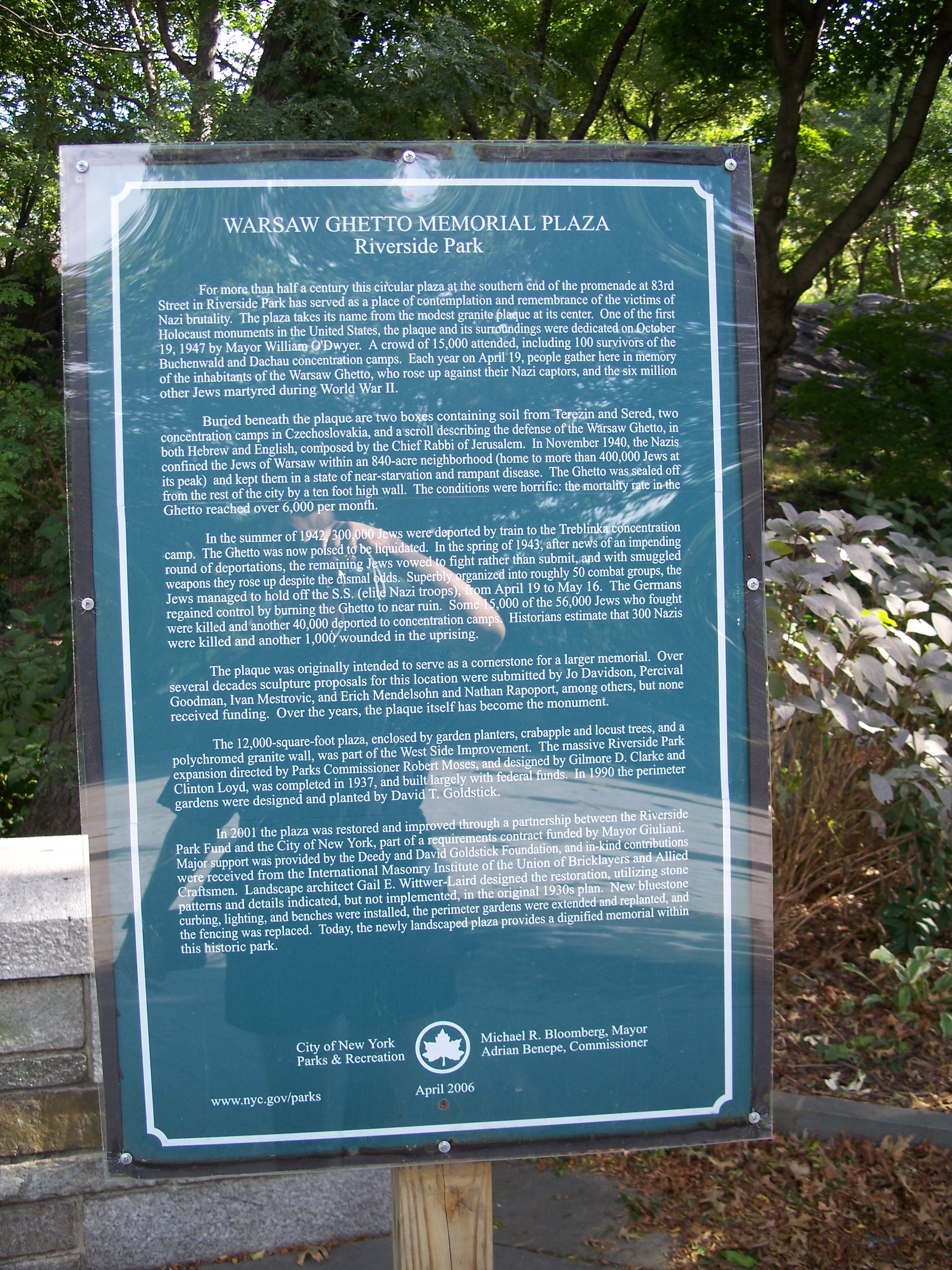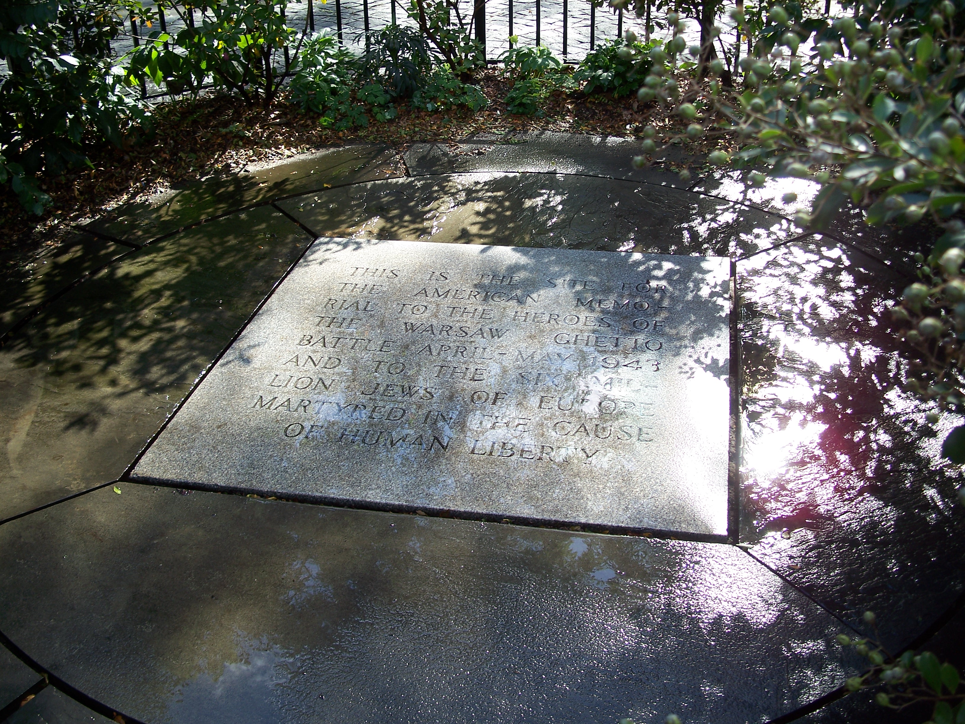 A little over four years later, on Sunday, October 19, 1947, a cornerstone was dedicated at this site in Riverside Park for a memorial to the victims of the Warsaw Ghetto Uprising. However, two subsequent designs were rejected by the New York City Art Commission as inappropriate for the park. With public support for the monument waning over the years, it appears that the only memorial that will ever get built will be this buried cornerstone surrounded by a low iron fence. (reference)