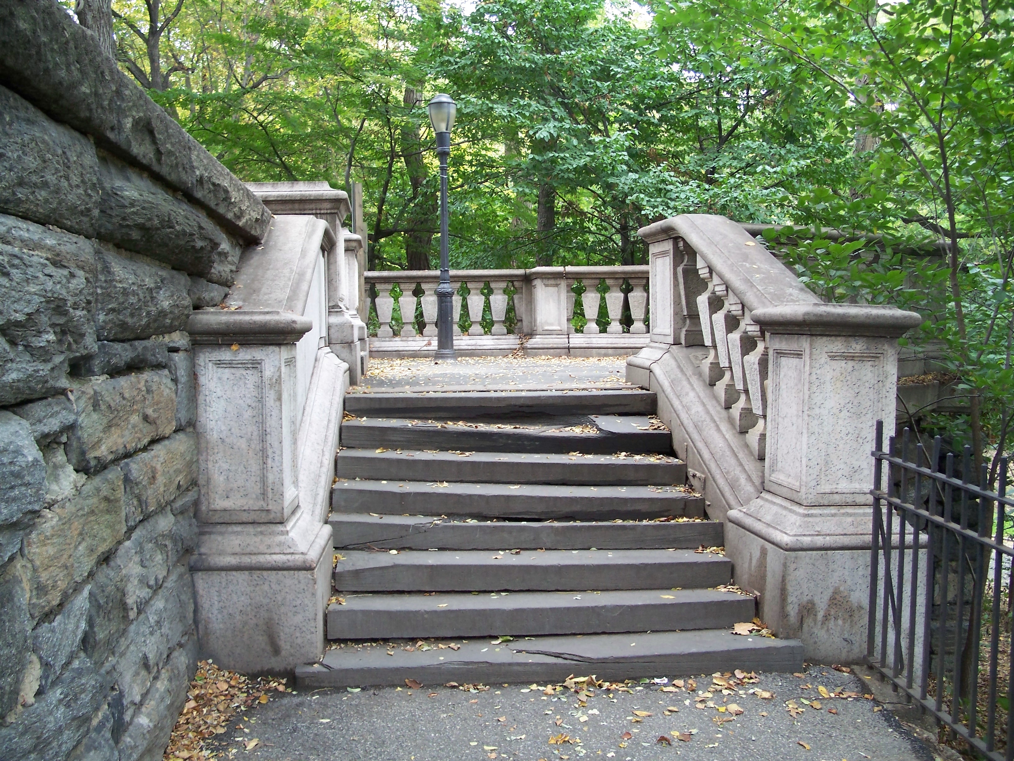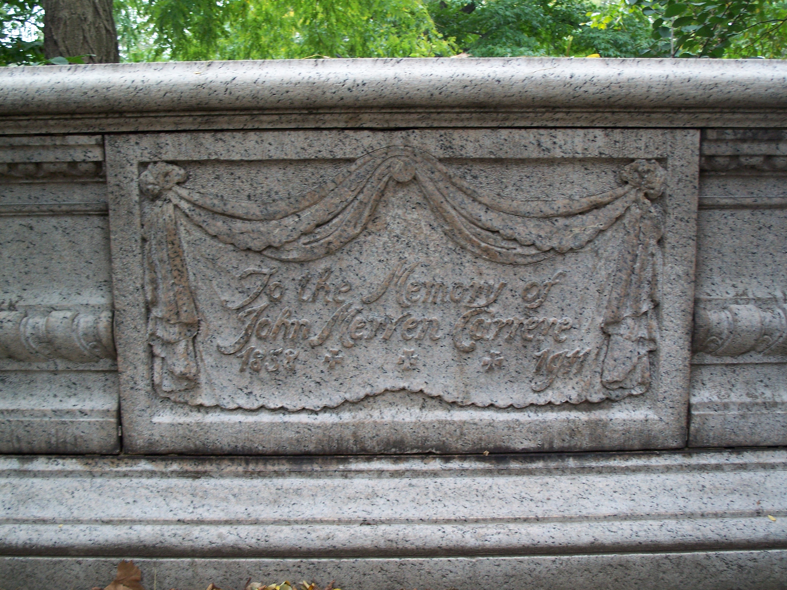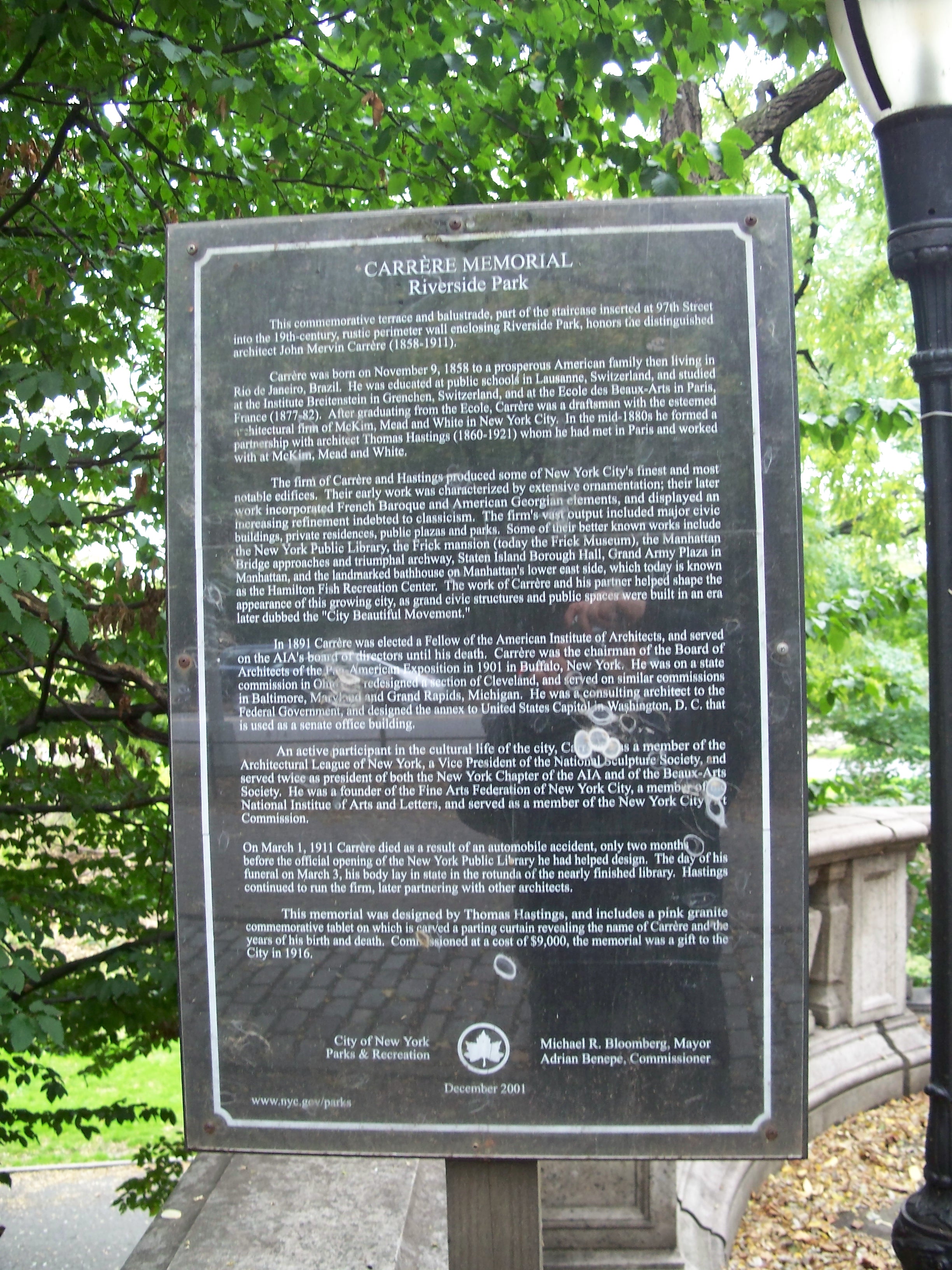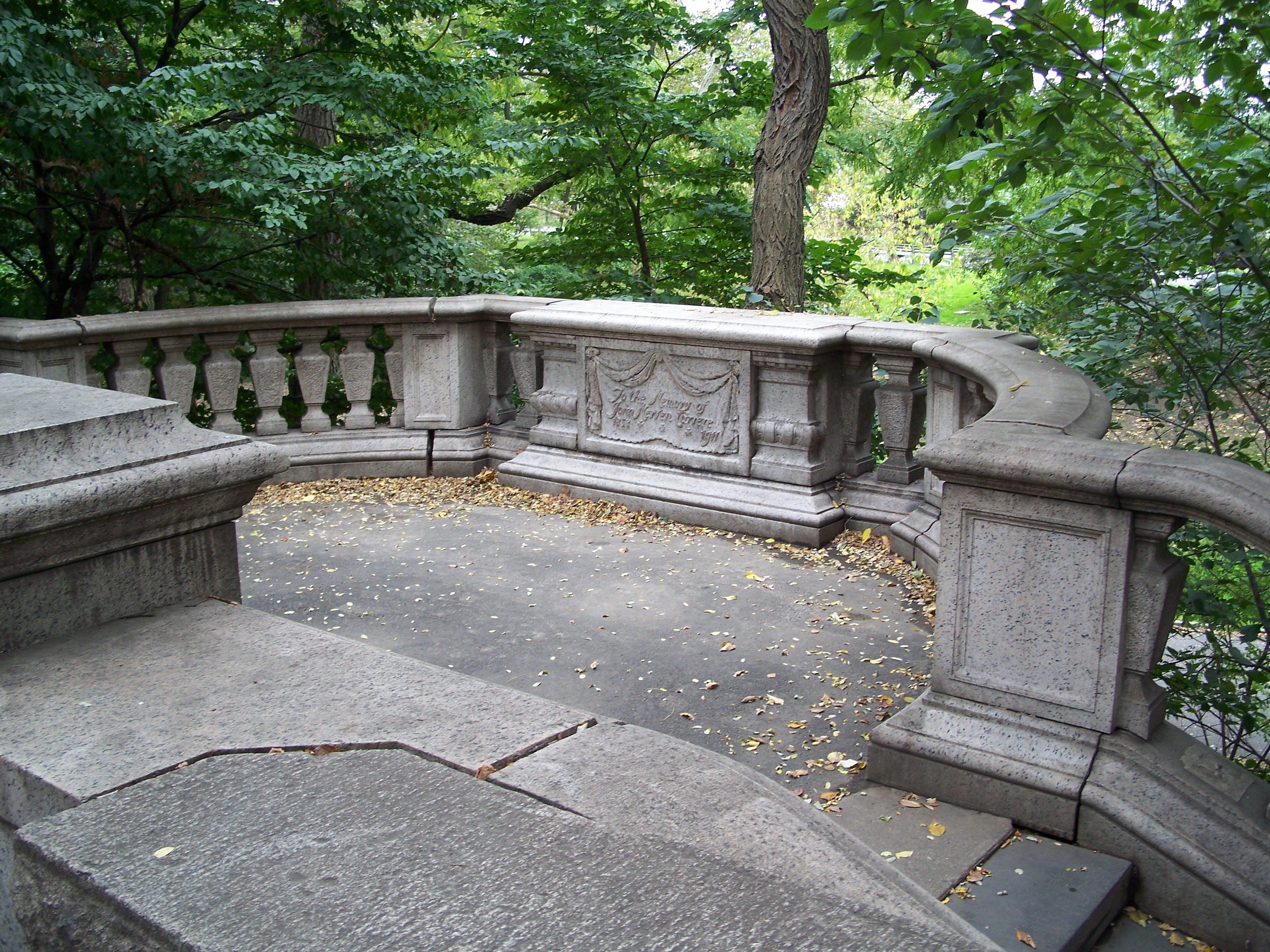 This terrace and balustrade are a monument to architect John Mervin Carrere (1858 - 1911), who with his partner, Thomas Hastings (1860 - 1921), created a large number of major private and public structures during the "City Beautiful" movement at the turn of the 20th century. Well known extant works include the New York Public Library, the Manhattan Bridge approach, the Frick mansion and the current Hamilton Fish Recreation Center. Carrere was killed in an auto accident in 1911, just before the opening of the NYPL, and this memorial was a gift from Hastings to the city in 1916.