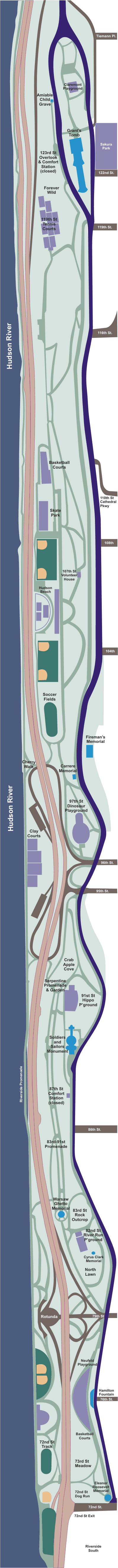 Hudson RiverRiverwalk 72nd - 79th St.72nd Street Dog Run72nd Street Eleanor Roosevelt Statue72nd Street Track72nd Street Underpass73rd Street Meadow74th Street Playground76th Street Barge76th Street Basketball CourtHamilton Fountain76th Street Neufeld Playground79th Street Boat Basin79th Street Interchange80th Street North Lawn83rd Street: Red-Tailed Hawks82nd Street Cyrus Clark Memorial82nd Street River Run Playground83rd-91st Street PromenadeHudson Riverwalk (83rd St. - 92nd St.)83rd Street UnderpassWarsaw Ghetto Memorial84th Street Rock Outcrop87th Street Comfort Station87th Street Dog Run89th Street Soldiers And Sailors MonumentCrab Apple Cove91st Street GardenWest 91st Street Marine Heroes Tablet91st Street Playground91st Street Serpentine PromenadeDriftwood Art: Hudson Riverfront 96th - 125th Street96th Street Bridge96th Street Clay Courts96th Street Interchange97th Street PlaygroundCarrere Memorial100th Street Cherry Walk100th Street Firemans Memorial101st Street Soccer Fields106th Street Hudson Beach106th Street Mall107th Street Volunteer House108th Street Riverside Drive109th Street Skate Park111th Street Basketball Courts116th Street Overlook119th Street Tennis Courts120th Street Forever Wild120th Street StructuresGeneral Grant Memorial123rd Street Overlook123rd Street Sakura Park125th Street Amiable Child Monument125th Street Claremont Playground125th Street Riverside Drive Viaduct (BIN 2246660)125th Street West Harlem Piers135th Street Riverside Ramparts143rd Street Building148th Street Bridge151st Street Overlook and Gantry153rd Street Trinity Church CemeteryWindstorm - June 11, 2008