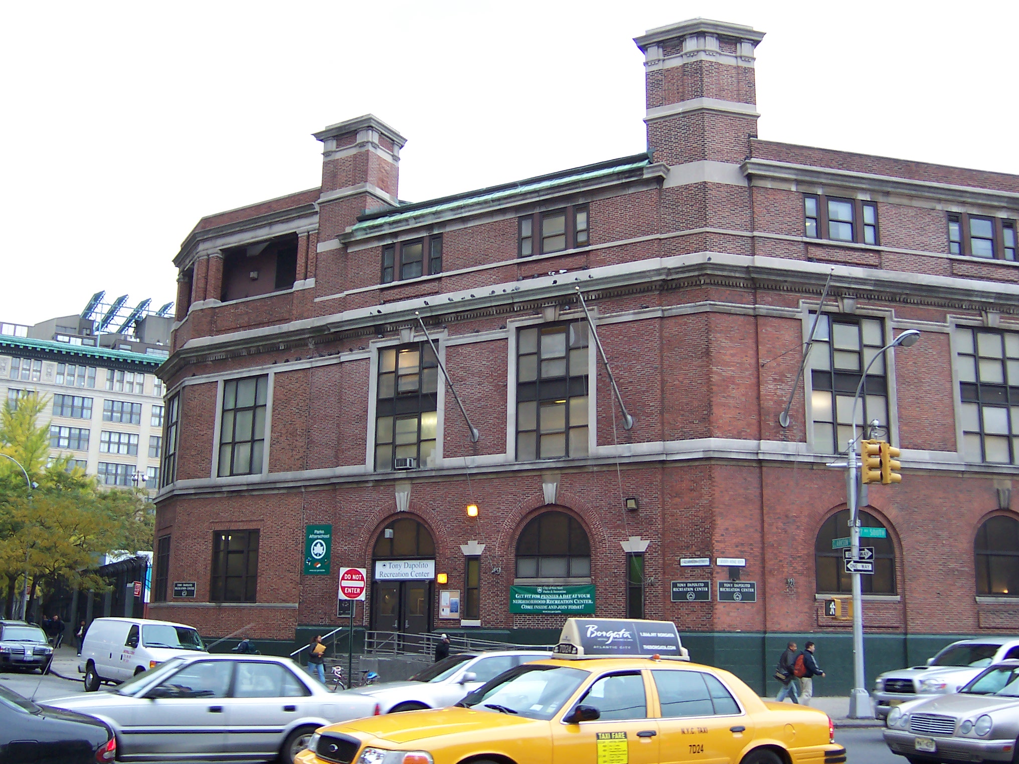 The building was designed by the firm of Renwick, Aspinwall and Tucker and featured showers and tubs on the first two floors, a gym on the third floor and an open air classroom for sickly children on the roof. The gym was updated in 1911 for weight-lifting and basketball. An indoor pool was added in 1920, altering the eastern facade. The Department of Parks assumed full jurisdiction over the bathhouse in 1938 and added an WPA-built outdoor pool in 1939. In 2004, the Carmine Recreation Center was renamed the Tony Dapolito Recreation Center after a neighborhood community board member and parks committee member who lead the successful battles to save Washington Square Park and the entire So Ho neighborhood from the ill-conceived highway plans of city planning despot Robert Moses. (historical sign)