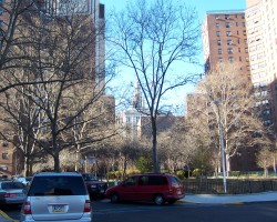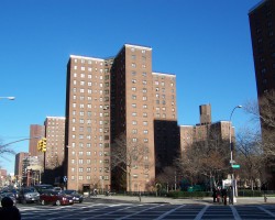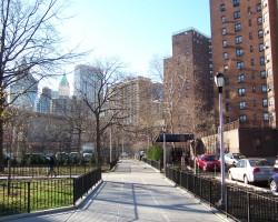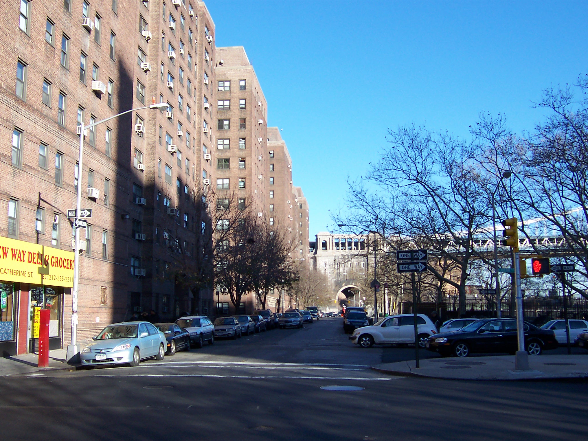 Just to the east of the former bath house site is Knickerbocker Village, which was built on five acres bounded by Catherine, Monroe, Cherry and Market streets to house around 4,000 people in a sequence of 12-story buildings clustered around two central courtyards. At the time it was completed in 1933, it was unusual for its scale and it presaged the urban renewal efforts of the 1950s and 1960s. The complex was built on the Lung Block, a squalid group of overcrowded tenements with one of highest rates of tuberculosis in the city. 386 poor, mostly-Italian families were evicted to clear space for this new middle-class housing complex, partially built with federal funds.