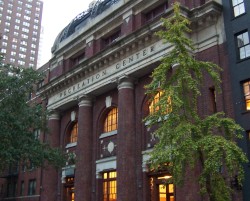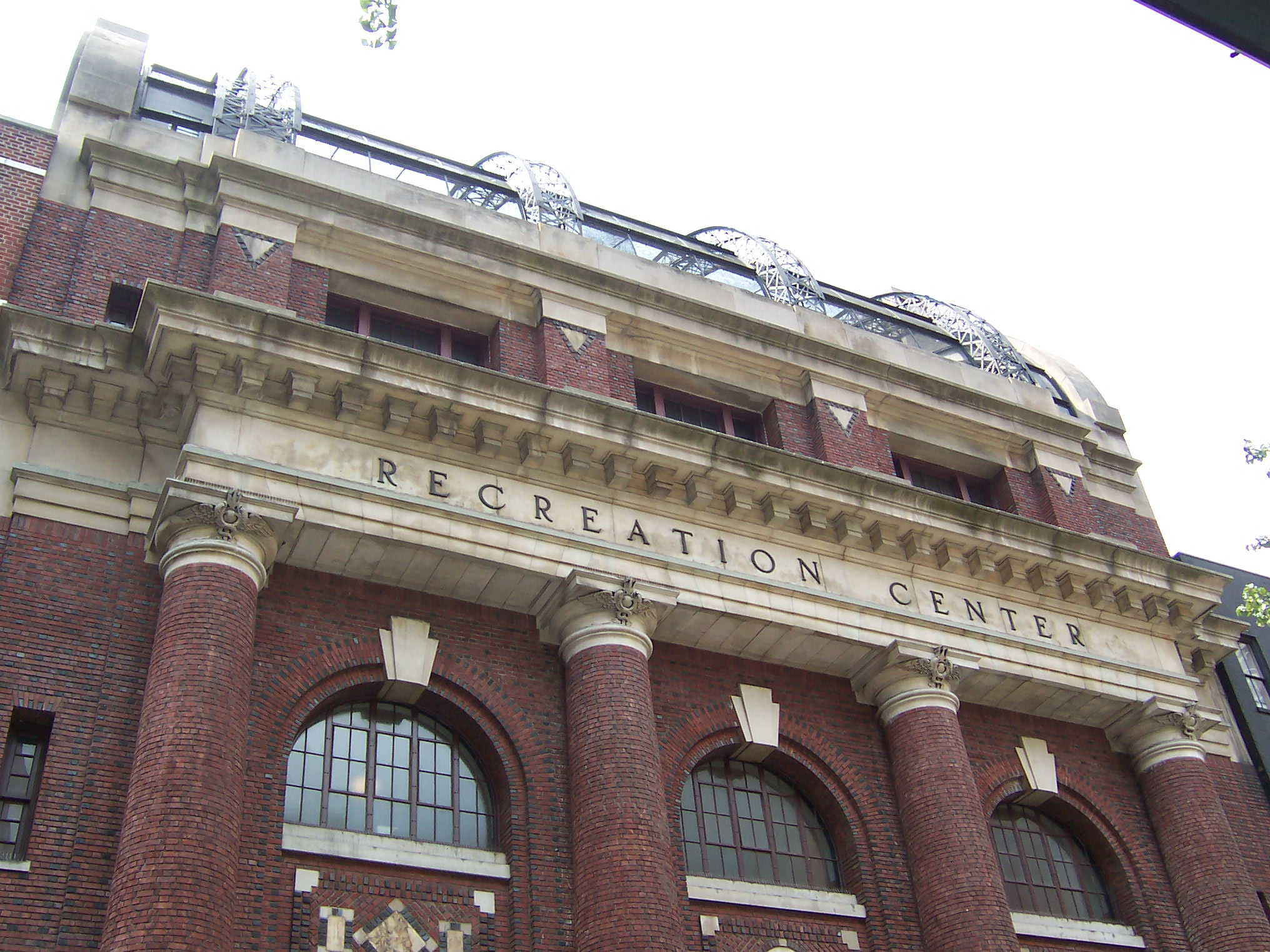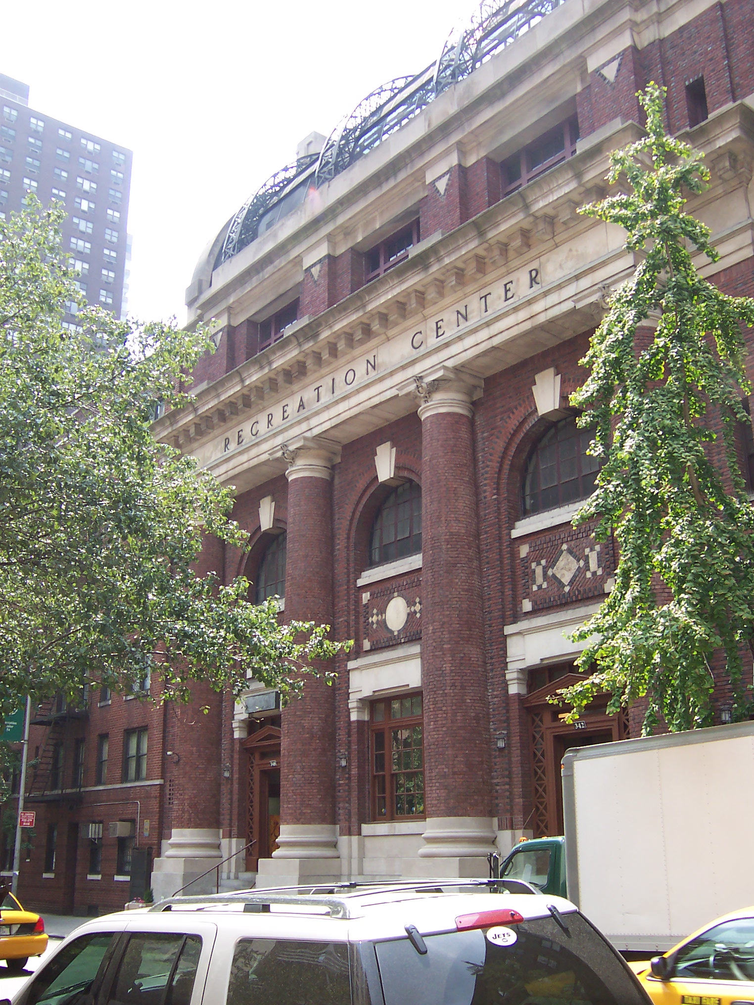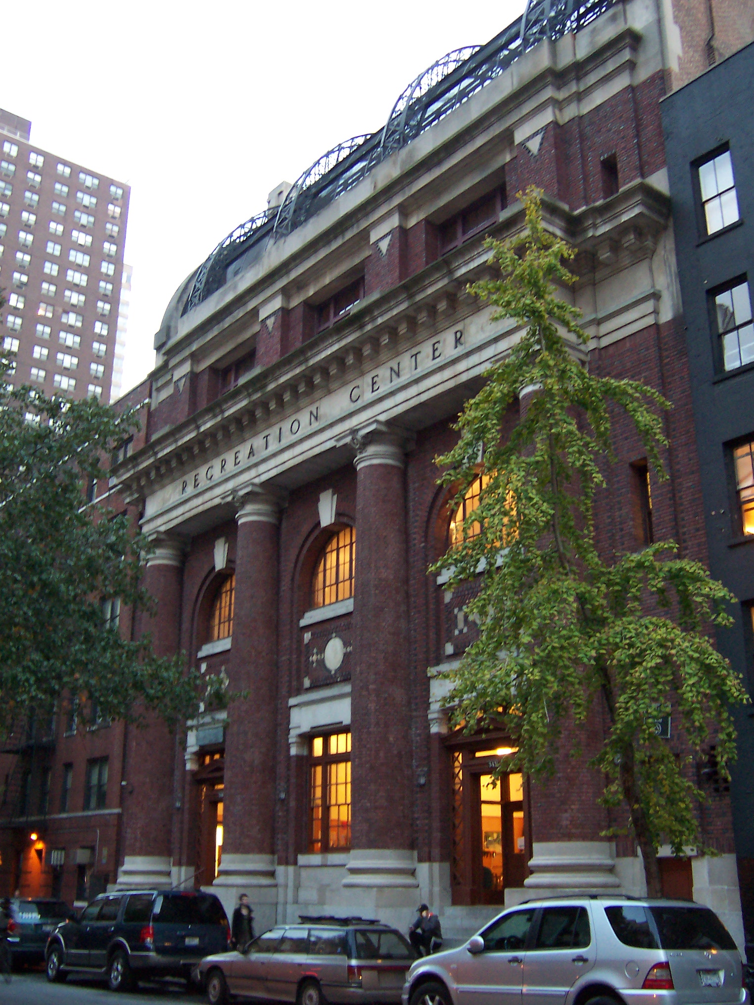The four-story neo-classical East 54th Street Public Baths and Gymnasium opened with 79 showers for men and 59 for women as well as a gymnasium, and rooftop playground. A 54 x 17 swimming pool was added in 1915. (historical sign)