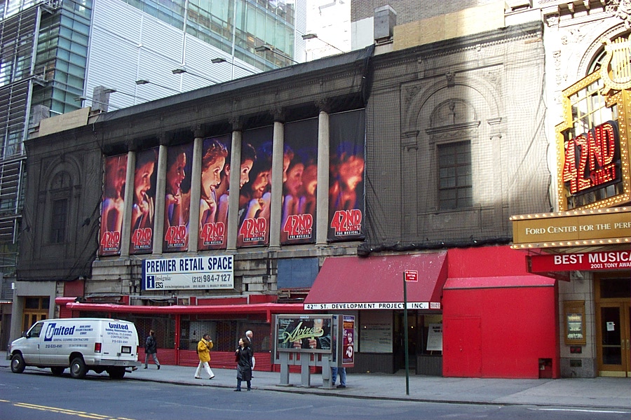 Converted to movie theatre in 1933. Notable productions include Strike up the Band (1930), Private Lives (1931). As of this writing, the Times Square is the last of the 42nd Street theatres that still needs redevelopment. The theatre supposedly got tied up in the bankruptcy of the Livent production company and plans for an Ecko Unlimited store that would preserve much of the theatrical interior fell through in 2007. Other curious plans followed.