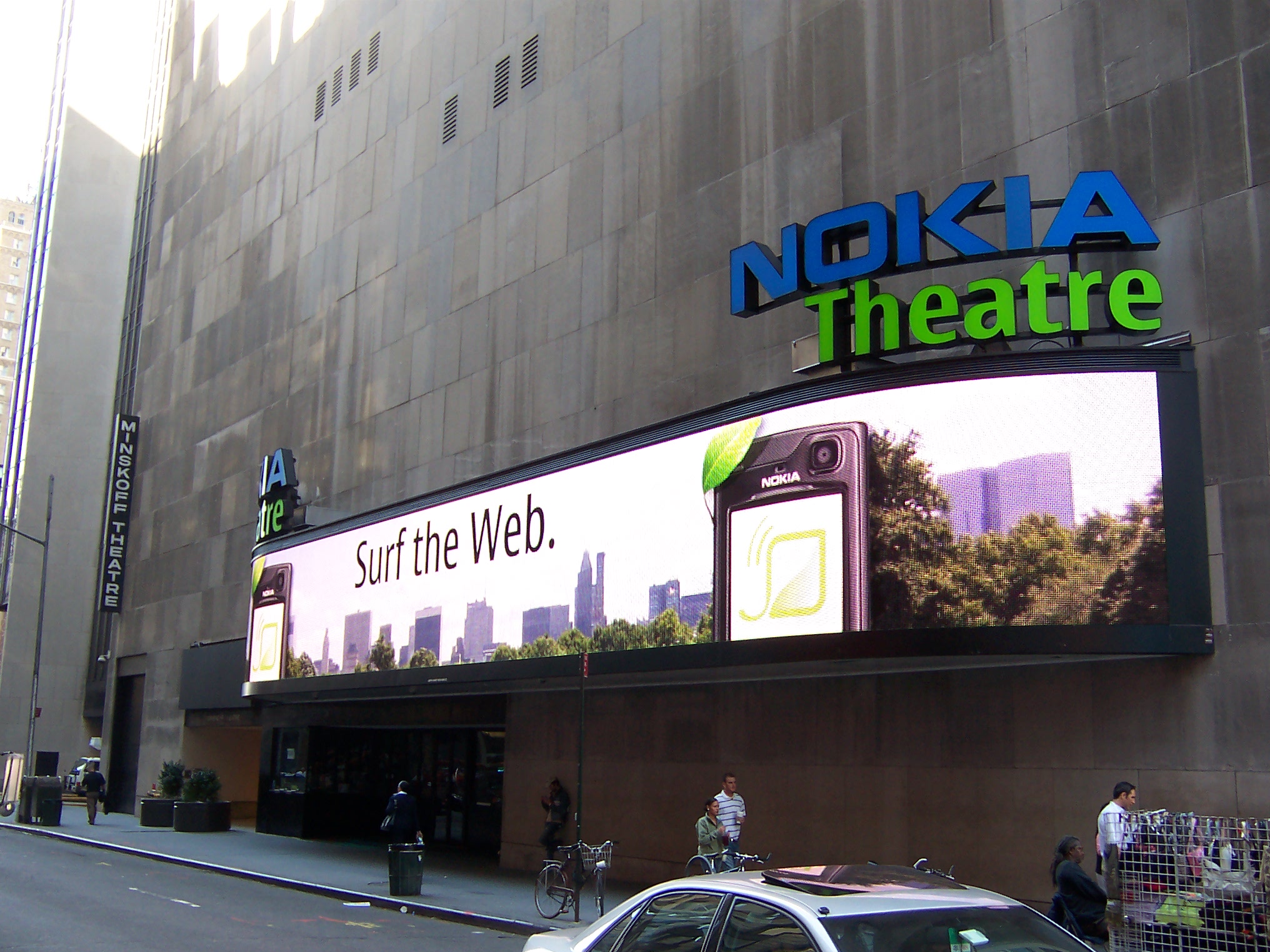 The Minskoff is part of an office building that was built on the site of the demolished Astor Hotel at one of the lowest points in Broadway history. Past productions include Pippin (1977), The Tap Dance Kid (1984), Sunset Boulevard (1994) and The Scarlet Pimpfromhell (1997). The 2,100-seat Nokia Theatre is a concert venue that was the Astor Plaza movie theatre until 2004. The Minskoff is above street level and the Nokia is below street level.