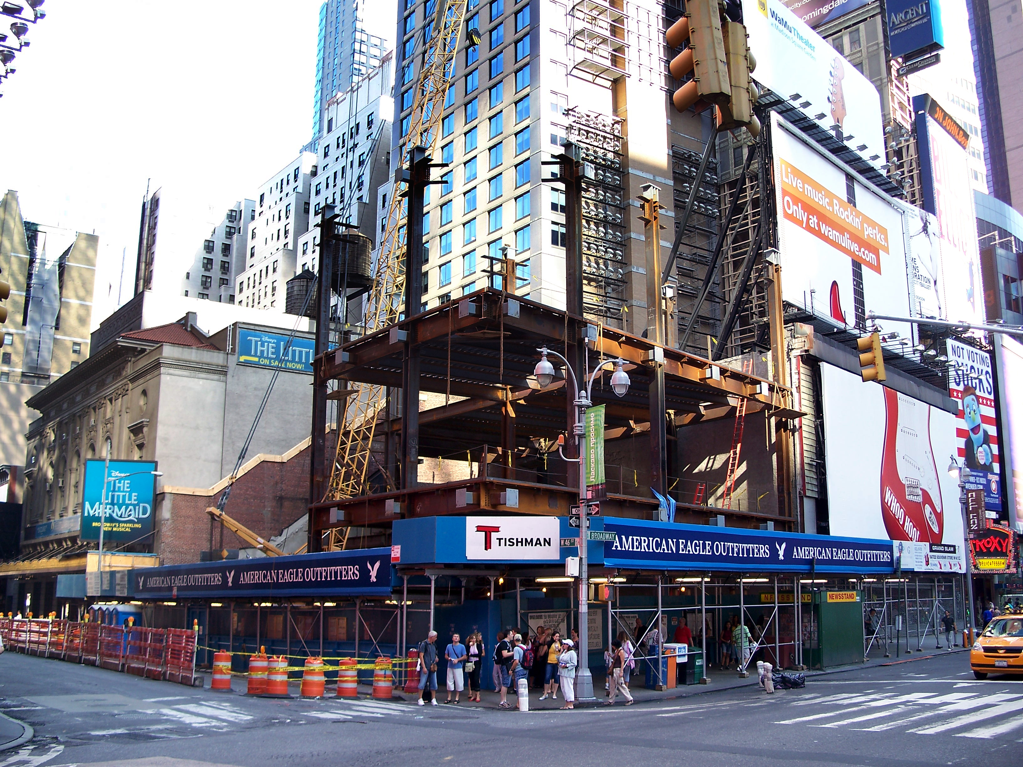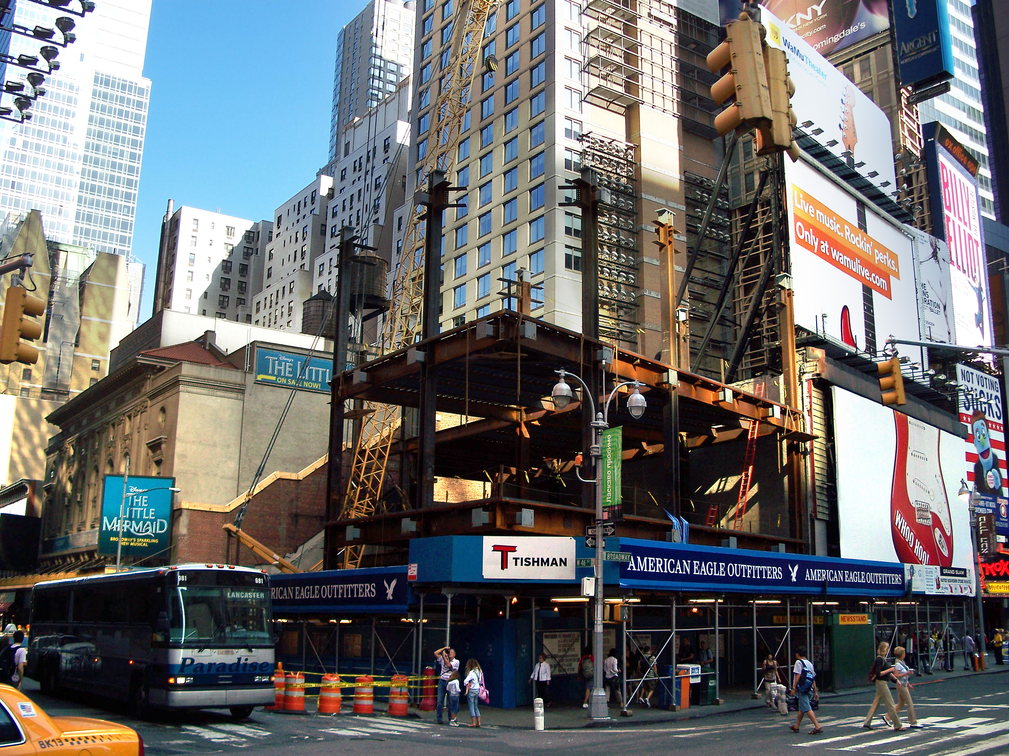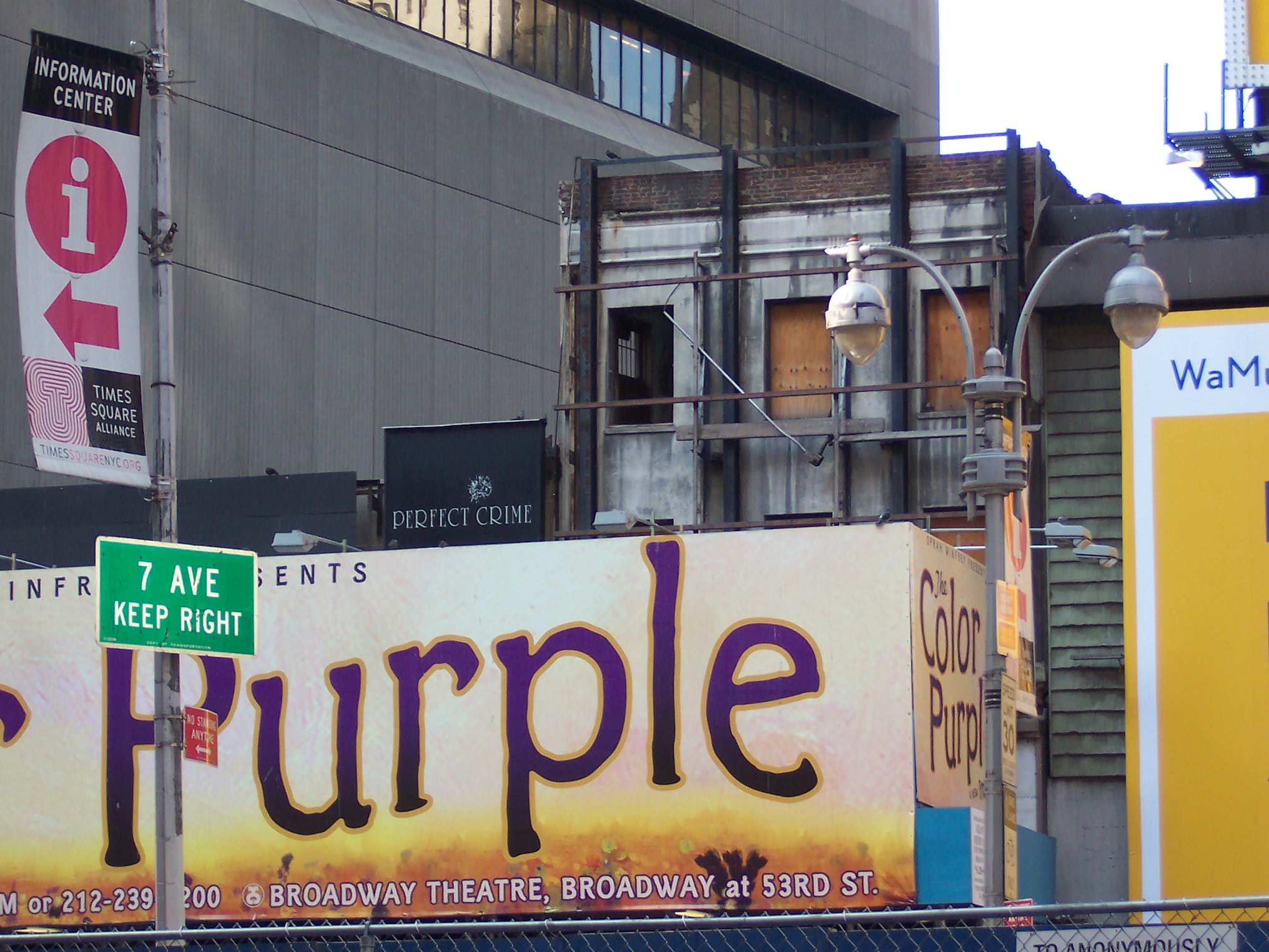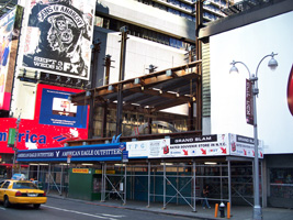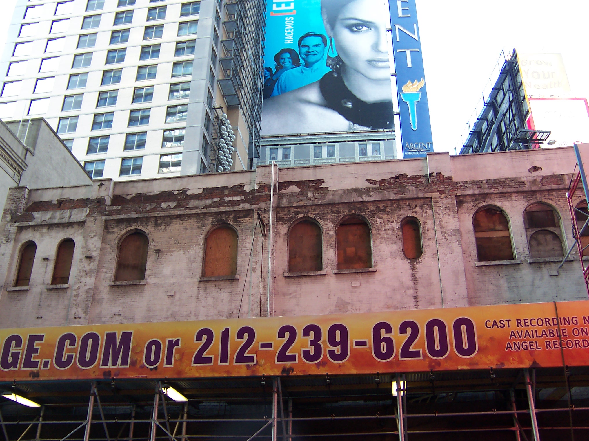 The Duffy Theatre subsequently opened in the space and hosted the long-running (and ironically named) show Perfect Crime. Despite its presence in the heart of the Broadway theatre district, its size made it an Off-Broadway house. The building was also host to an anachronistic Howard Johnson's restaurant and one of the last vestages of the old Times Square, the Gaity male strip club. The building itself may have been even older than the 1917 dance hall as indicated by the photo below that was shot in Fall 1998 from north of 47th street when demolition next door exposed a ghost ad for "J.A. Kean's Carriage Manufactory" (J.A. Keal?). After surviving a 89-year onslaught by uptight moralists, changing demographics and shifting economic winds, the tawdry-yet-colorful Orpheum drew its final bedsheet in 2006 when it was demolished to make way for some bland glass curtain-wall dreck. (NYPress.com) (Forgotten-NY.com) (NYTimes photo)
