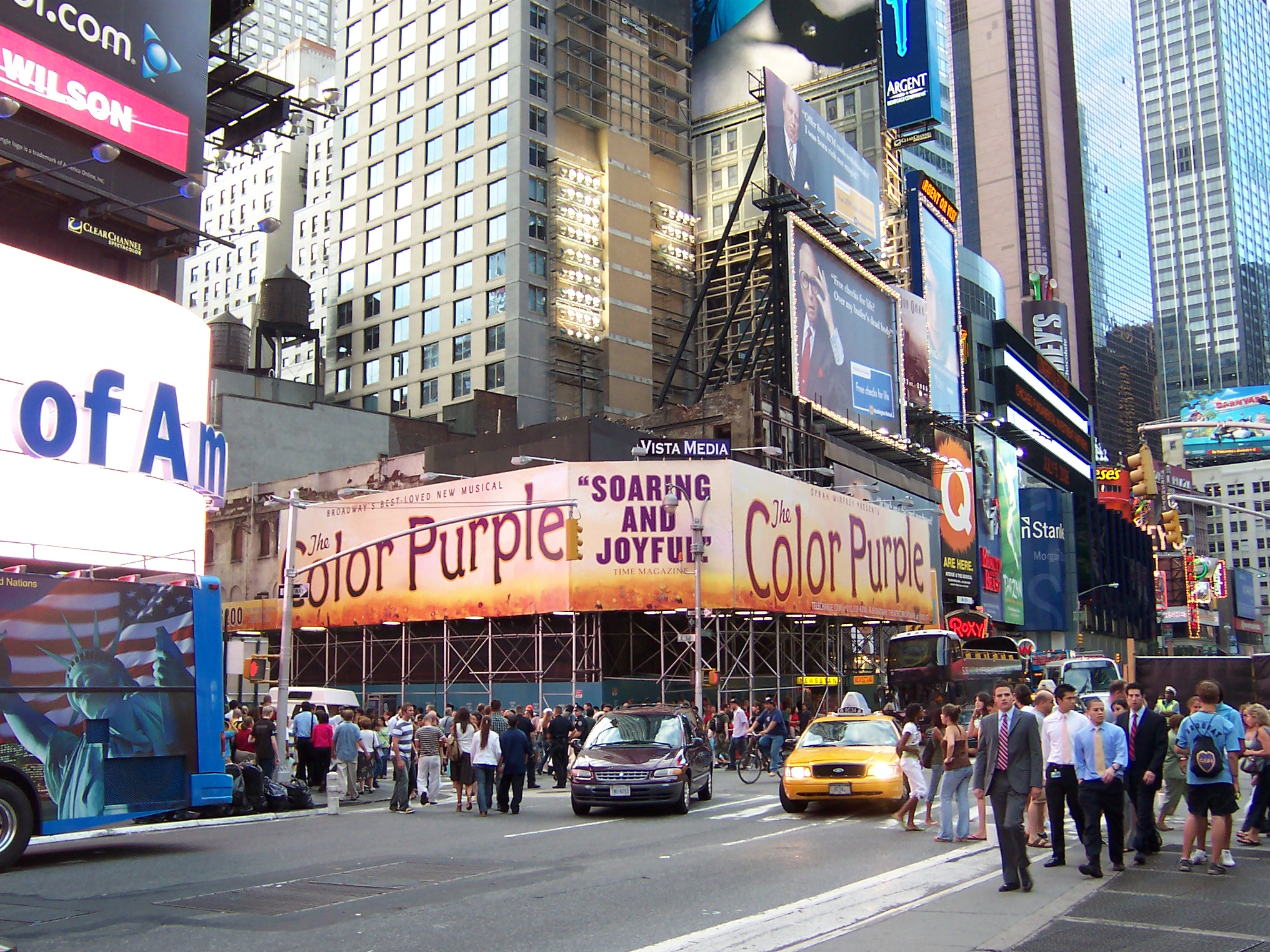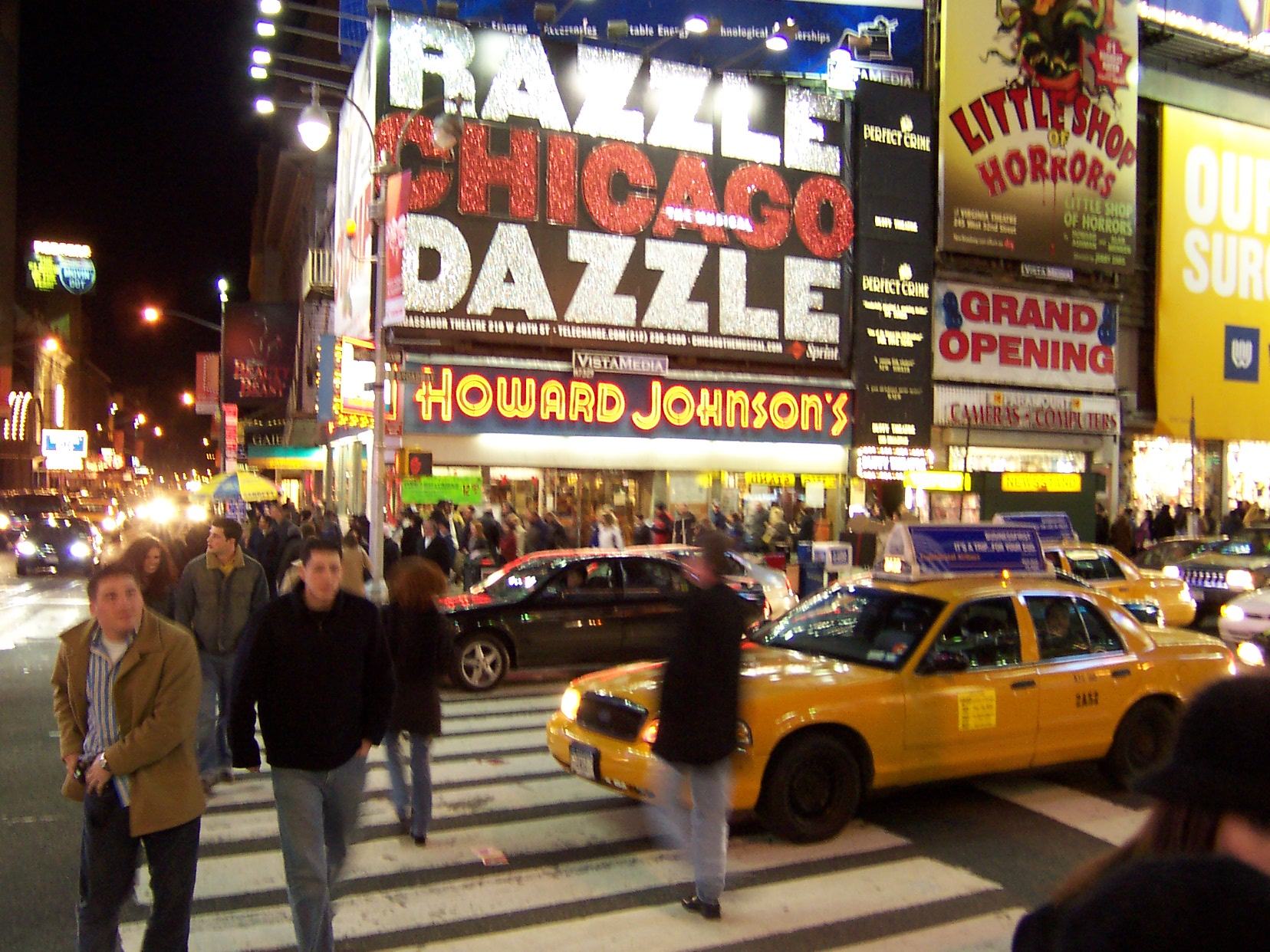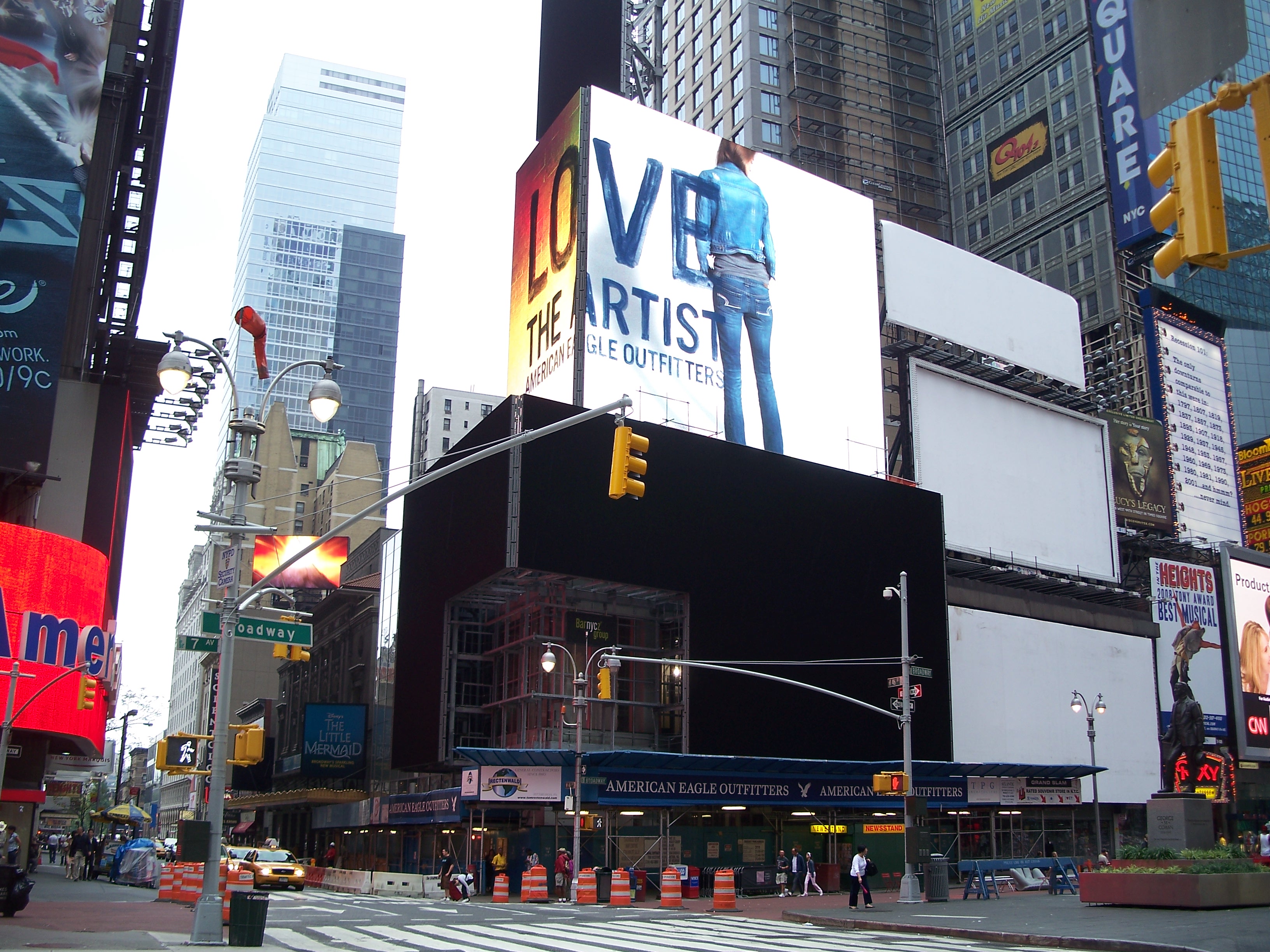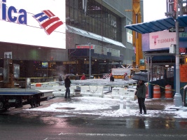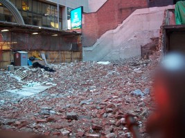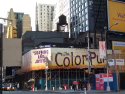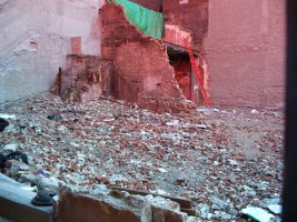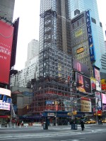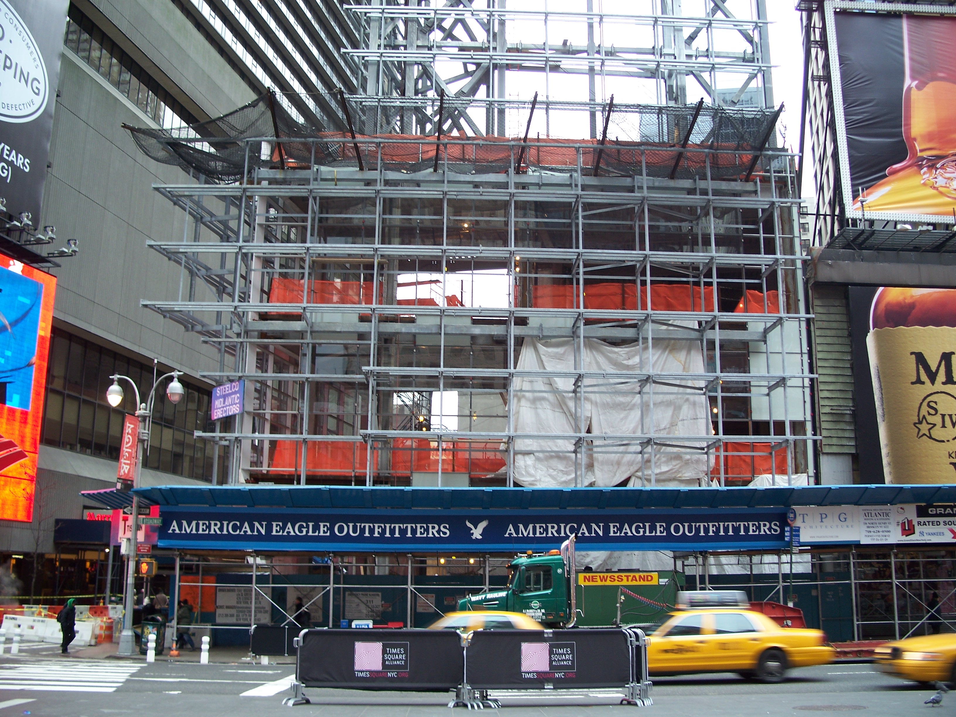 The Duffy Theatre subsequently opened in the space and hosted the long-running (and ironically named) show Perfect Crime. Despite its presence in the heart of the Broadway theatre district, its size made it an Off-Broadway house. The building was also host to an anachronistic Howard Johnson's restaurant and one of the last vestages of the old Times Square, the Gaity male strip club. The building itself may have been even older than the 1917 dance hall as indicated by the photo below that was shot in Fall 1998 from north of 47th street when demolition next door exposed a ghost ad for "J.A. Kean's Carriage Manufactory" (J.A. Keal?). After surviving a 89-year onslaught by uptight moralists, changing demographics and shifting economic winds, the tawdry-yet-colorful Orpheum drew its final bedsheet in 2006 when it was demolished to make way for some bland glass curtain-wall dreck. (NYPress.com) (Forgotten-NY.com) (NYTimes photo)