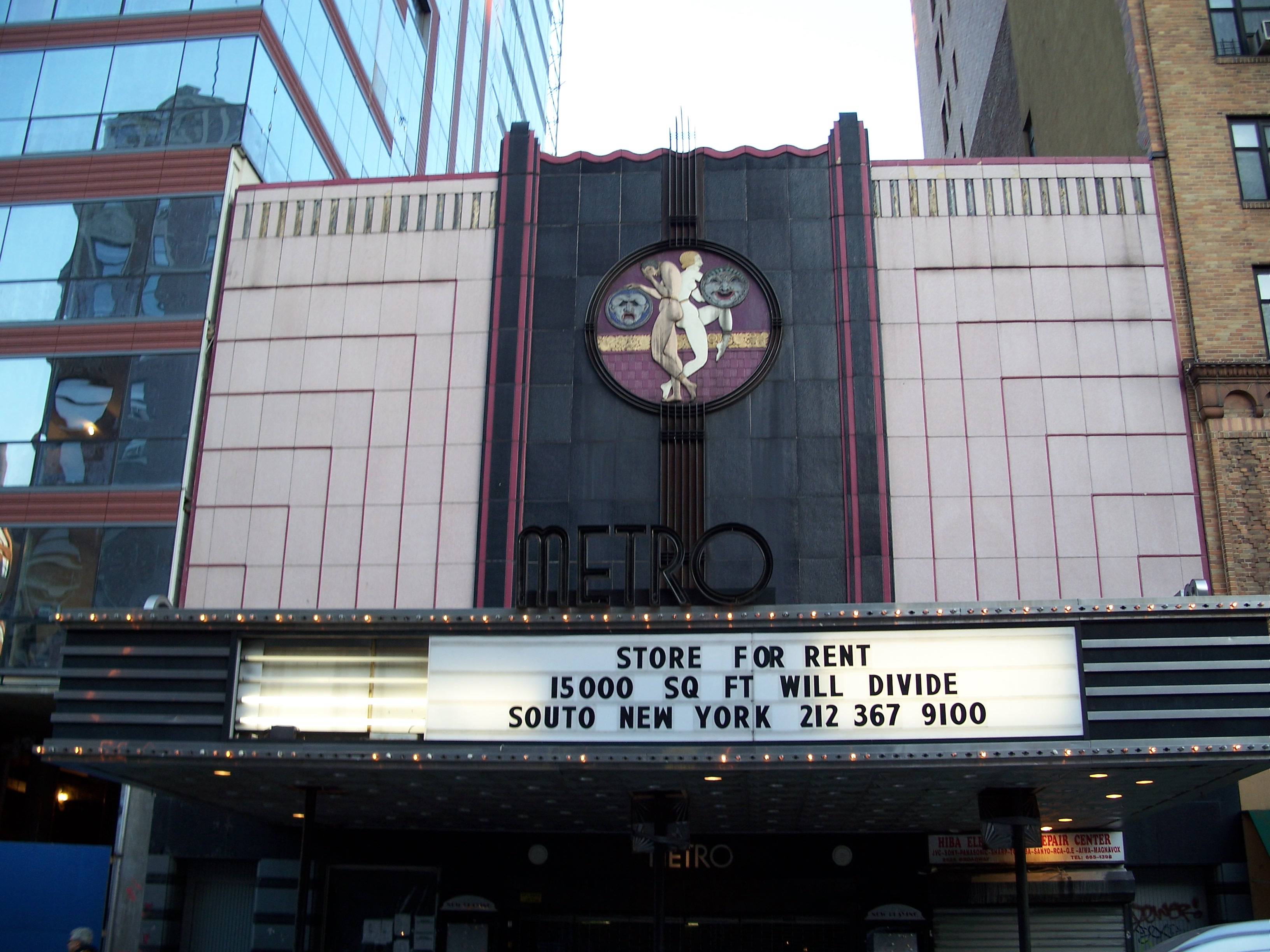 The Art Deco Metro Theatre opened as the Midtown Theatre and has always been a film venue. In 1948, the theatre joined the Brandt circuit, showing foreign and art films. In the 1970's it joined the swelling ranks of porn theatres in the city. In 1982 the building was taken over by Dan Talbot, renamed the Metro and returned to duty as an art house. Cineplex Odeon took over the facility in 1987 and the Art Deco facade received landmark designation in 1989. Clearview Cinemas took over in 1998 before closing the facility in 2004. The building just to the north was razed in 2006 to make way for the Ariel Condos. Numerous plans to reopen the theatre have been rumored but as of this writing (Fall 2007) the facility remains dark.
