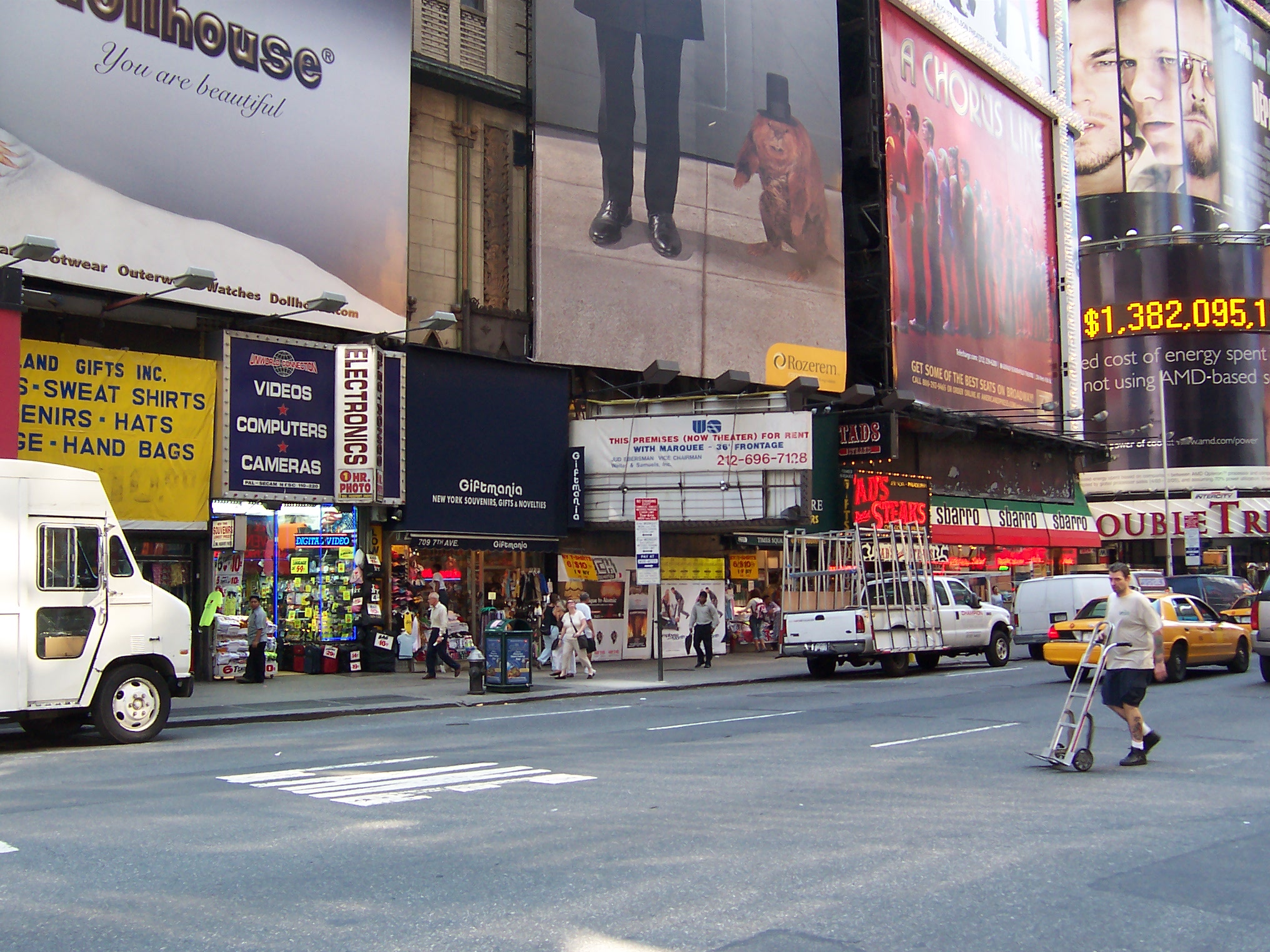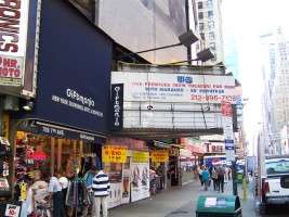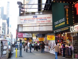 The Cine was a 488-seat twin that started life in the 1970s as a Spanish-language twin. The theatre was down a flight of stairs with only the box office at street level. The theatre later descended into live porn as the Show Follies until being closed in the 1990's conversion of Times Square into Square Times. When I visited it was a rental space run by Sage Theatre with the old marquee used as an advertising billboard.