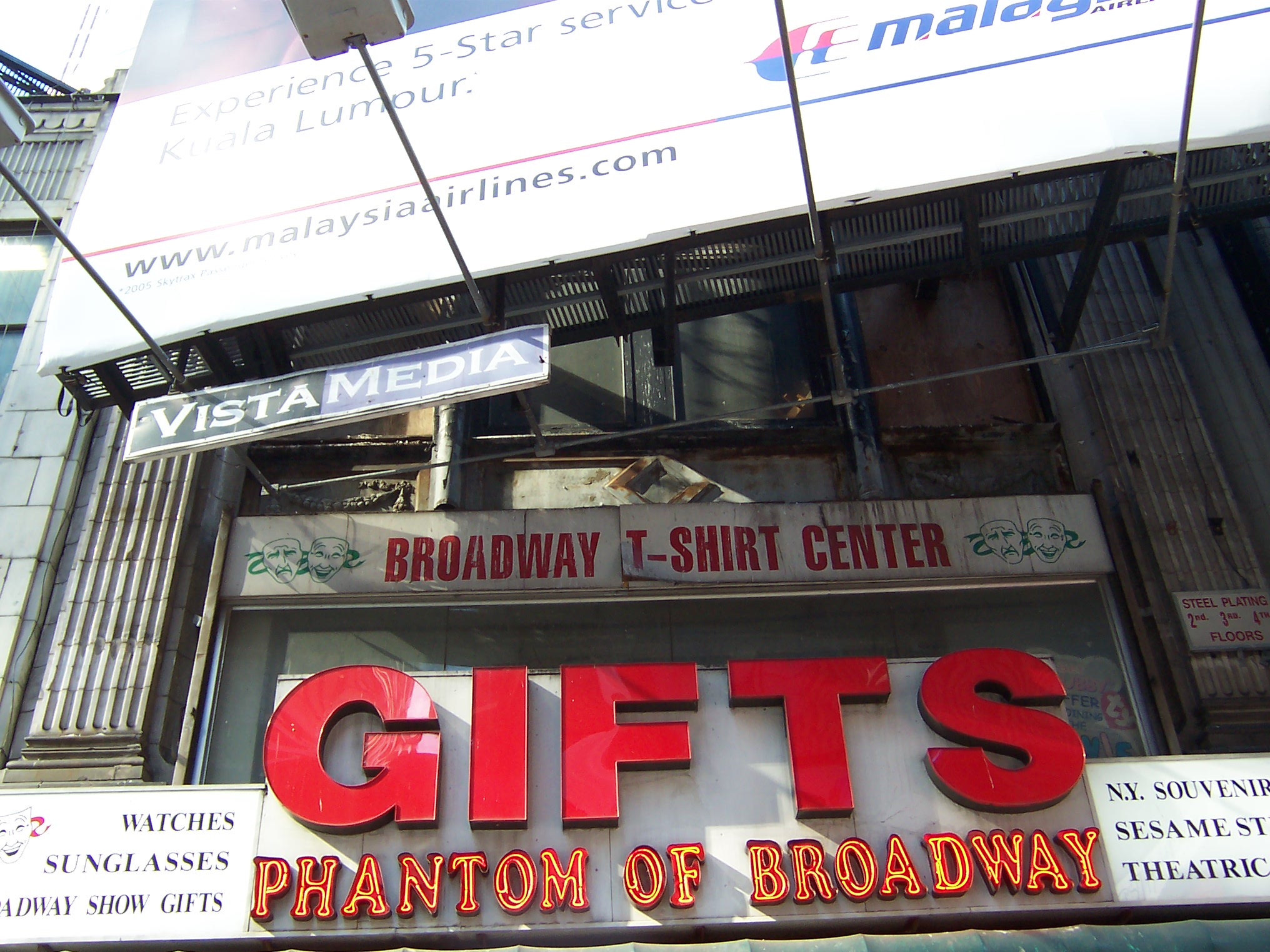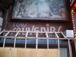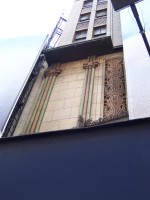 This block was once home to three movie theatres. The RKO Mayfair Theatre (seats 1,735) was built in 1930 in the gutted space of the old Columbia Burlesque Theatre, a Beaux-Arts theatre that opened in 1910. The name was changed to the DeMille around 1960 when the space was used for reserved-seat "Road Show" blockbuster films. The theatre was crudely triplexed by blocking off the balcony and dividing it in half - leaving a space in the middle so the projection room could still be used for the main floor screen. The Embassy 2-3-4 name was used since the Embassy I was one block south at 1560 Broadway. The theatre closed in 1998 and remained vacant when I took these photos in Fall 2006.