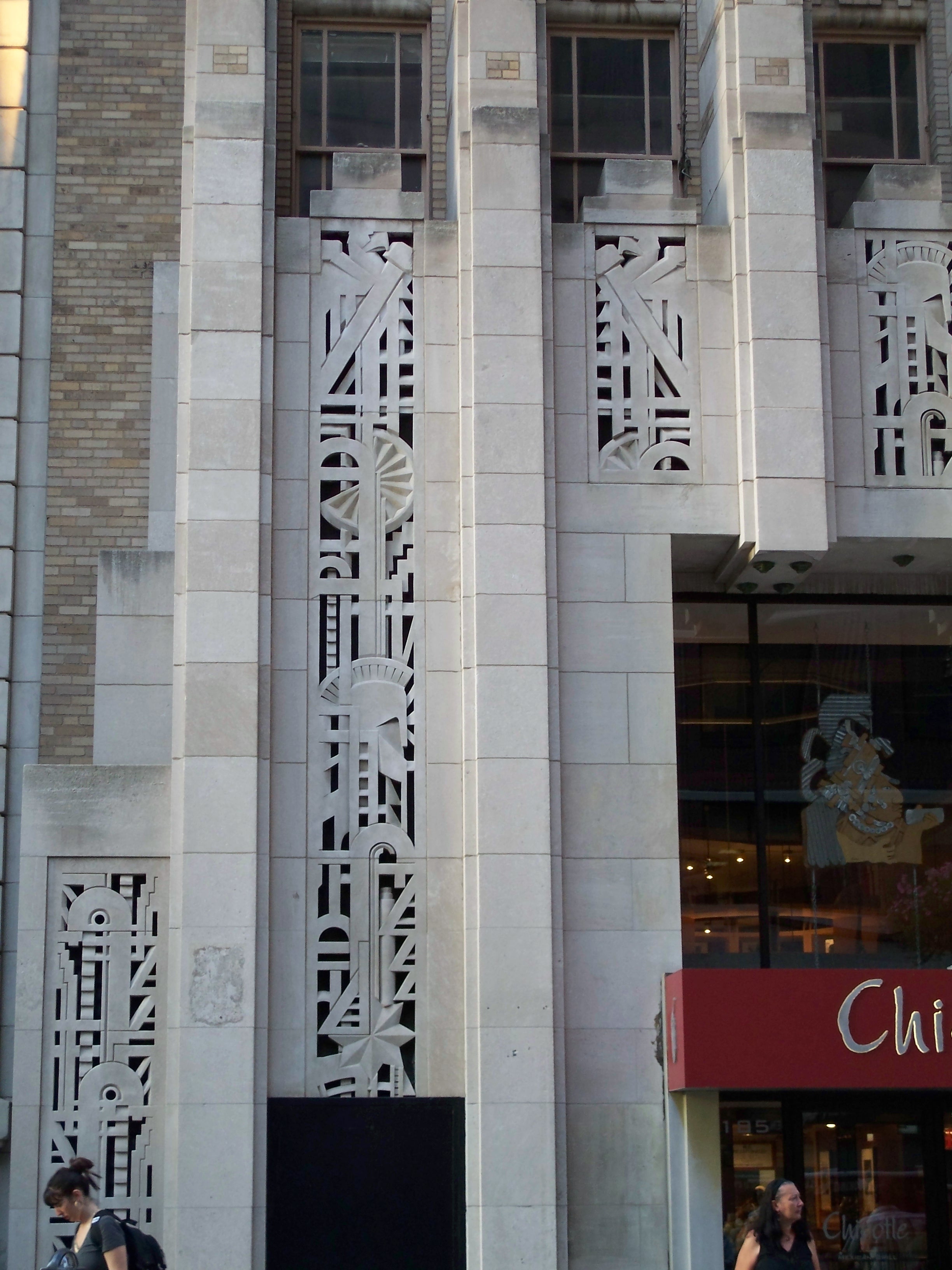 Geometrically stylized figures of humans and animals frequently adorn Art Deco buildings, often in bas relief.