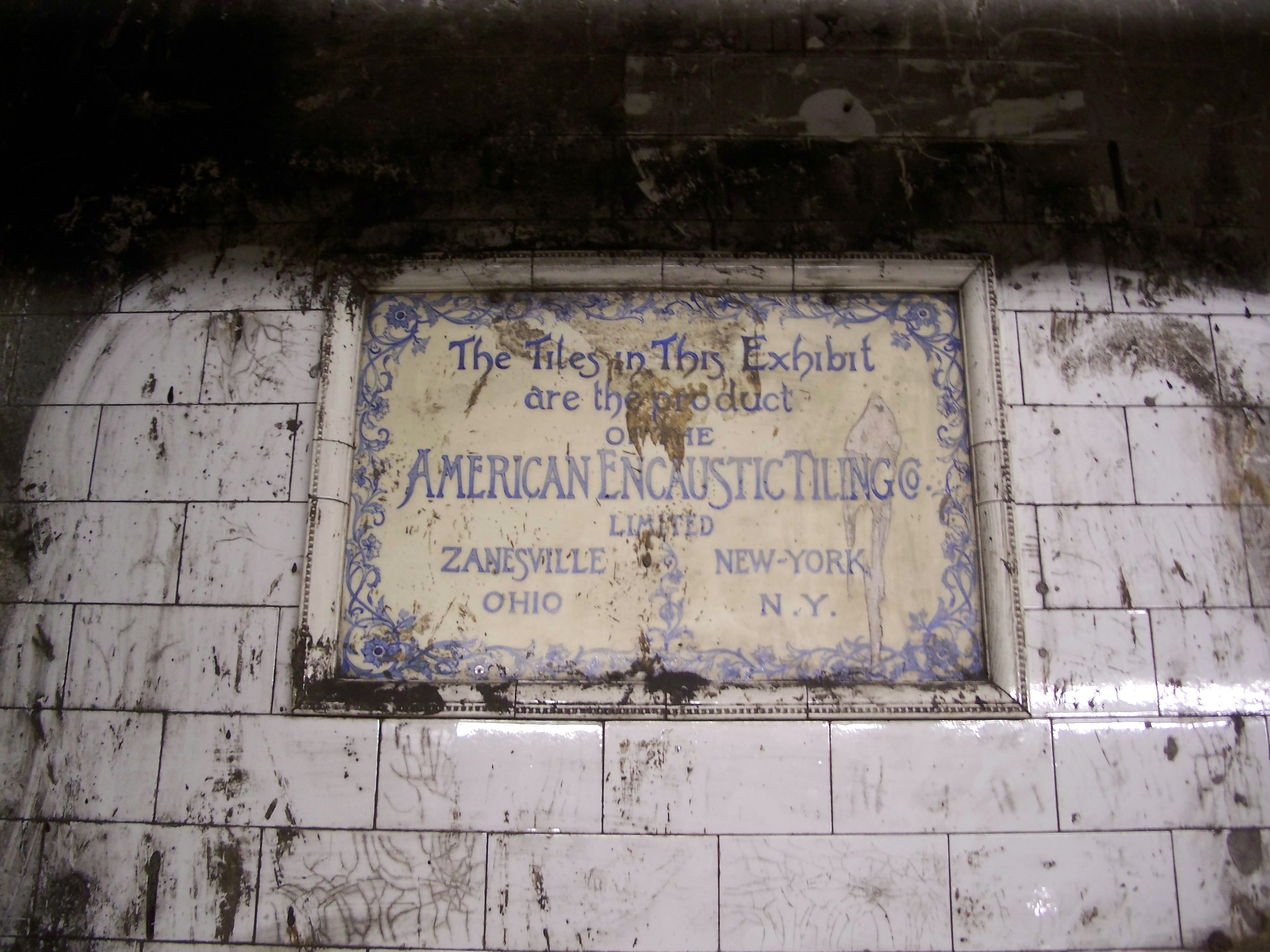 This plaque and surrounding tiles were part of a trial of a variety of different tiling materials by the station architects, Heins and LaFarge. This plaque was revealed when a false wall was demolished during the 2007 renovation of the Columbus Street / 58th Street Station.