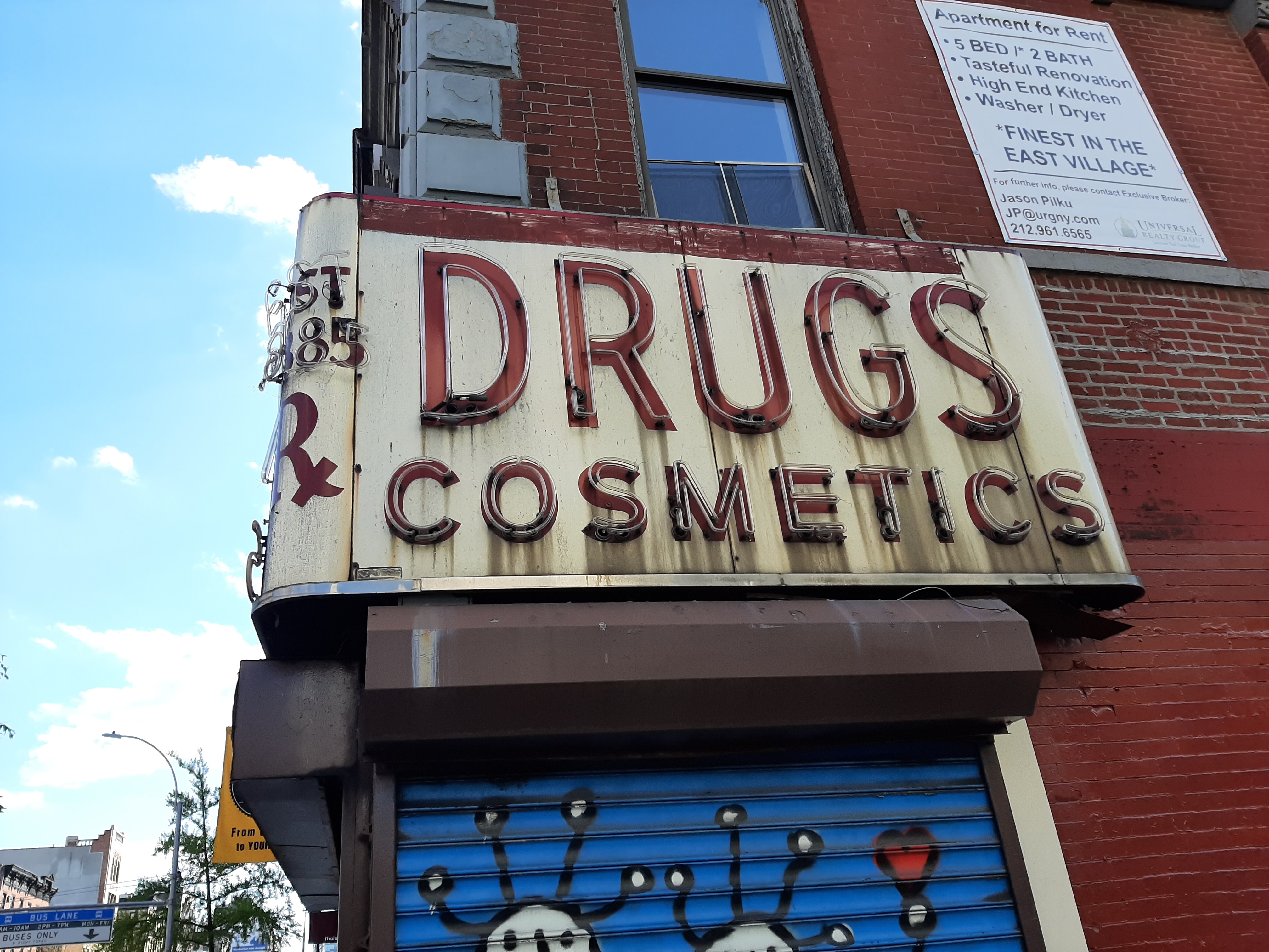 Not actually a ghost sign because the drugstore was still in operation, but the long-lived enamel sign is in that spirit.