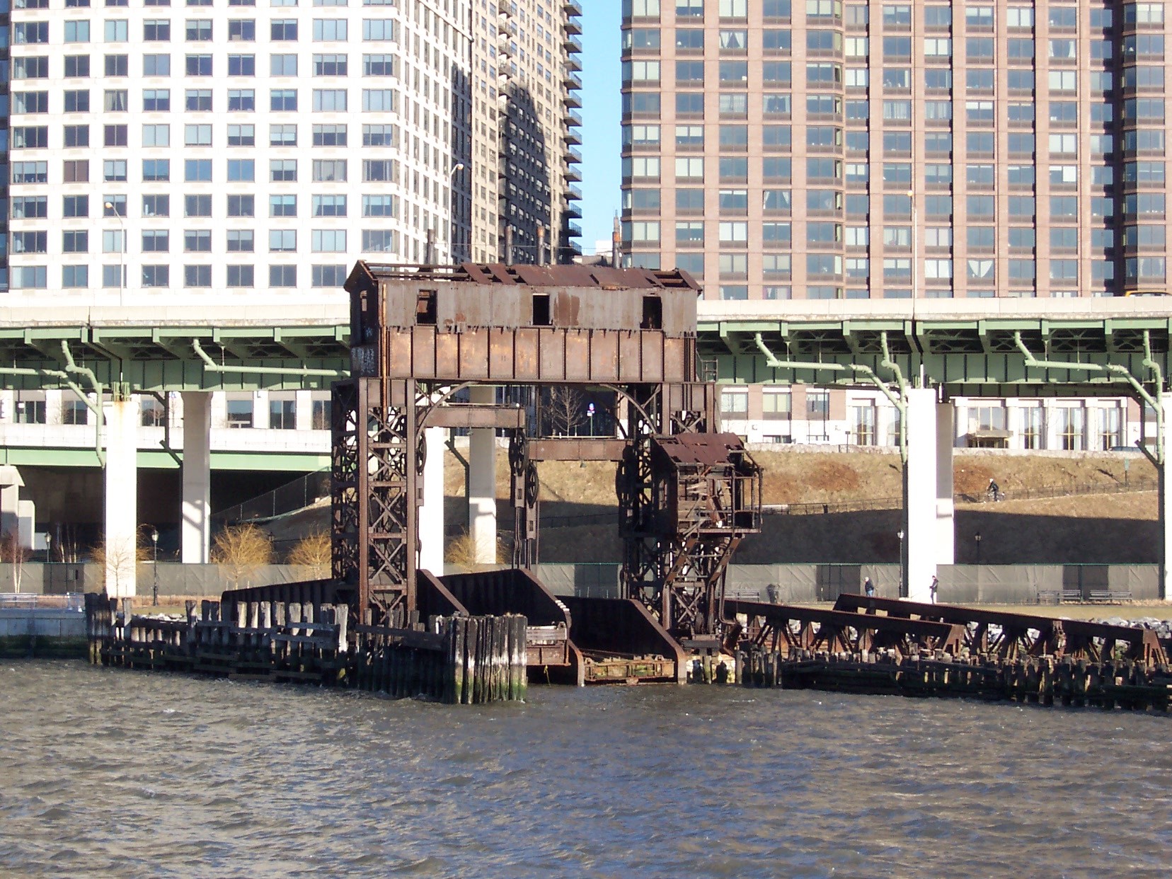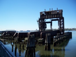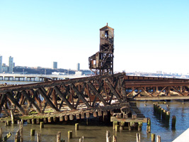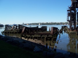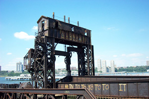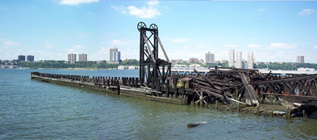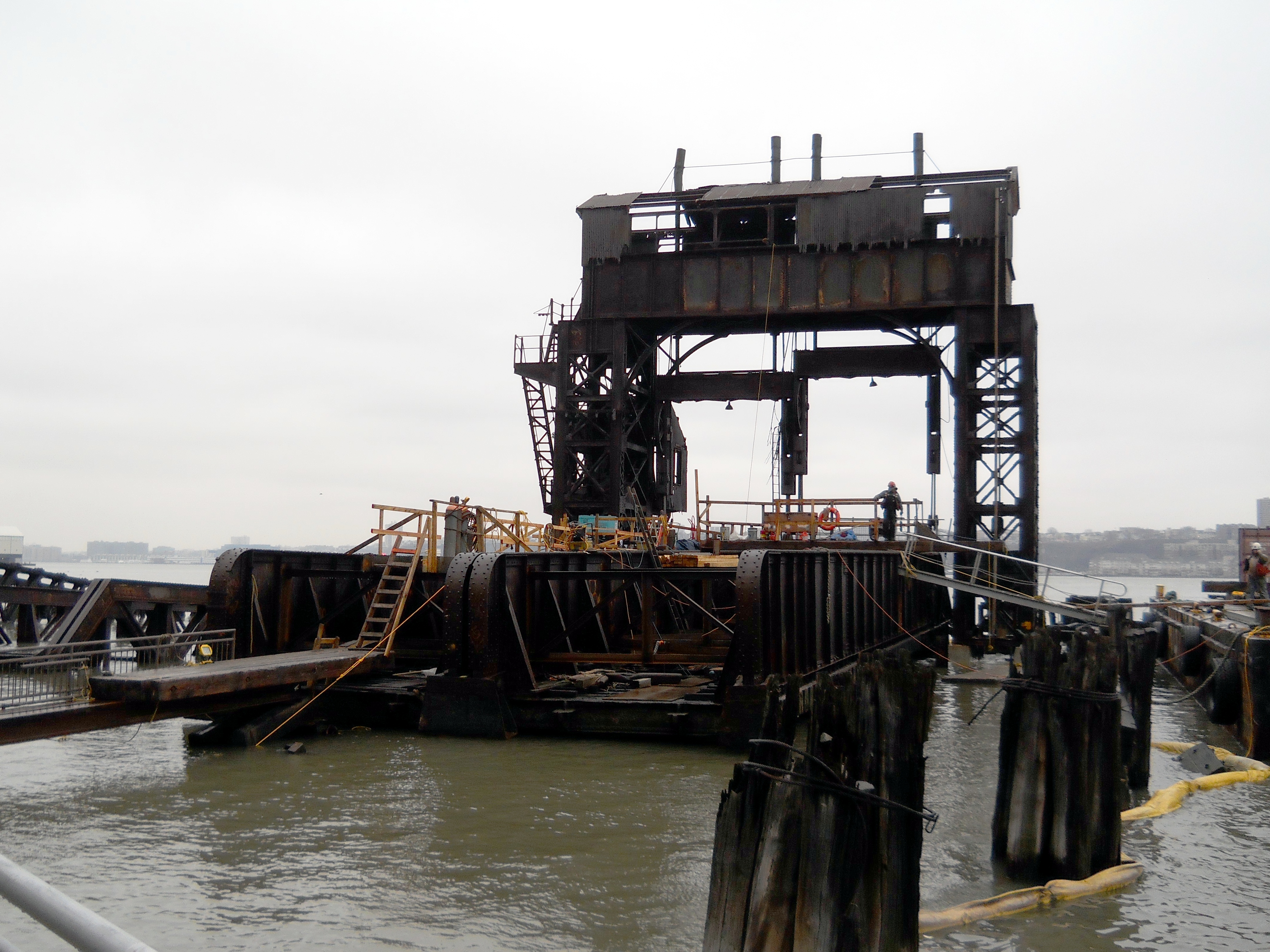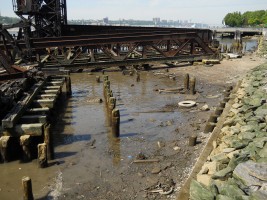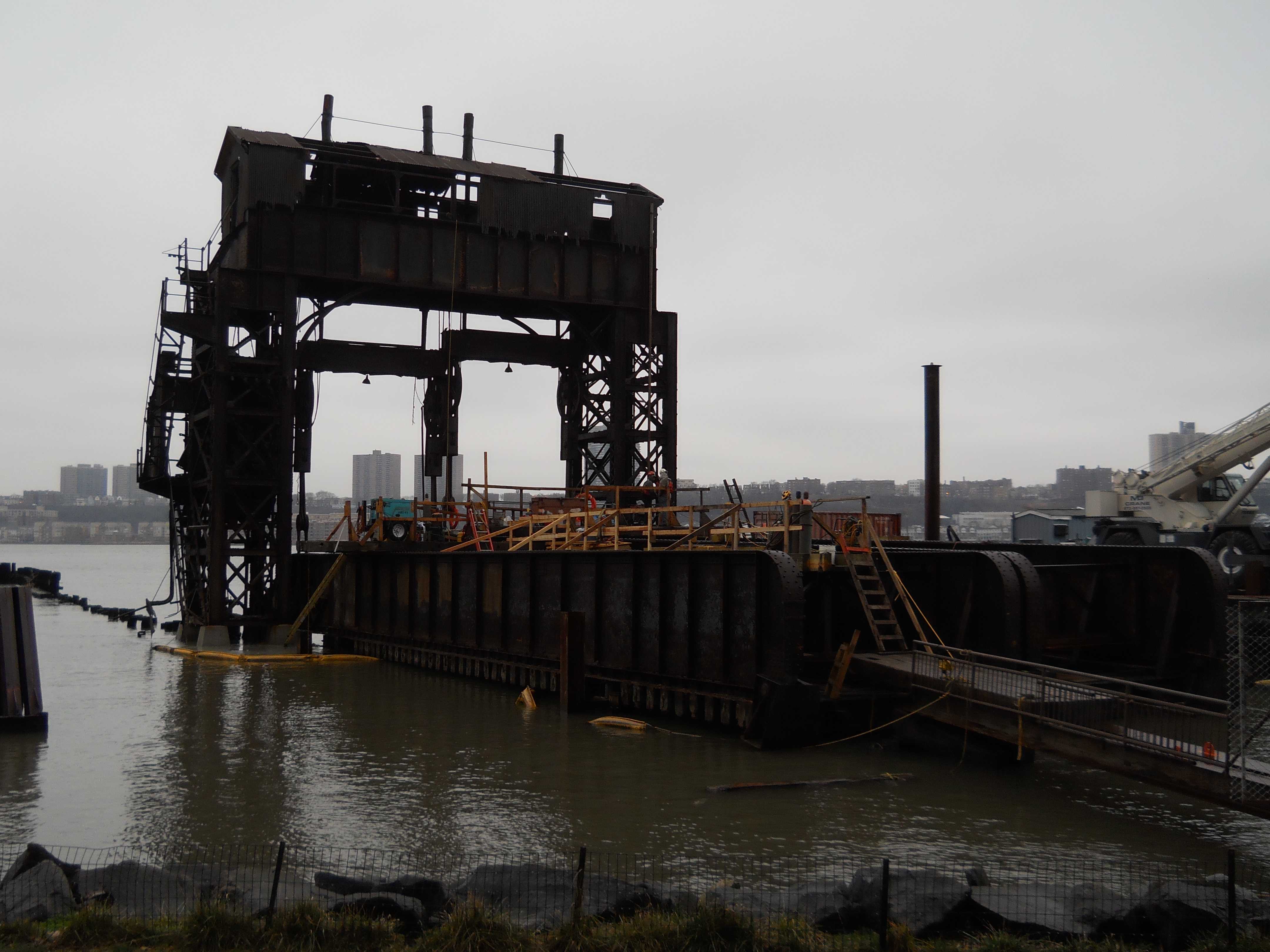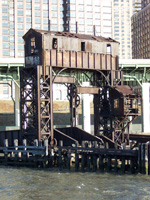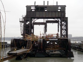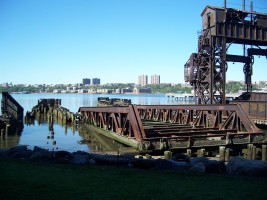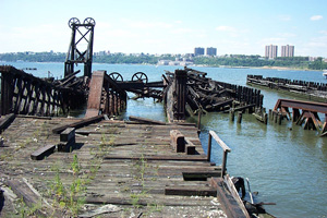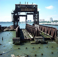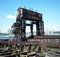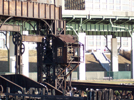 Perhaps the most distinctive ruins at the 60th Street Railyard are the remains of three float bridges that were used to transfer cars from car float barges to the railyard tracks. The northernmost bridge is capped by a gantry frame.