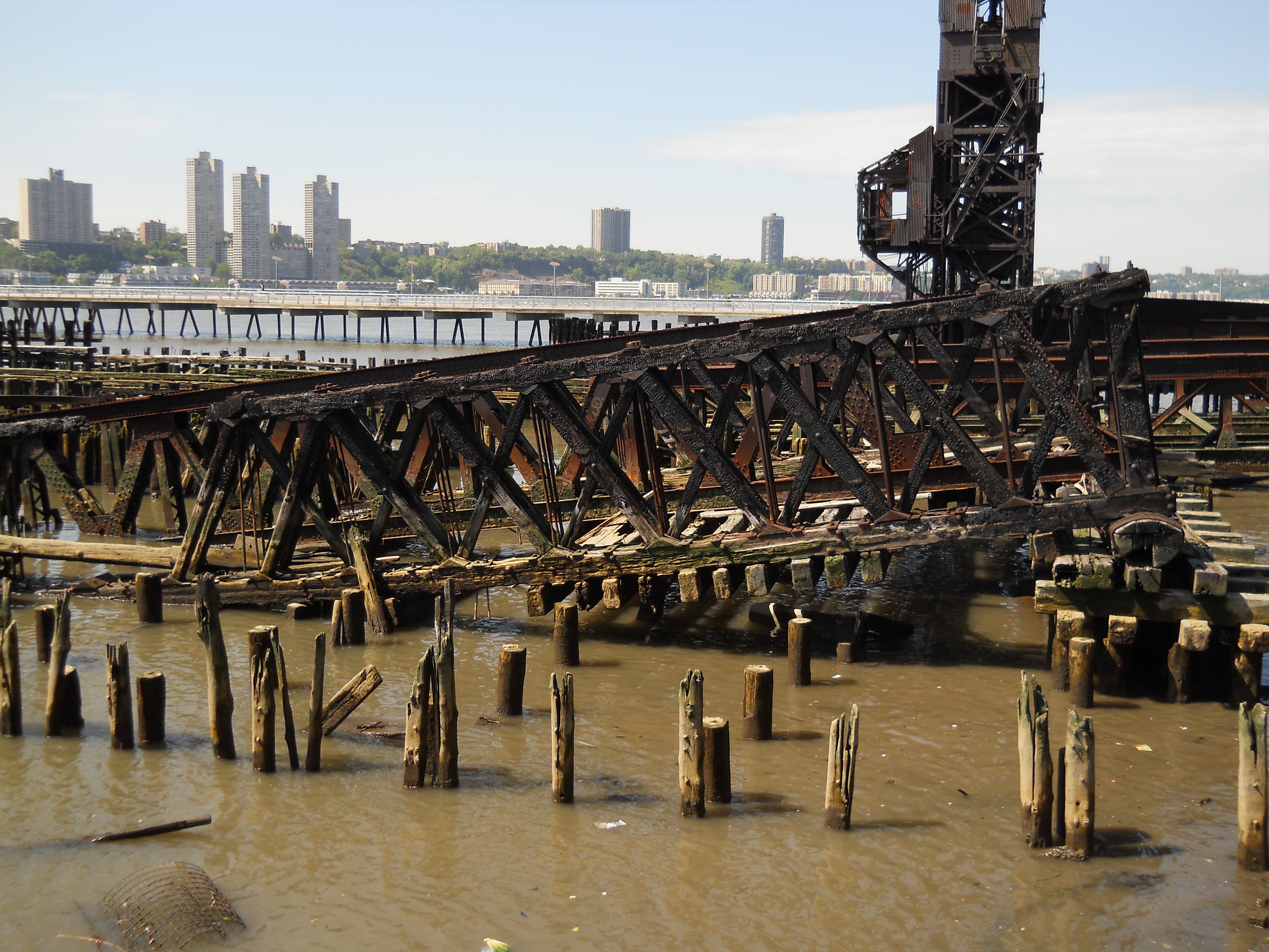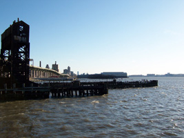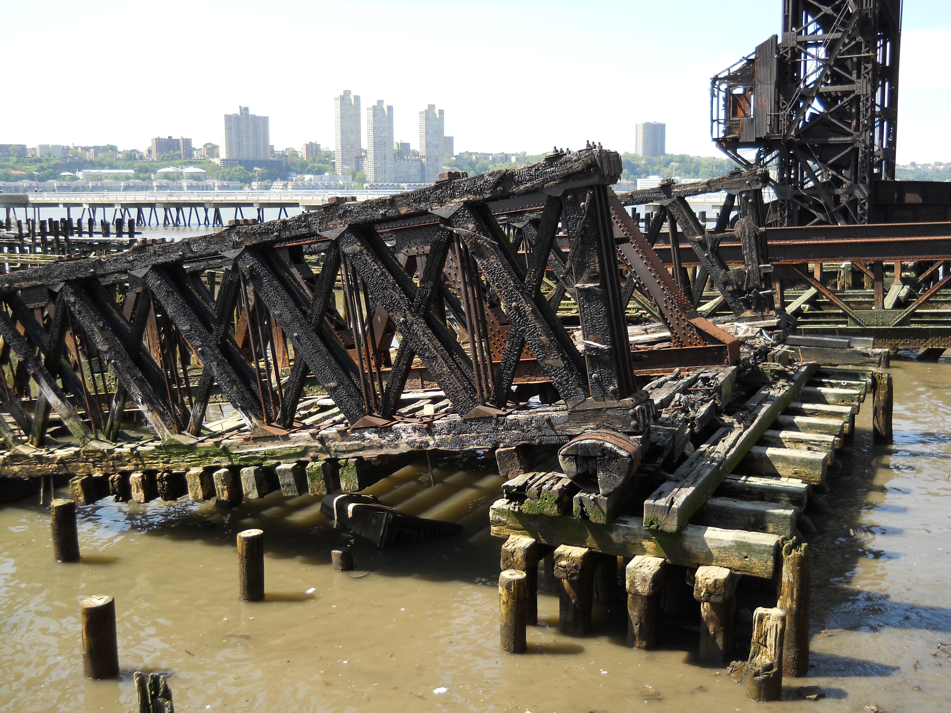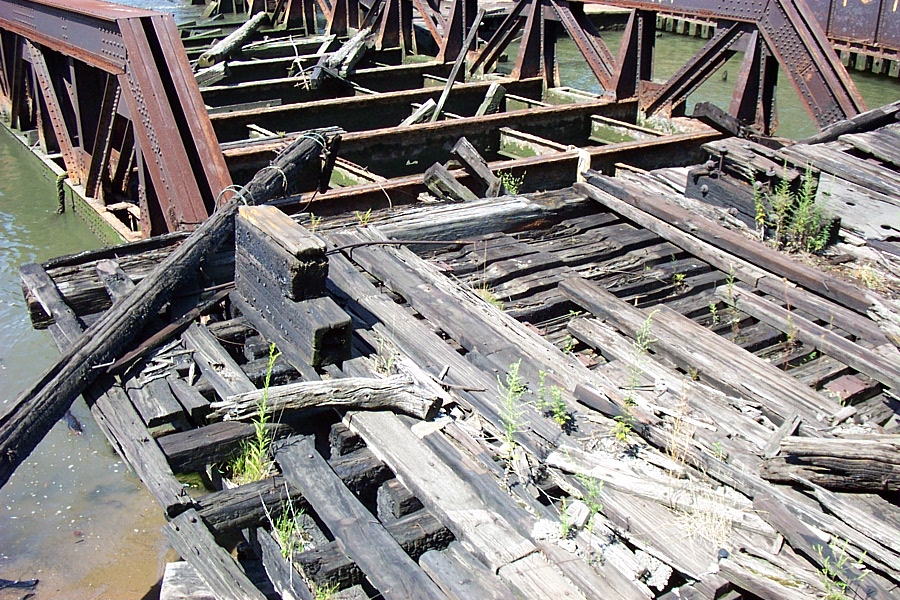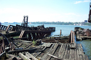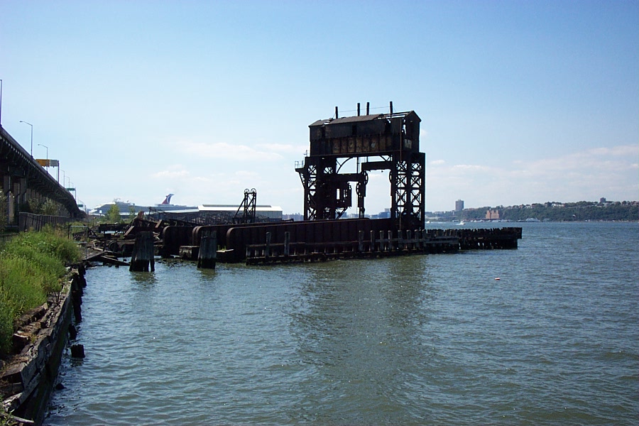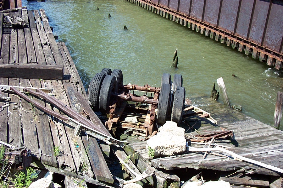 Perhaps the most distinctive ruins at the 60th Street Railyard are the remains of three float bridges that were used to transfer cars from car float barges to the railyard tracks. The northernmost bridge is capped by a gantry frame.