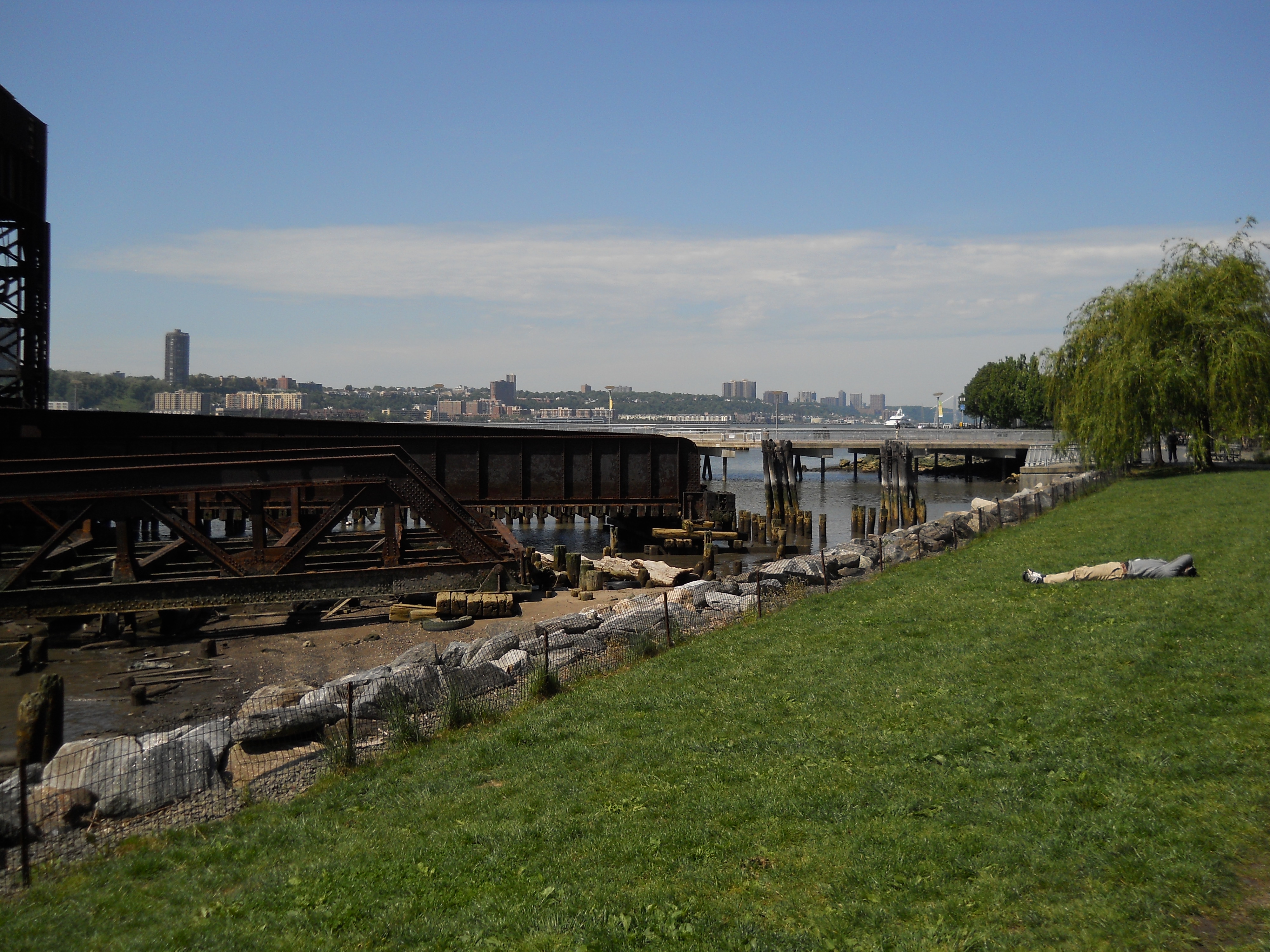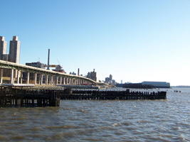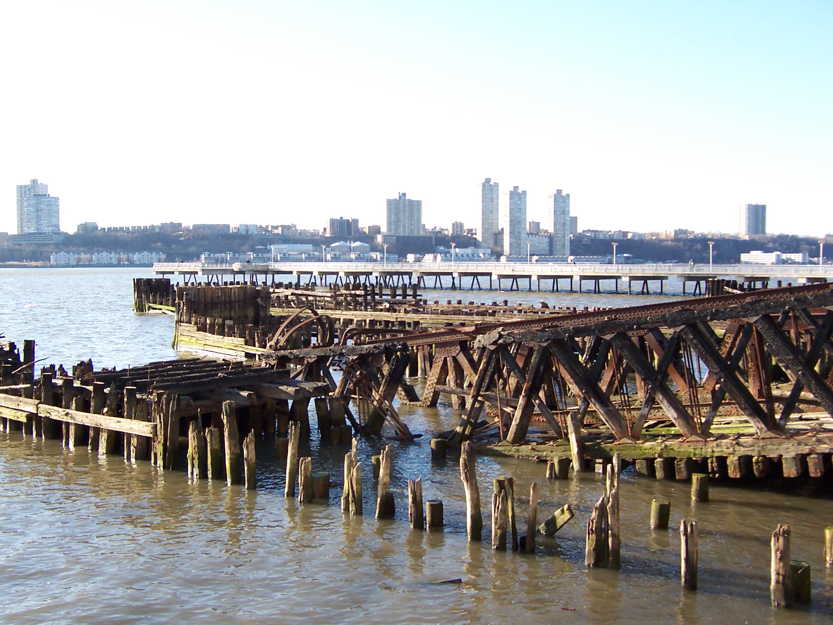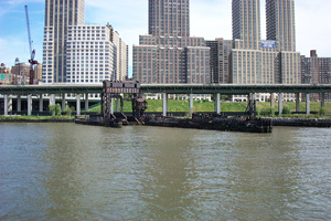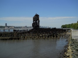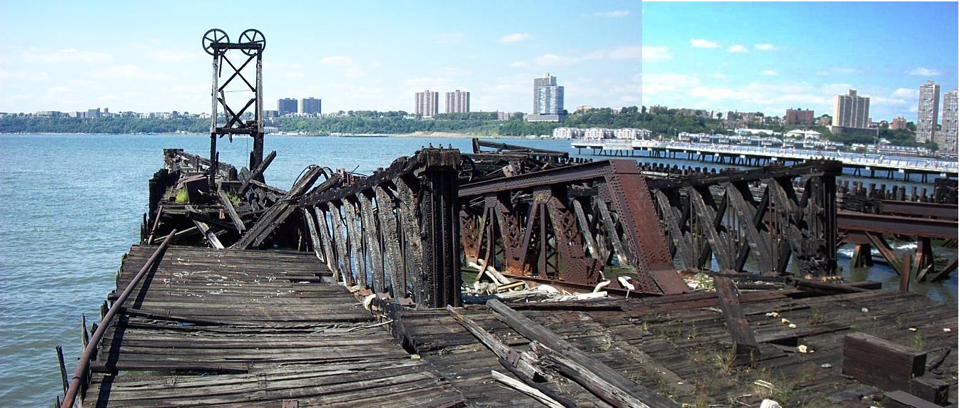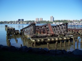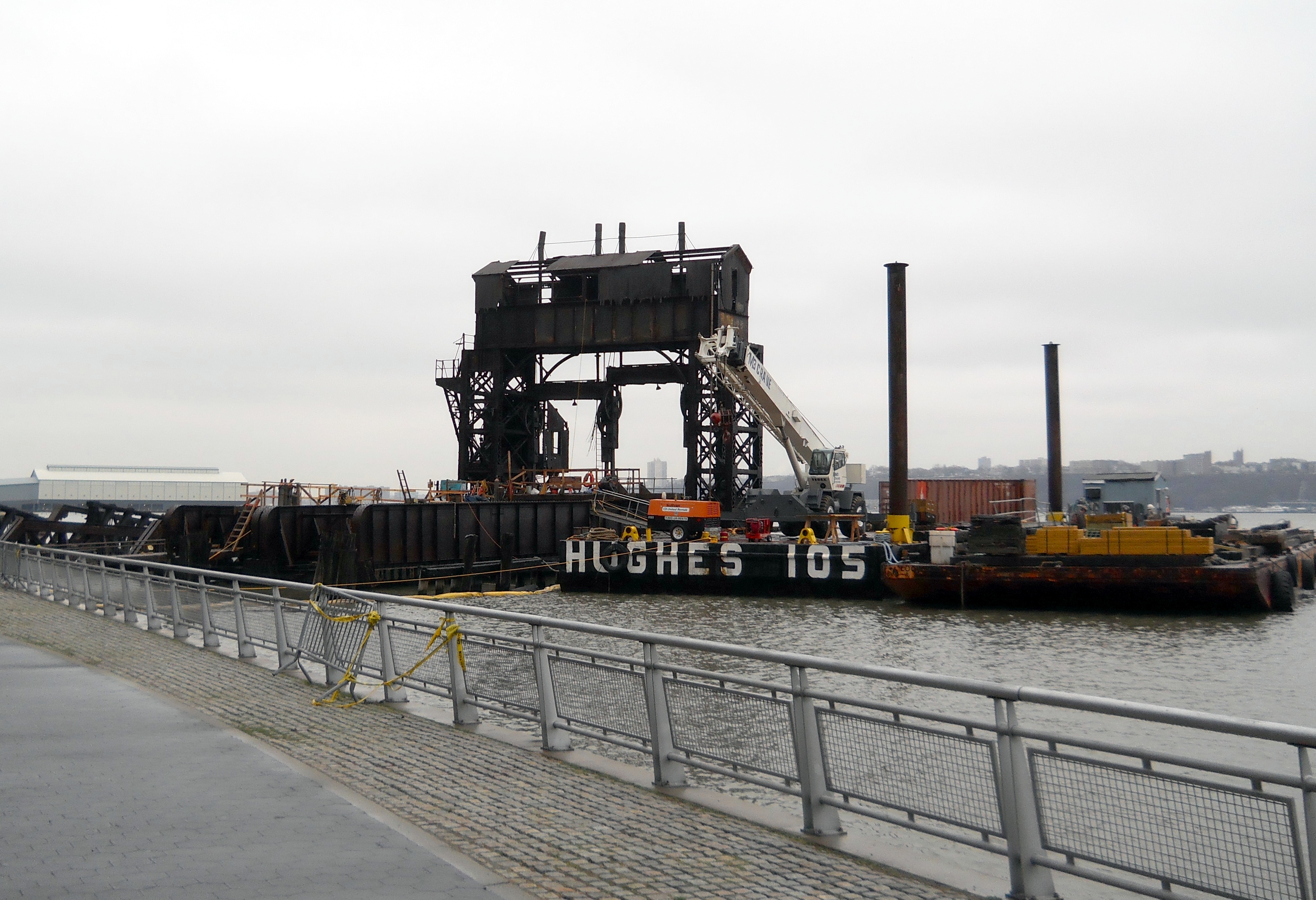 Perhaps the most distinctive ruins at the 60th Street Railyard are the remains of three float bridges that were used to transfer cars from car float barges to the railyard tracks. The northernmost bridge is capped by a gantry frame.