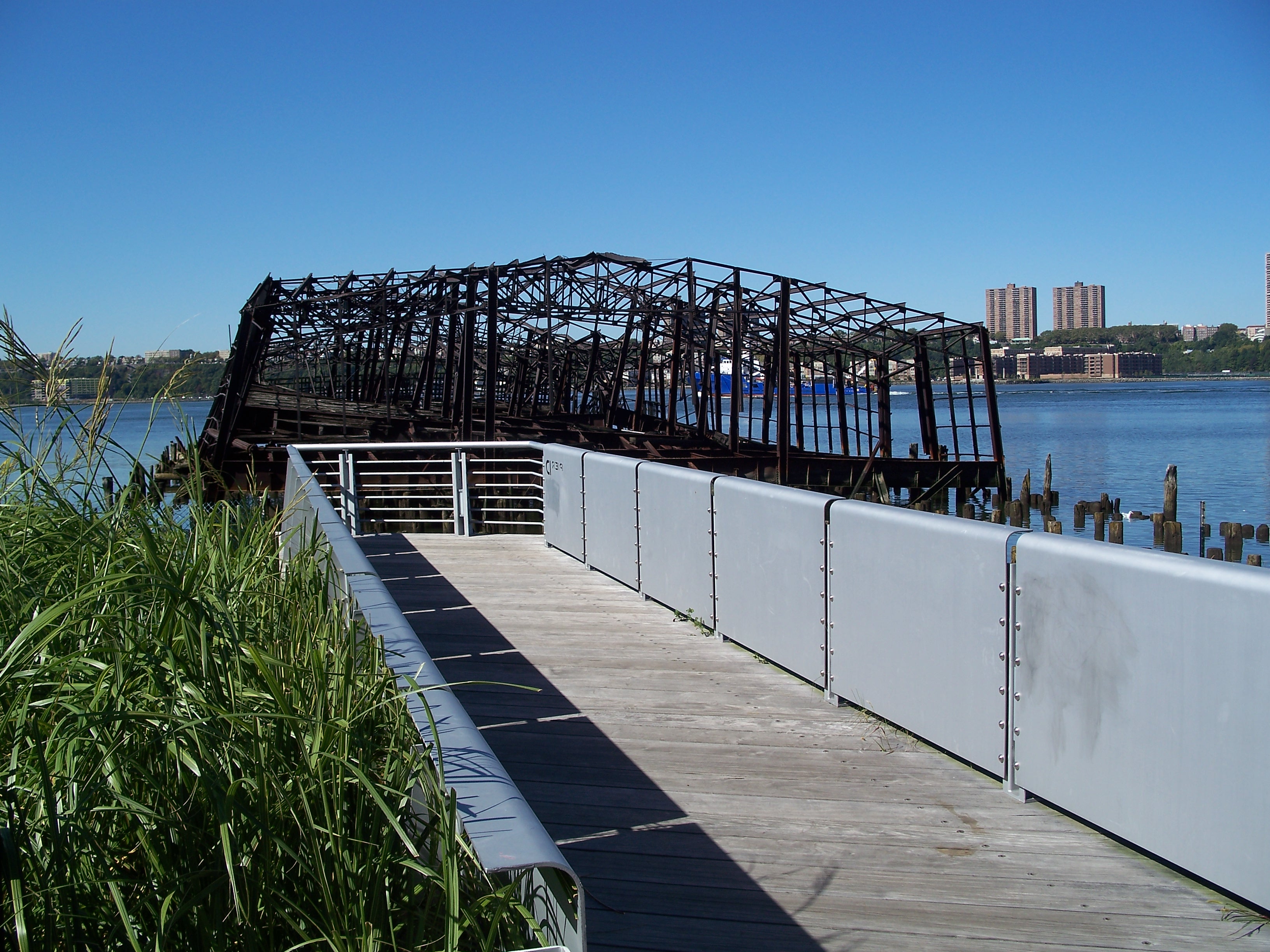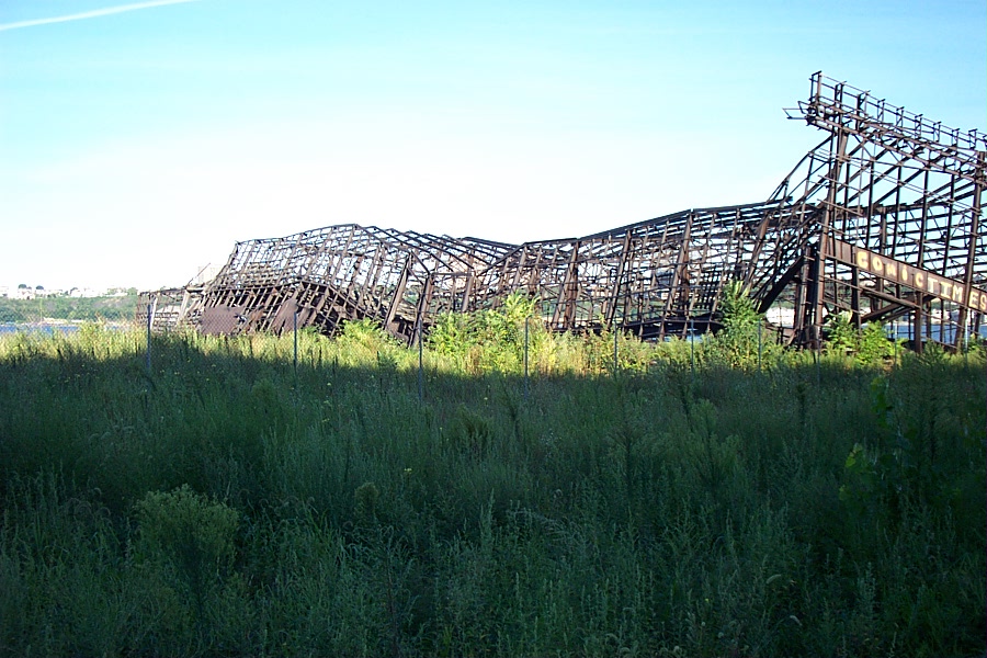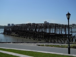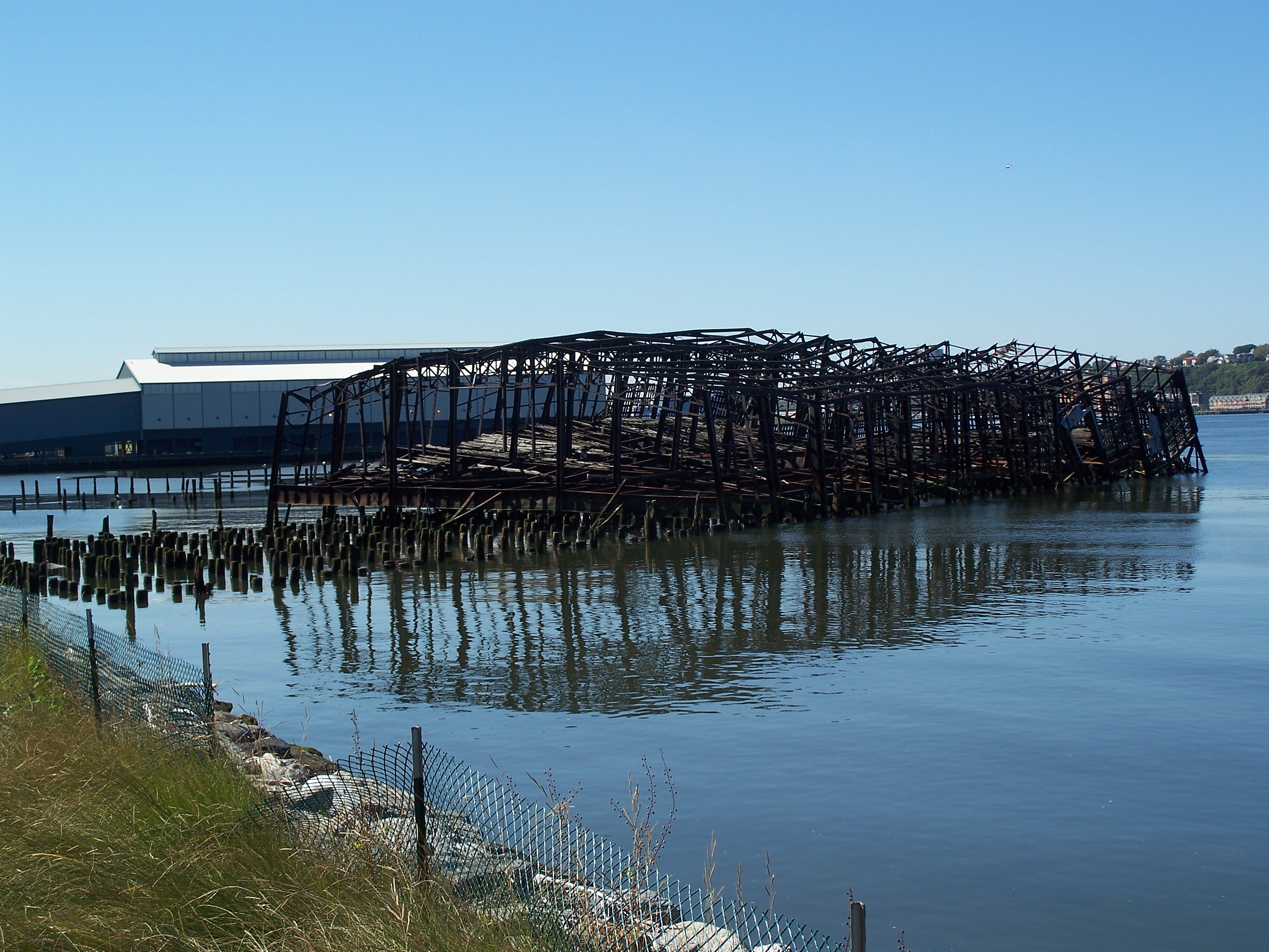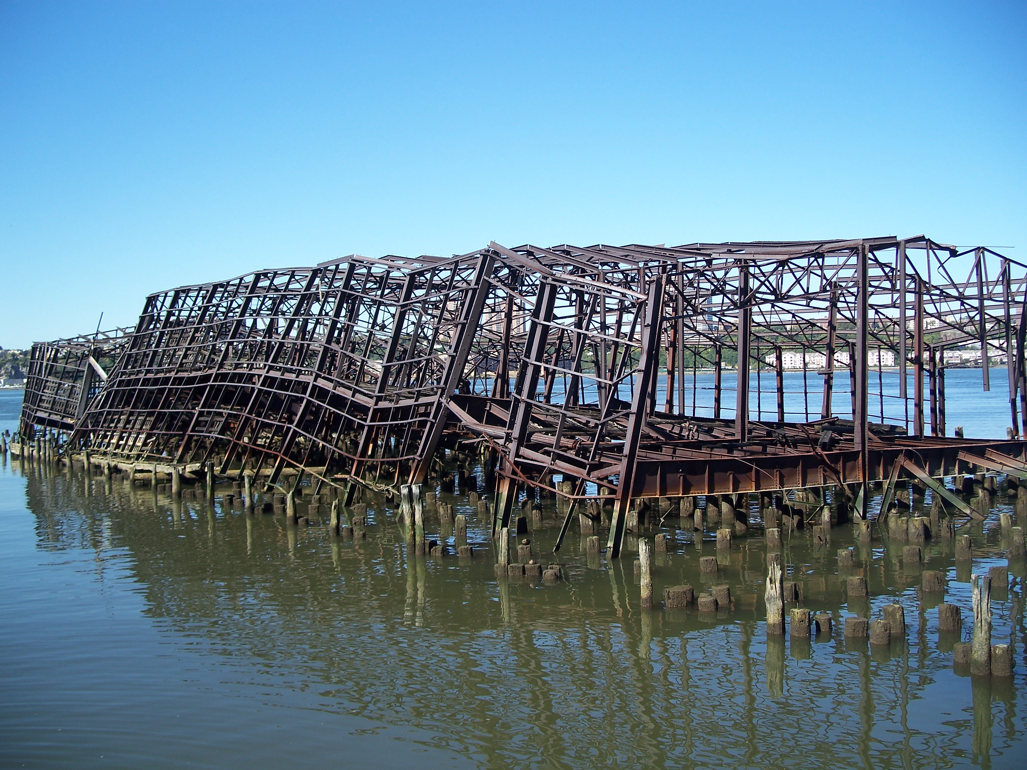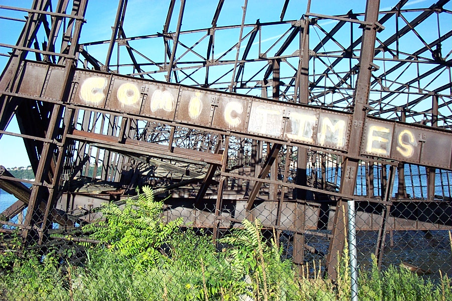 The twisted remains of two large lighterage (hand-loaded cargo) pier warehouses used to sit at the south end of the 60th Street Railyard waterfront. The more erect of the two was Pier D. A portion of the pier was removed in 2003, probably to dissuade urban explorers from attempting to climb onto the ruins at low tide. I believe Comic Times was a magazine.