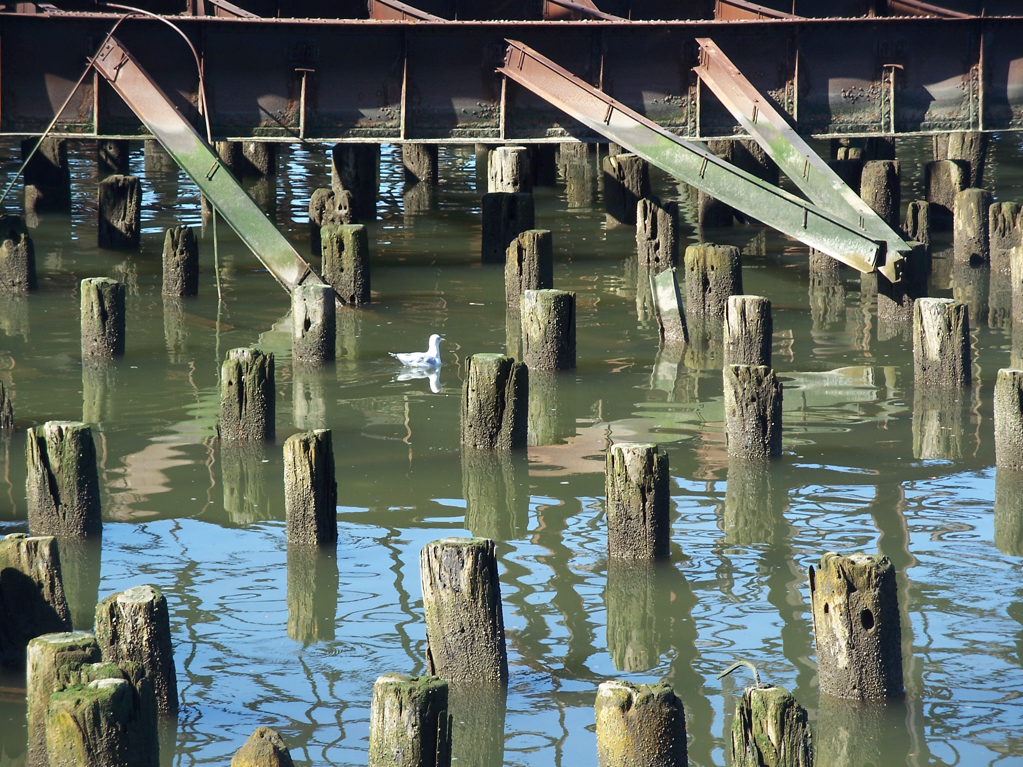 Sea gull swimming amont Pier D pilings