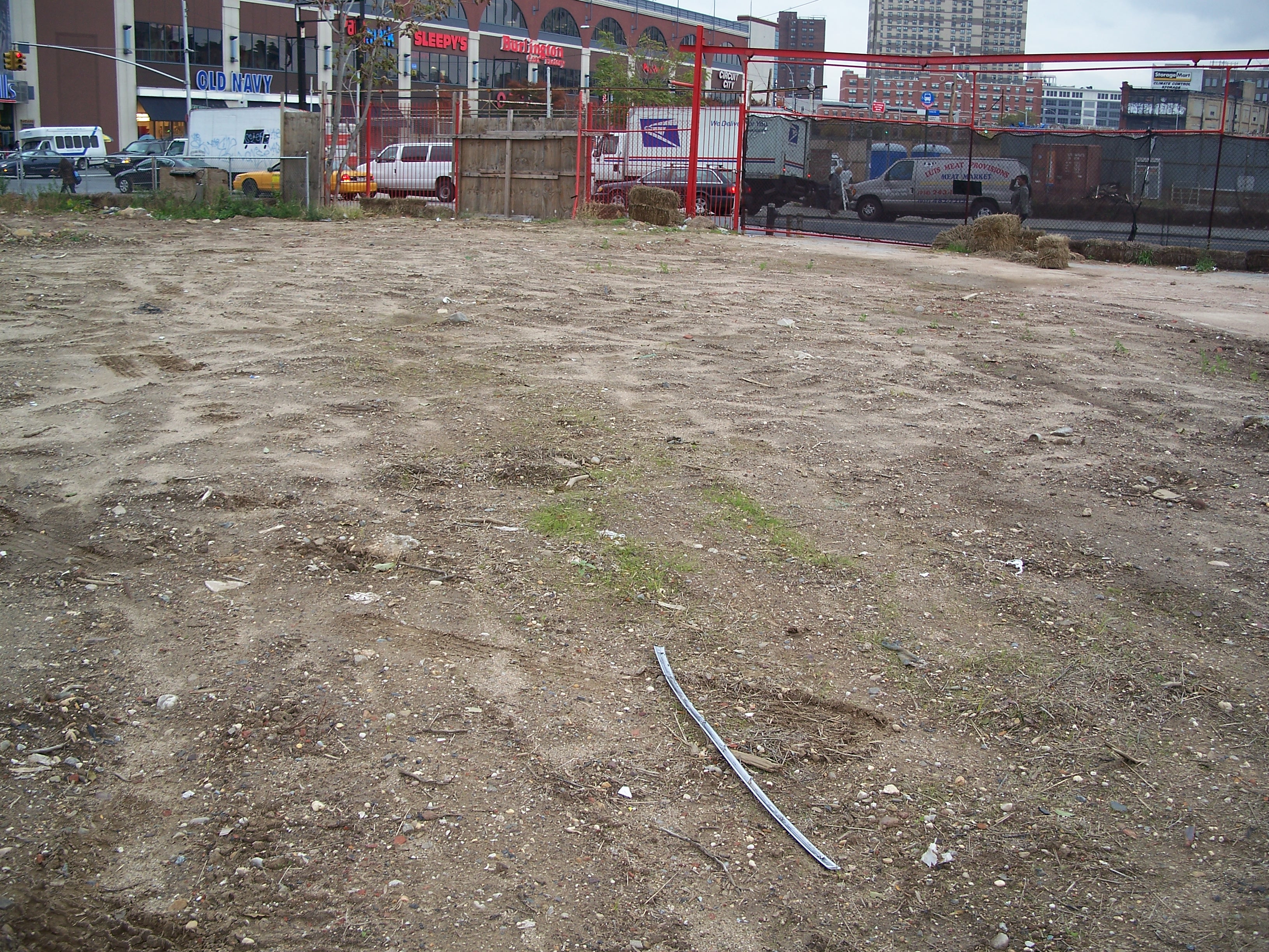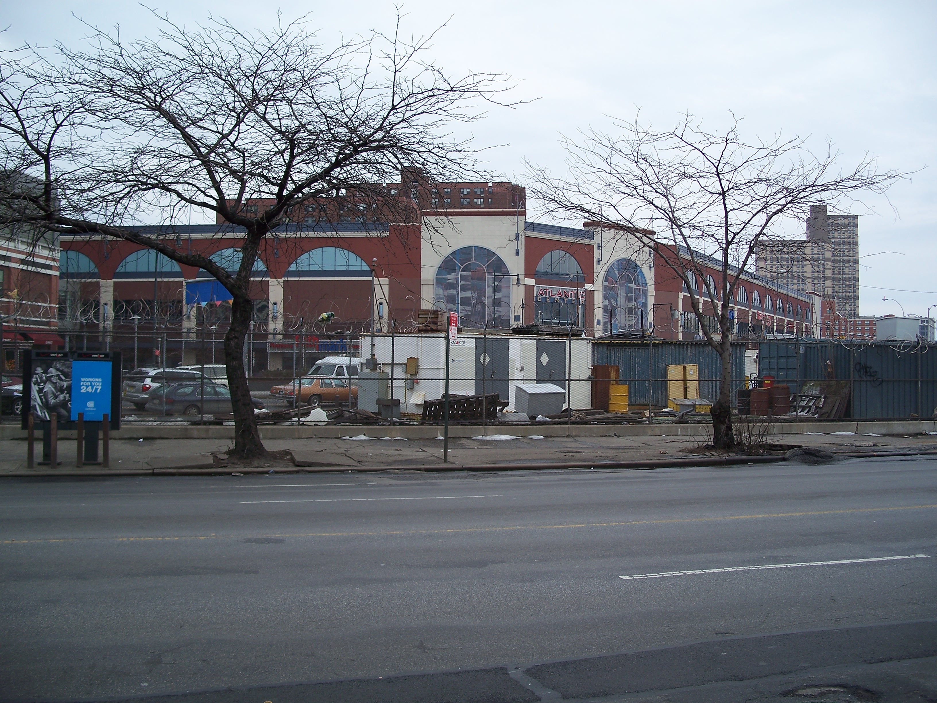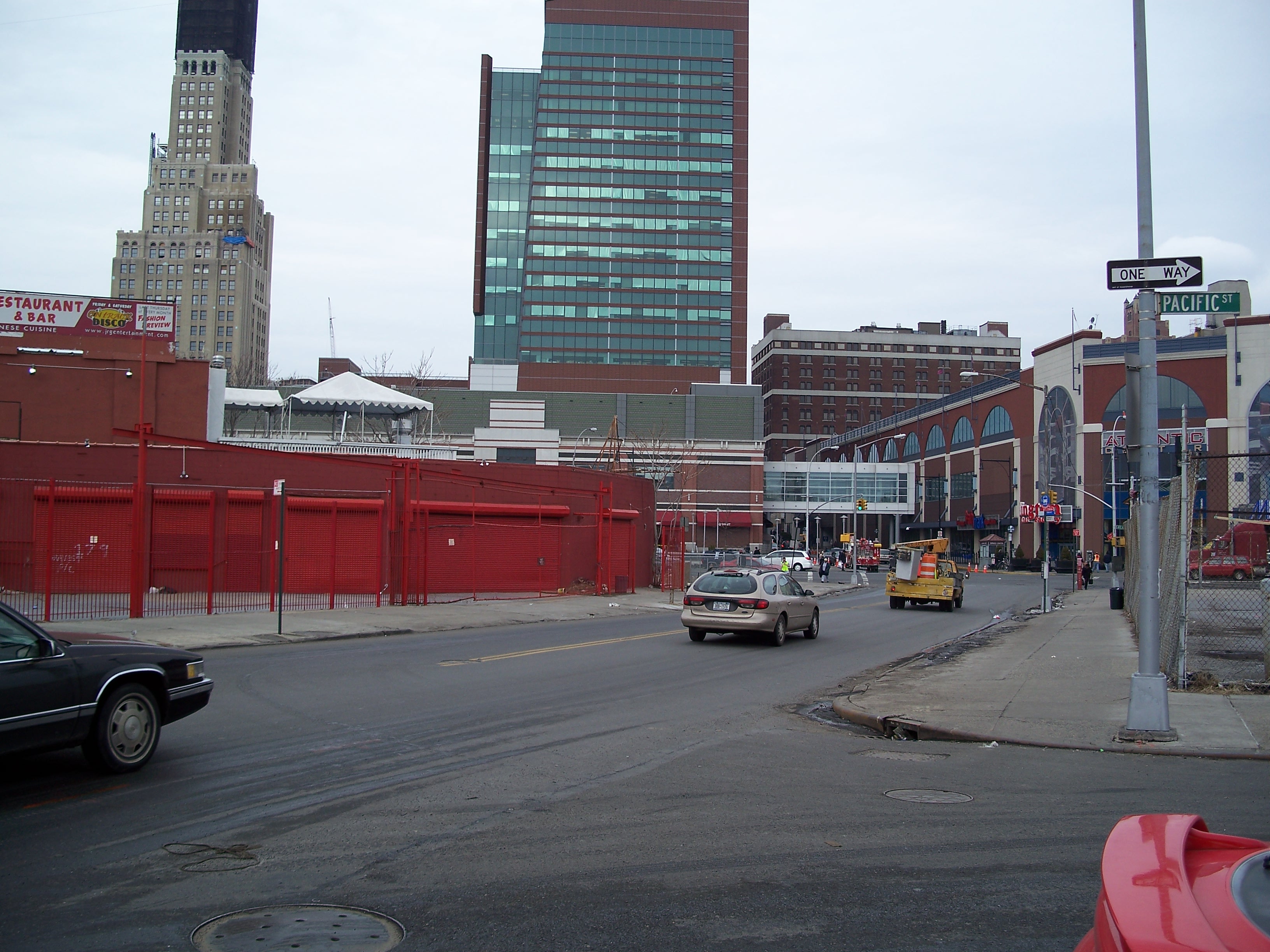 Just to the east was a desolate triangle of land used as parking and equipment storage for the LIRR. It was also the home of the JRG Bar and Restaurant. The vacant building next door to the restaurant bore a notice about being baited for rats, a sure precursor to demolition. This block will be combined with the adjacent blocks to the east as the location of the new arena. The short stretch of 5th Avenue between Flatbush Avenue and Atlantic Avenue will be closed.