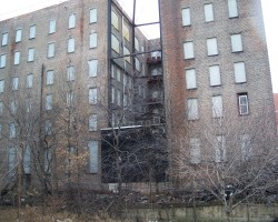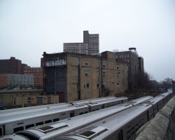 In the middle railyard block, the yard merges down to two tracks. The north side of this block includes two large, formidable looking warehouses.