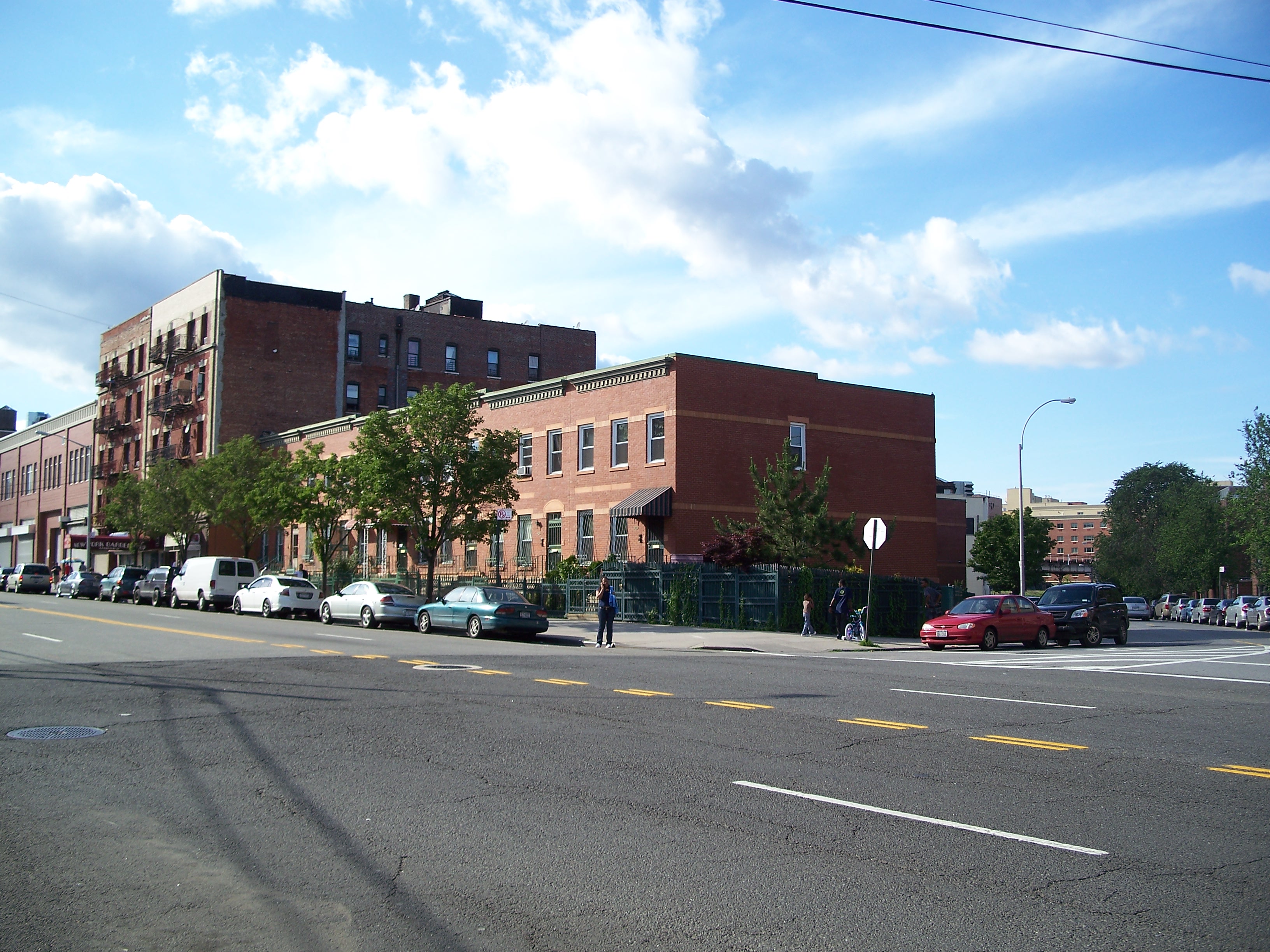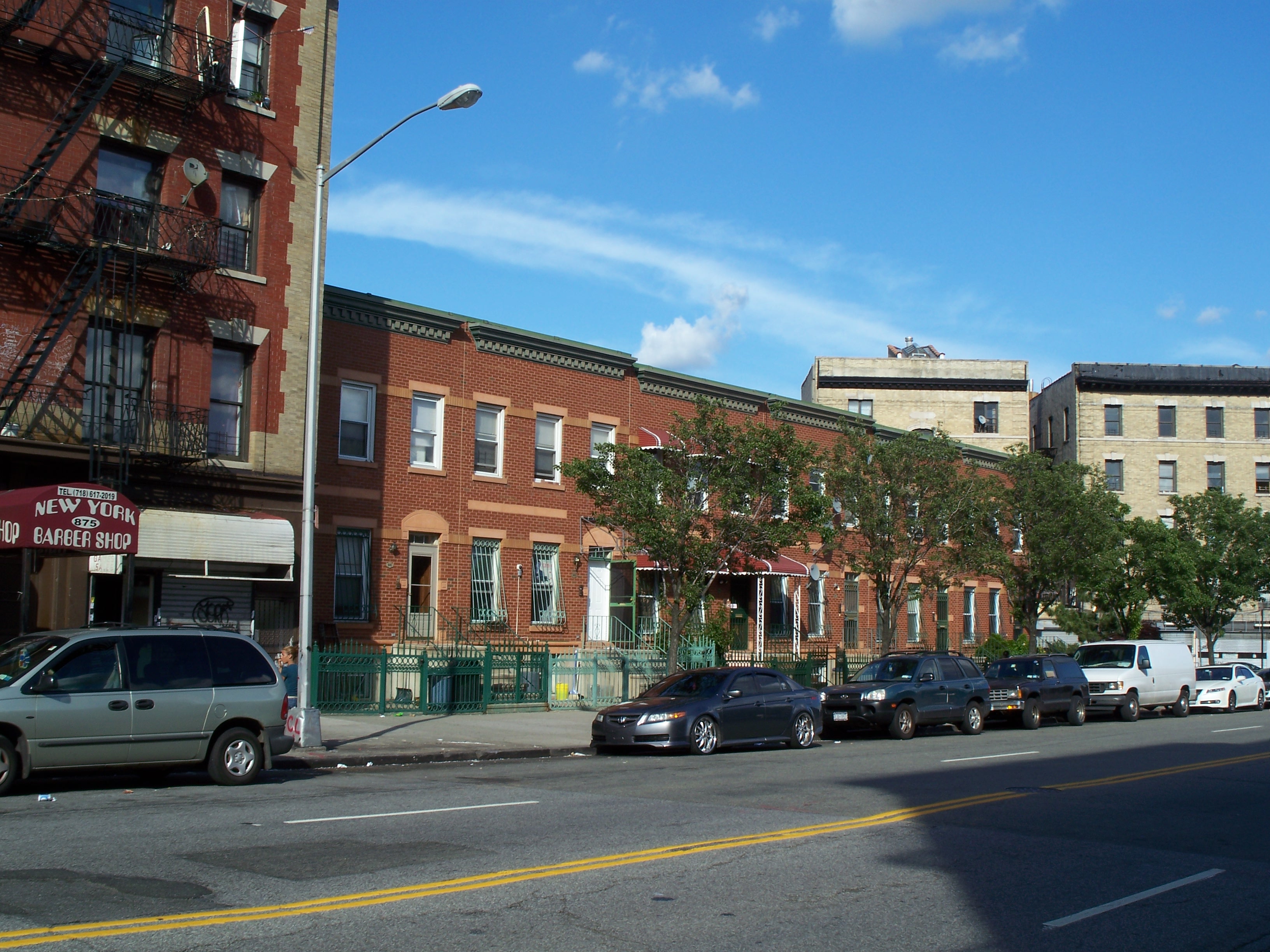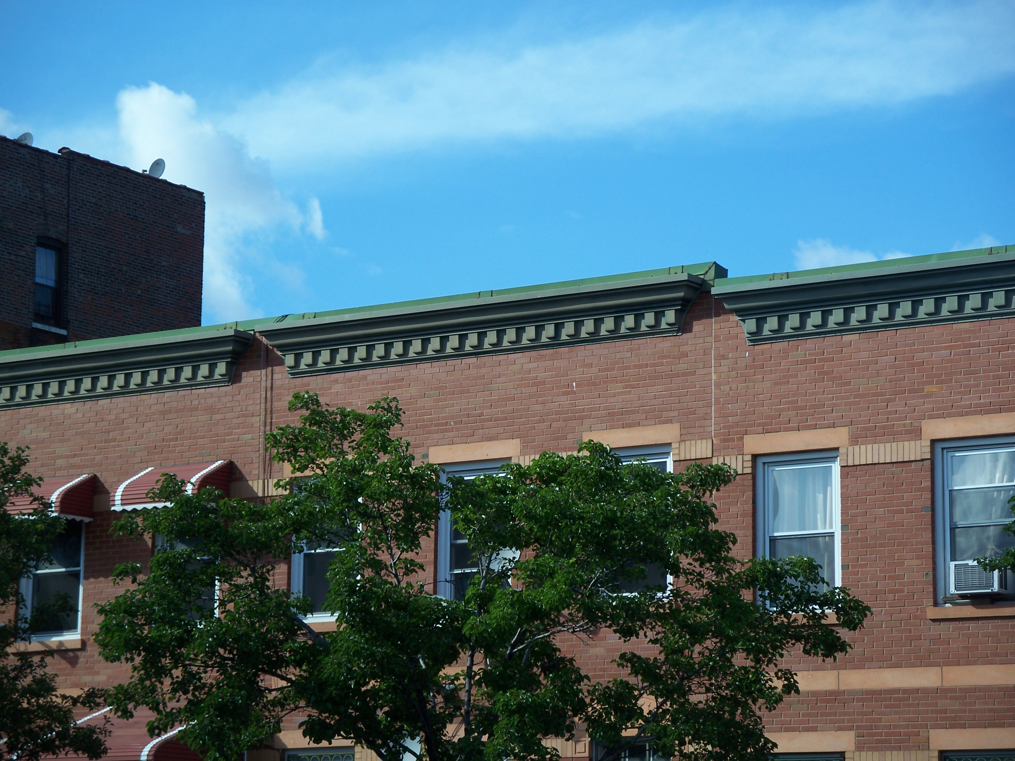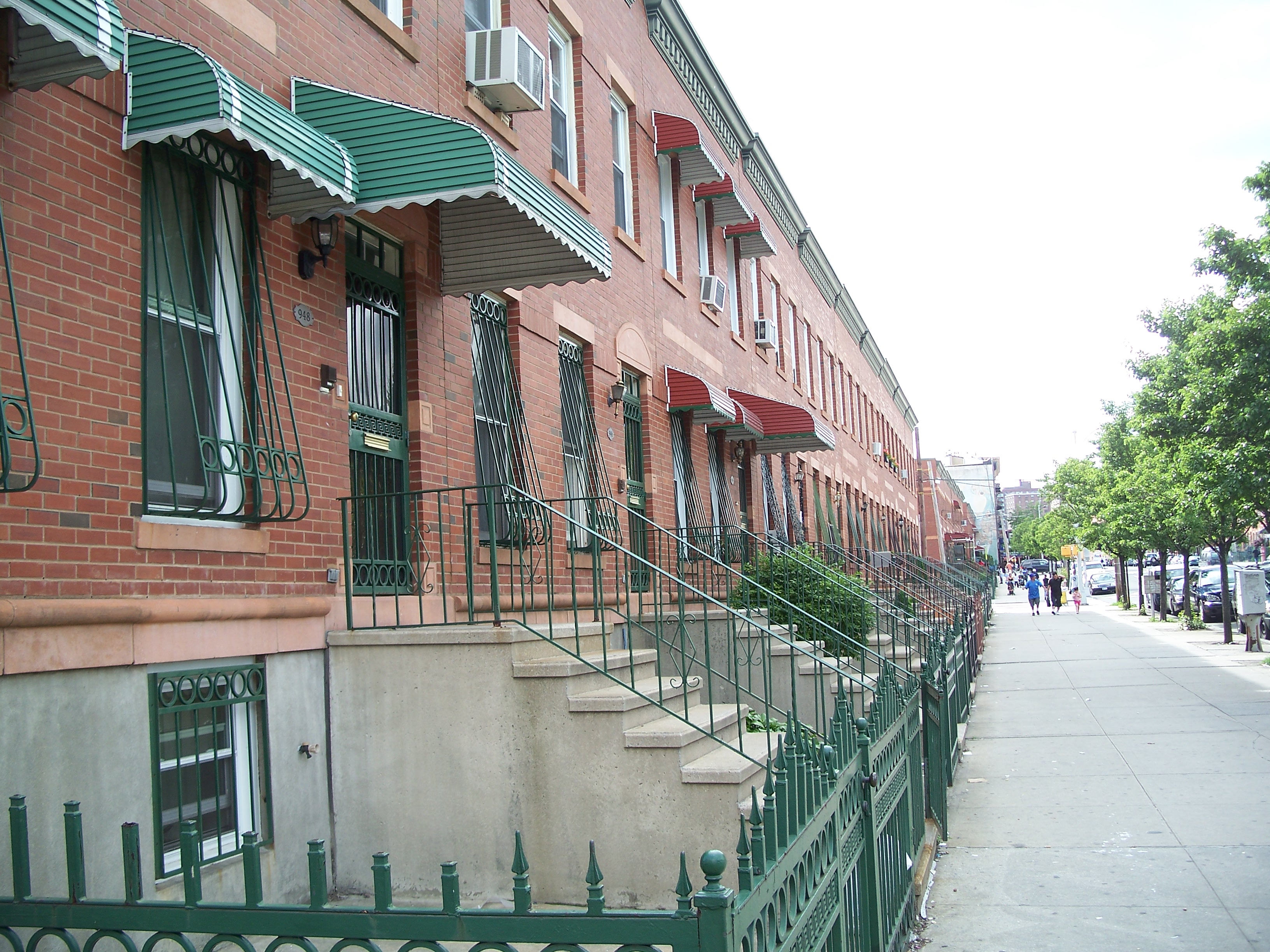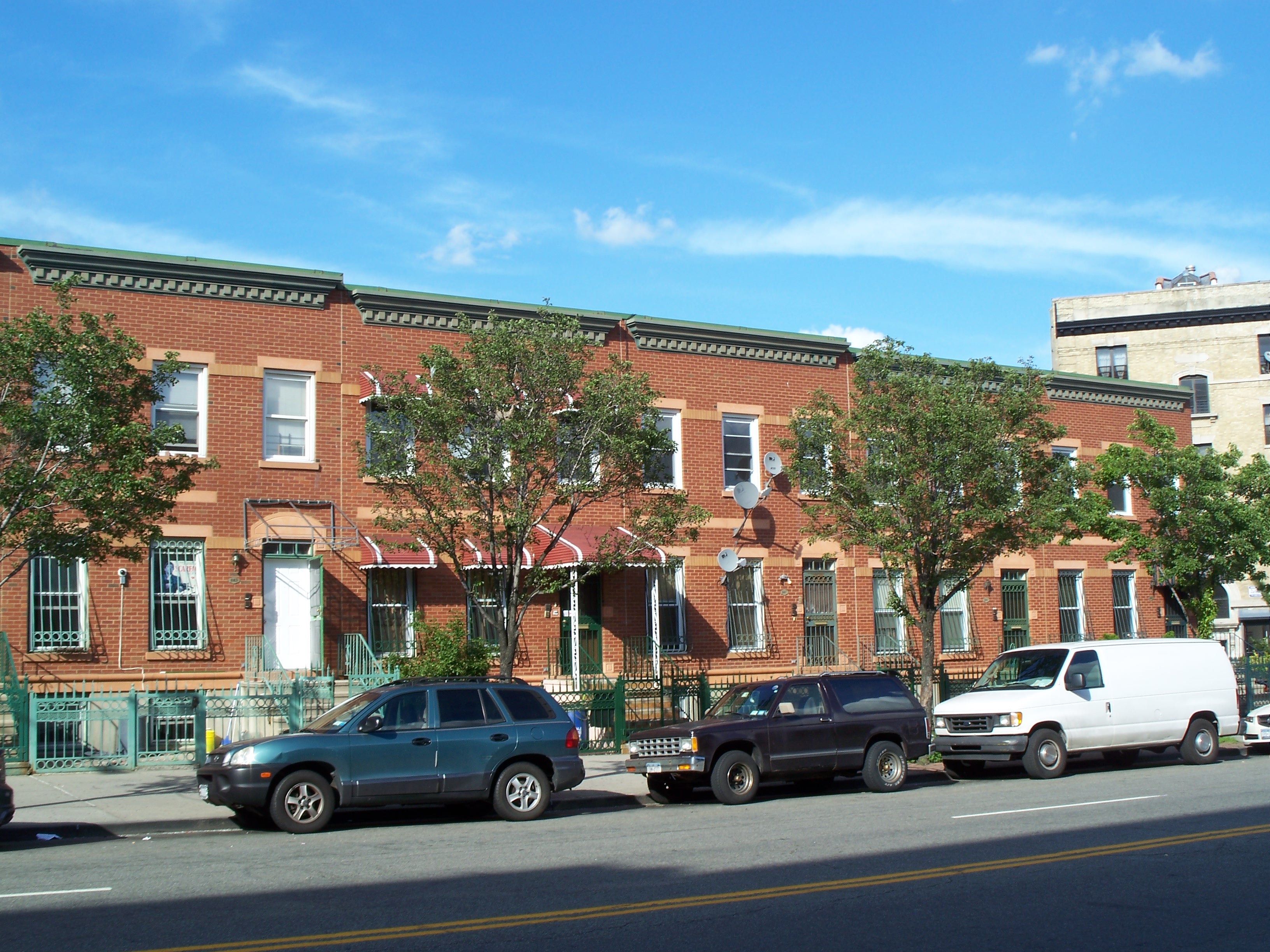 There are a pair of clumps of pseudo-period row houses on Longwood Avenue that were constructed around 1993. Unlike some of the buildings from the 1980s, these have brick exteriors and appear to be fairly solid in construction. The only unfortunate marrings are the inferior replica cornices that lack the detailing of the original styles and that are not meaningfully integrated with the building structure.