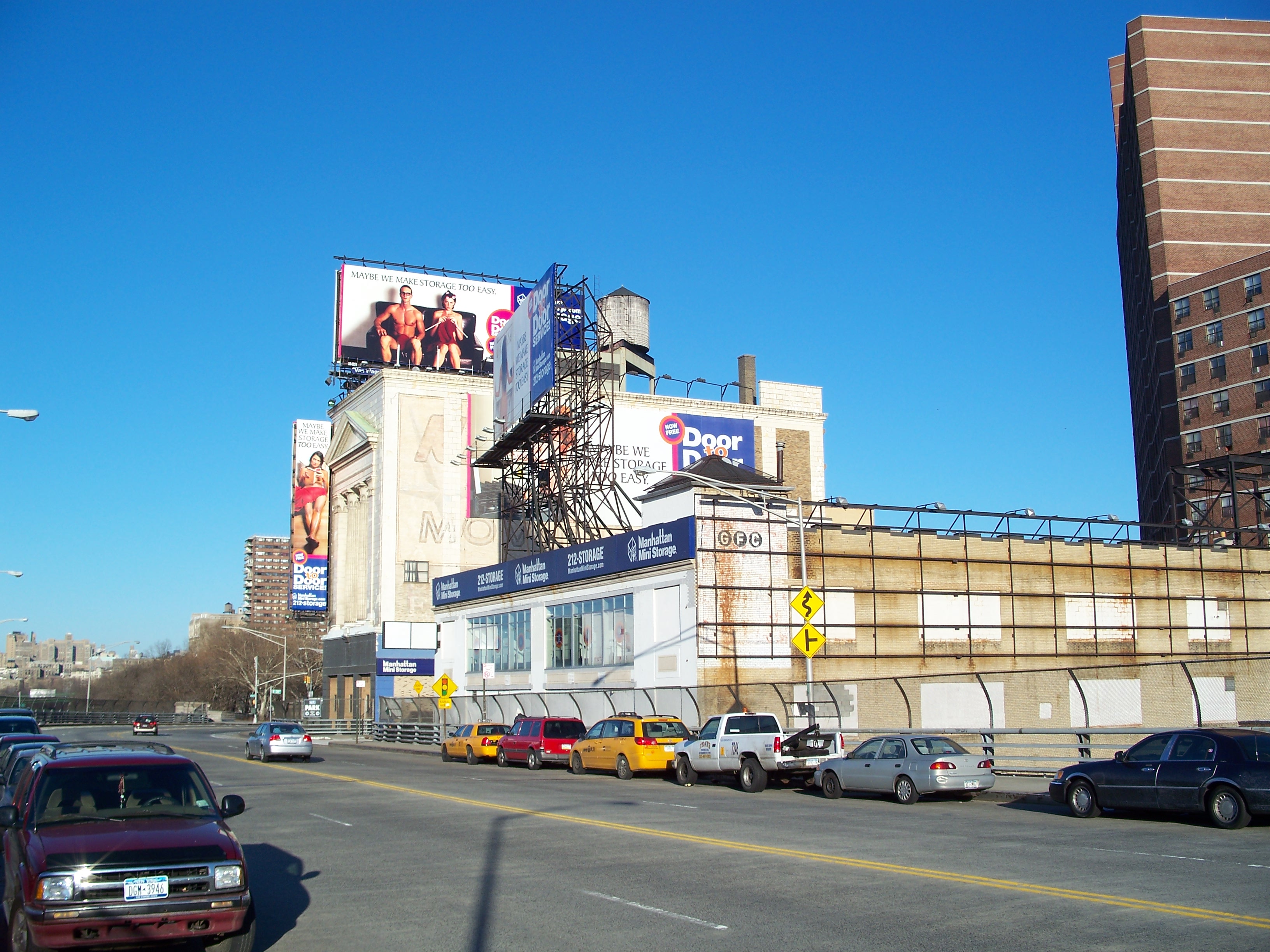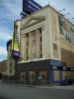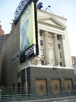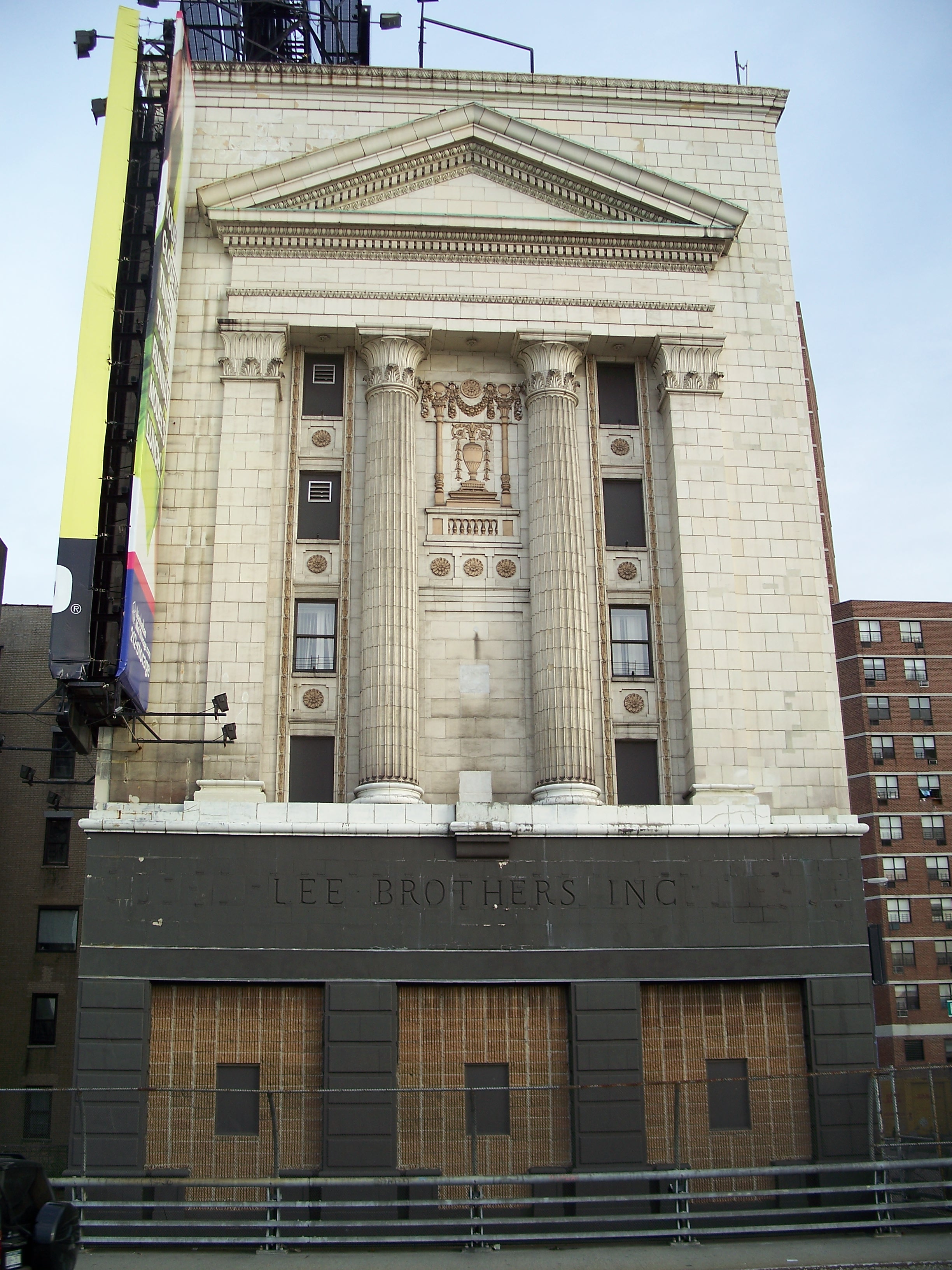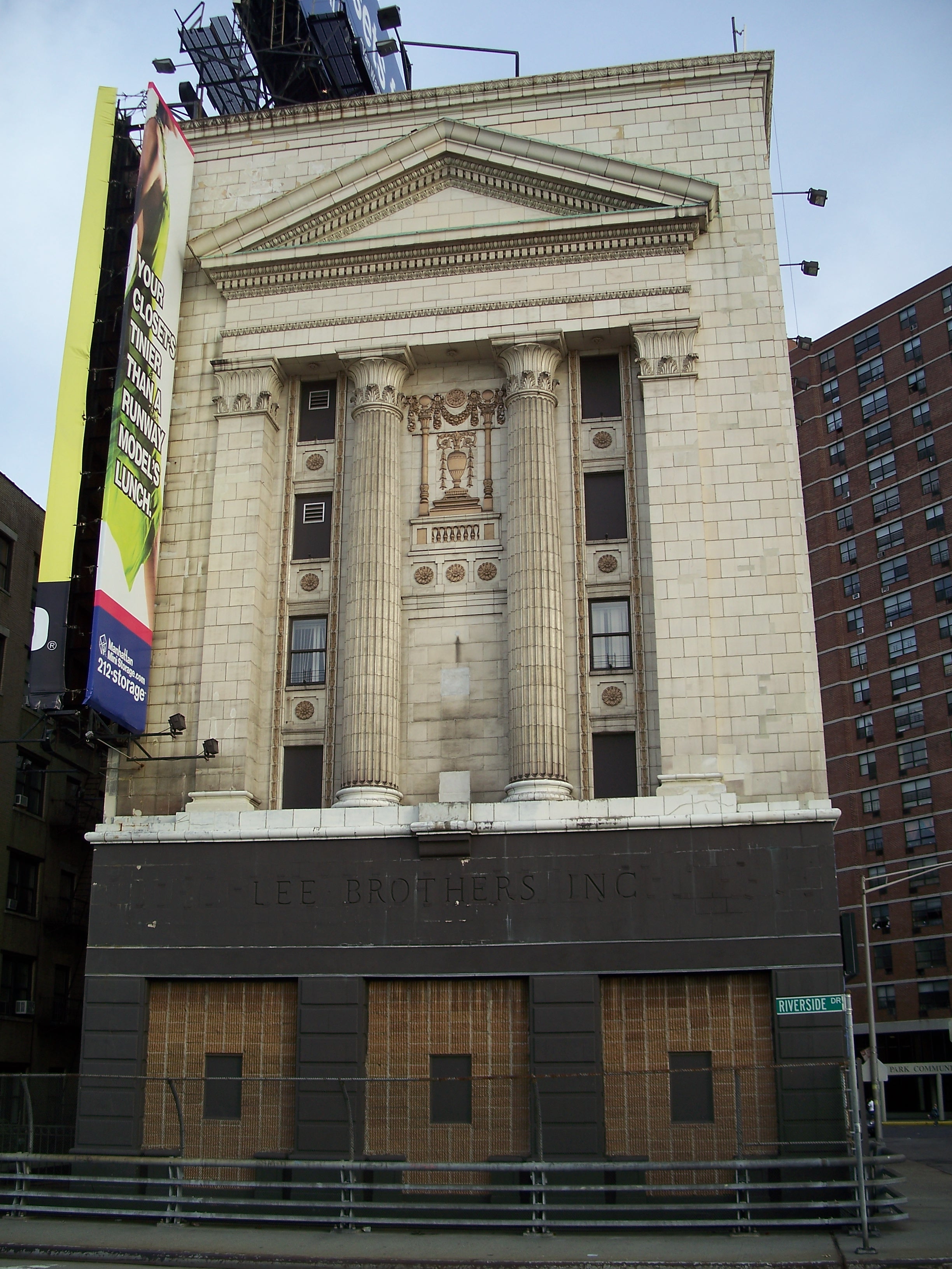 This incongruously columned building on 134th Street at Riverside Drive is just to the south of the Columbia development area, but is notable as an eye-catcher just above the Henry Hudson Parkway. It was originally built as a furniture warehouse by the Lee Brothers in 1929 on a design by George S. Kingsley, who designed several other "historically-inspired" warehouses in Manhattan and around the Midwest. Its thick concrete and steel walls contain over 1,000 storage rooms on 14 floors, with around half of the floors below street level and a loading dock on 134th street. (reference)