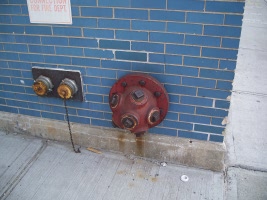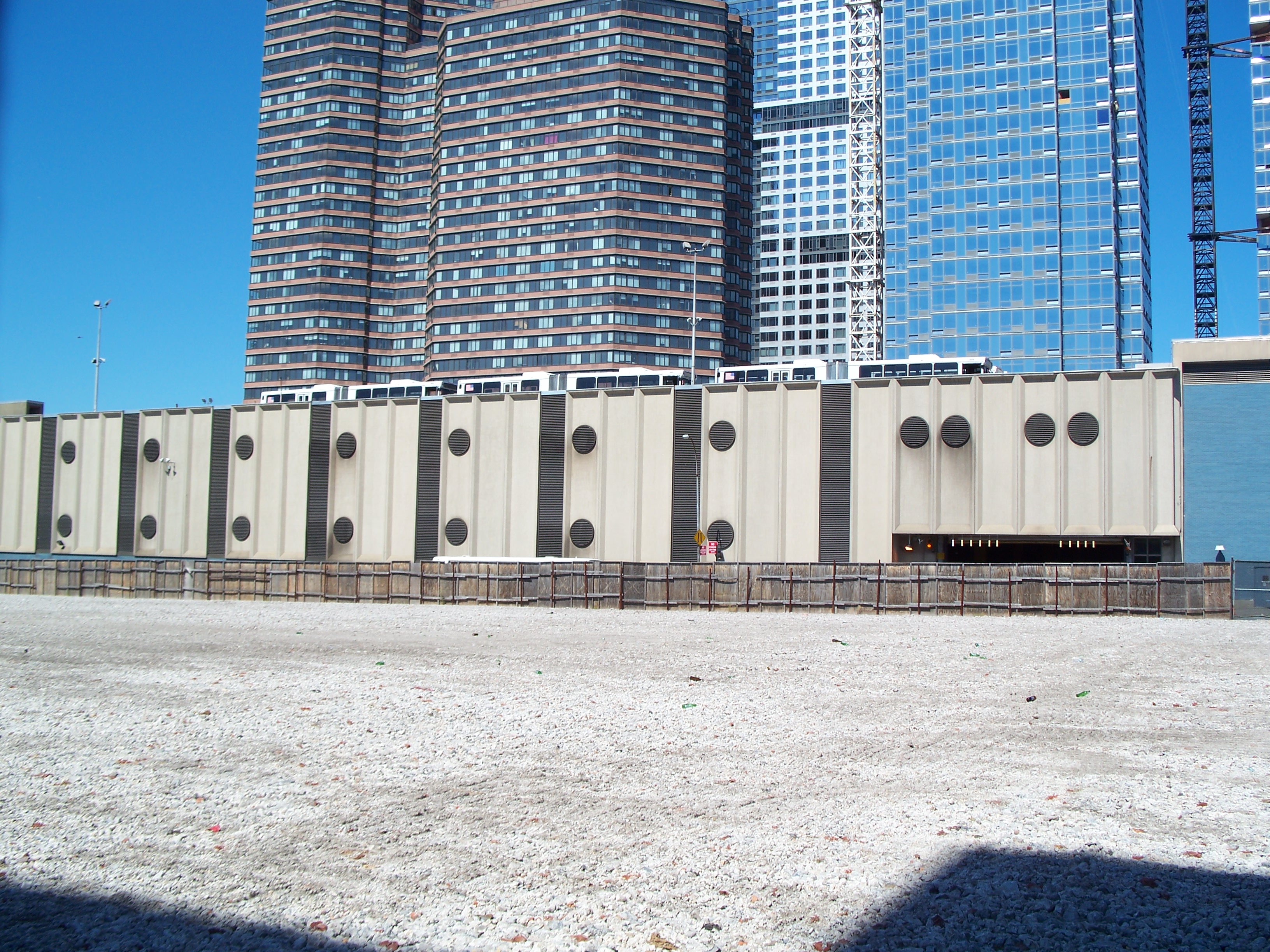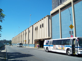 601 West 40th Street is the Metropolitan Transit Authority's Michael J. Quill Bus Depot. In the 1920s, this lot was home to stockyards, slaughterhouses and garages. By 1933, at least one auto repair shop called the block home. By 1964, these establishments had relinquished the block for an open transit yard. In the late 1960s, Greyhound Bus Lines built this cheerful modernist structure to house offices and a bus depot. The building was sold to the New York City Transit Authority in 1996 and reopened as a depot for city buses in 1998. In 2000 it was renamed after one of the founders of the Transport Workers Union of America.