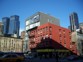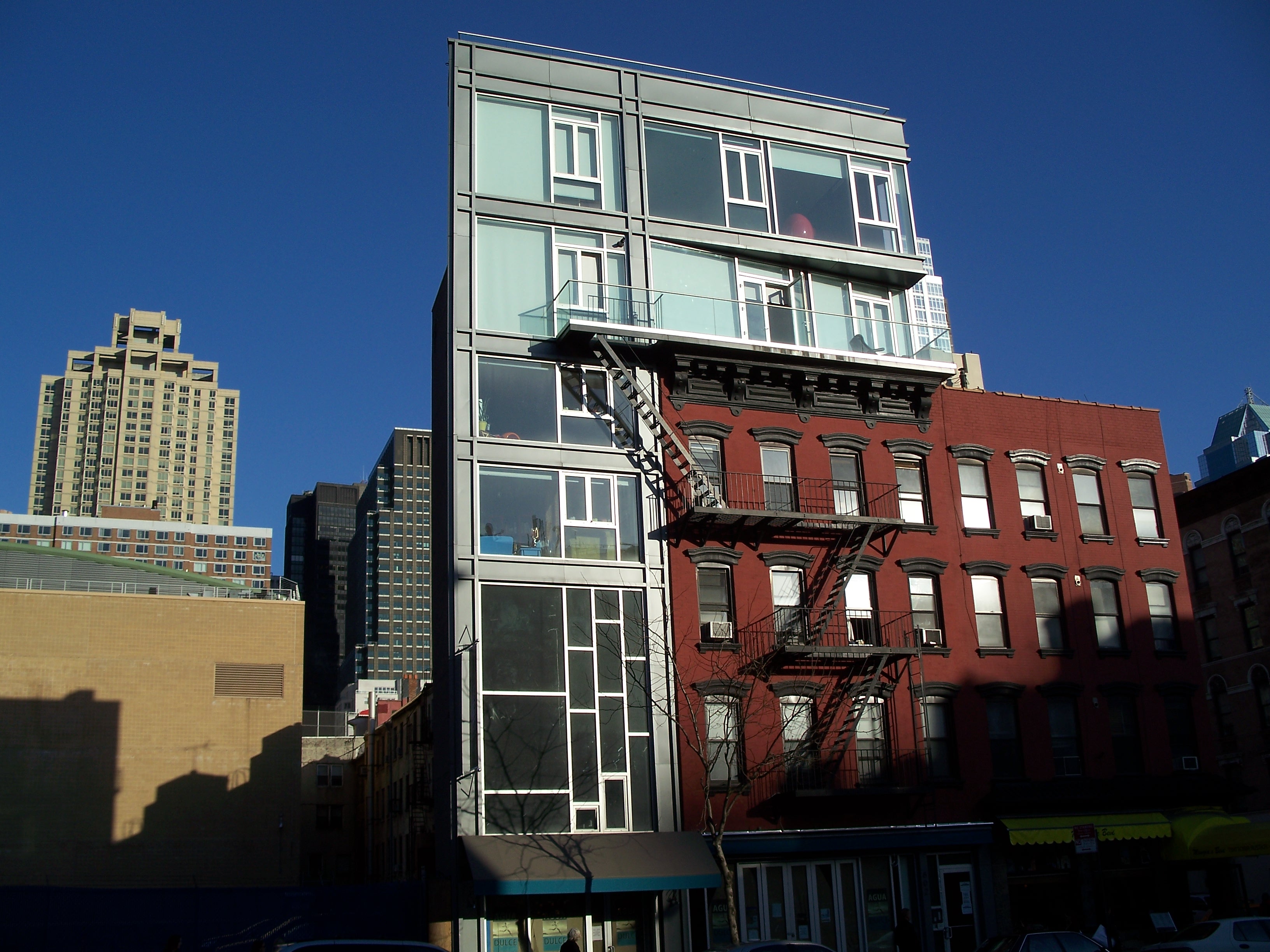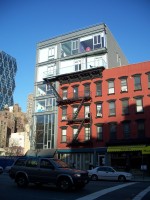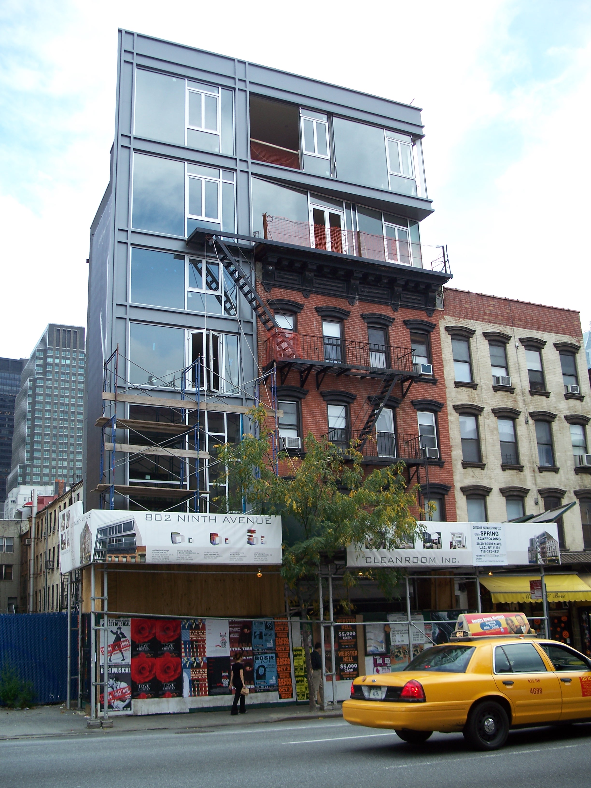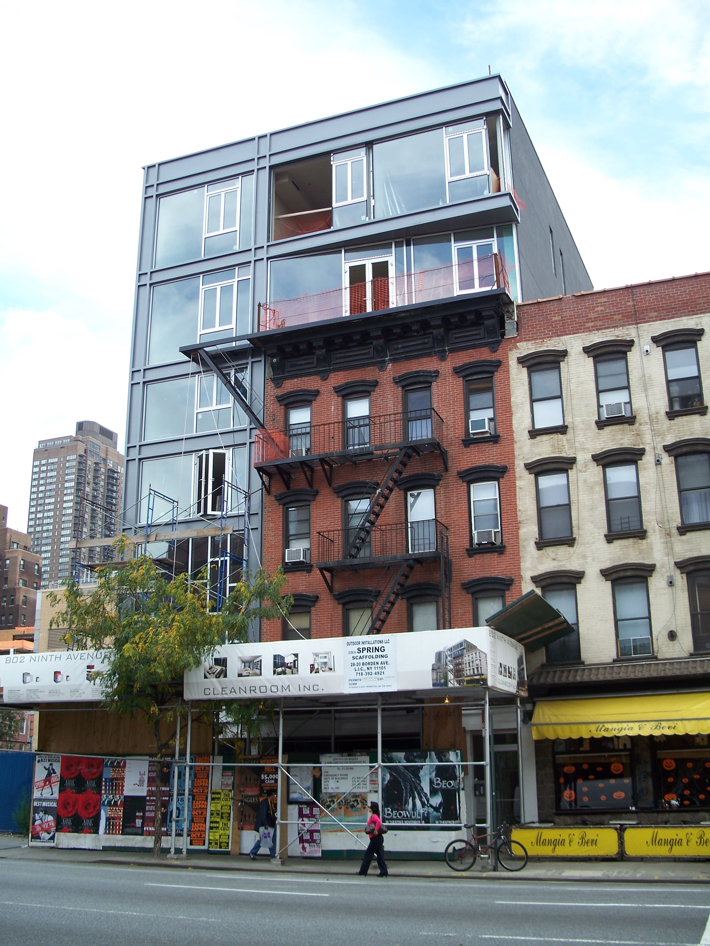 802 Ninth Ave wins my award for 2006/2007's most absurd new structure on Ninth Ave. With a sliver of land next to an old walk-up, rather than tearing down the brownstone or using air rights to build a taller tower, the new glass building oozes over the top of the older structure, creating a hideous clash of styles that just screams of a tasteless grab for cash. Oddly, this abomination sits next to a completely vacant lot that, I think, is owned by the MTA and in 2007 was being used as a parking lot. Undoubtedly, it will be given away to a developer at some point to build another cancerous glass building of overpriced luxury apartments for rich people, only slightly less contemptable than it's bizzare-looking predecessor next door.
