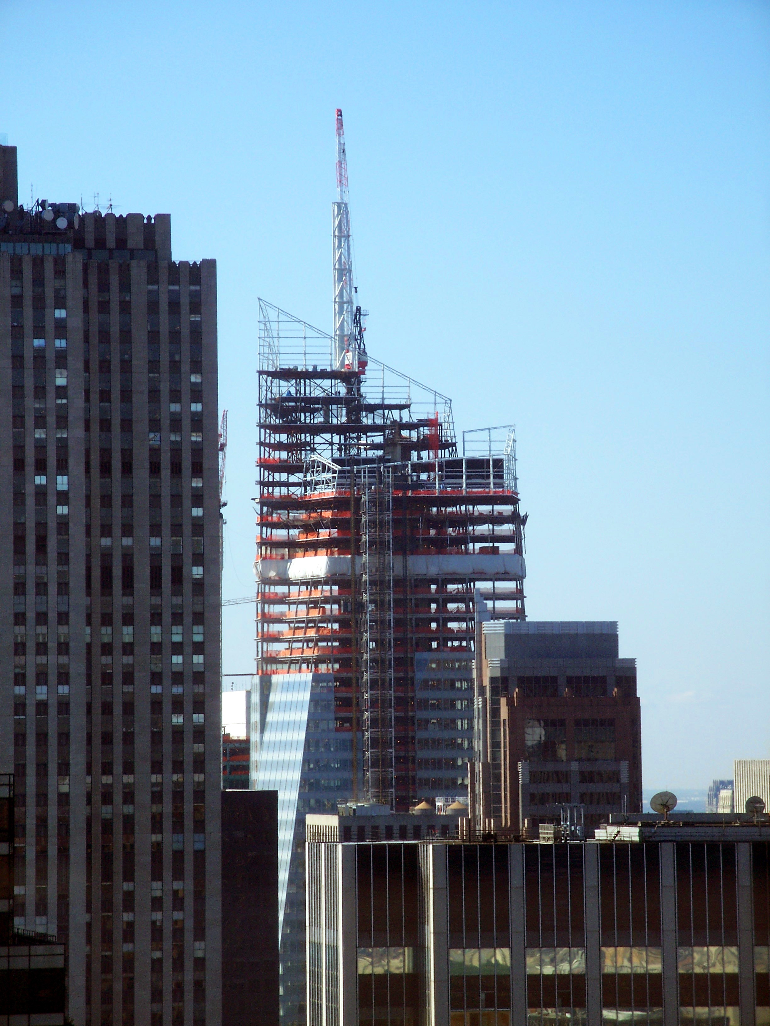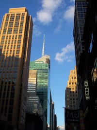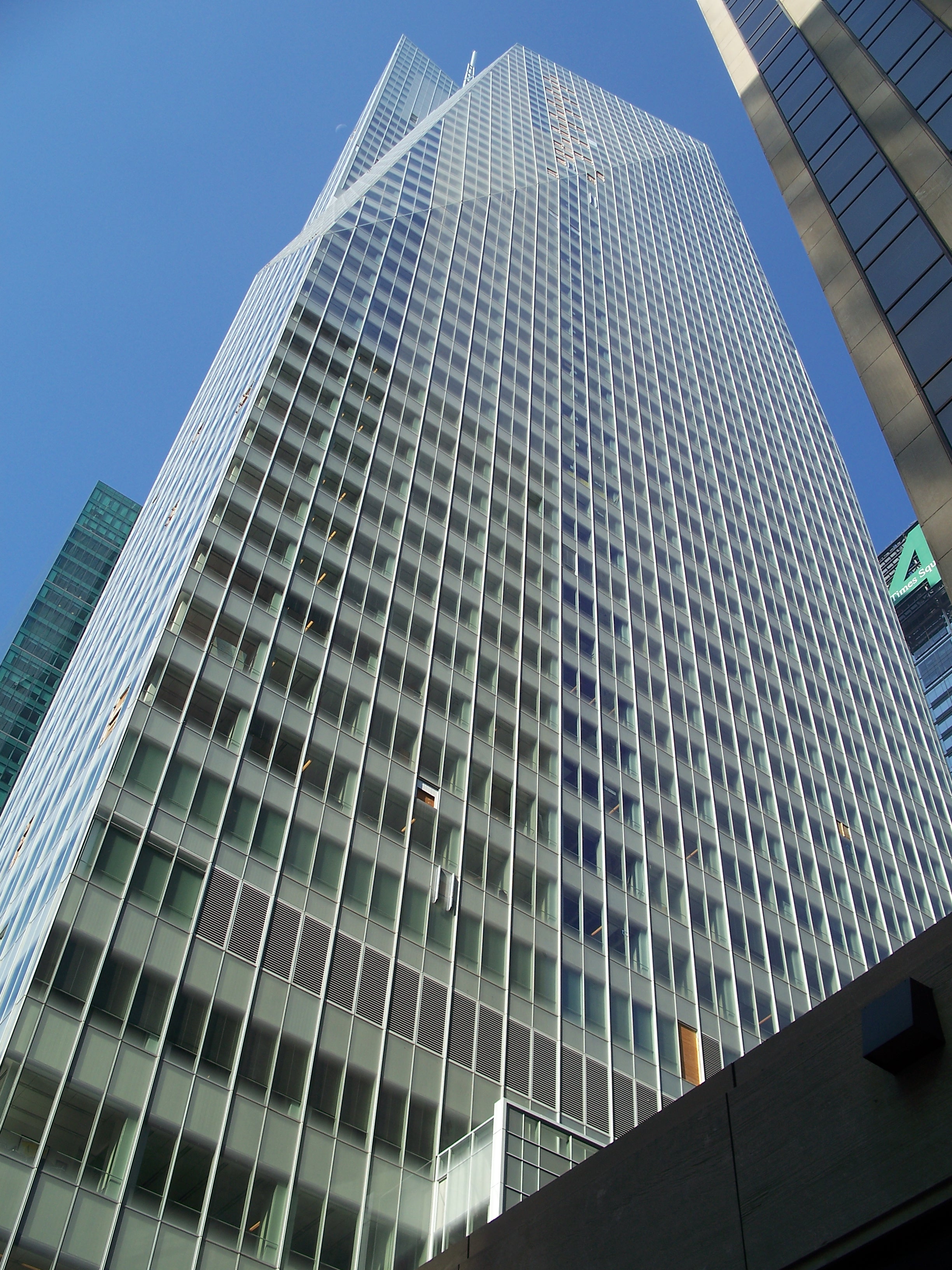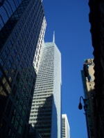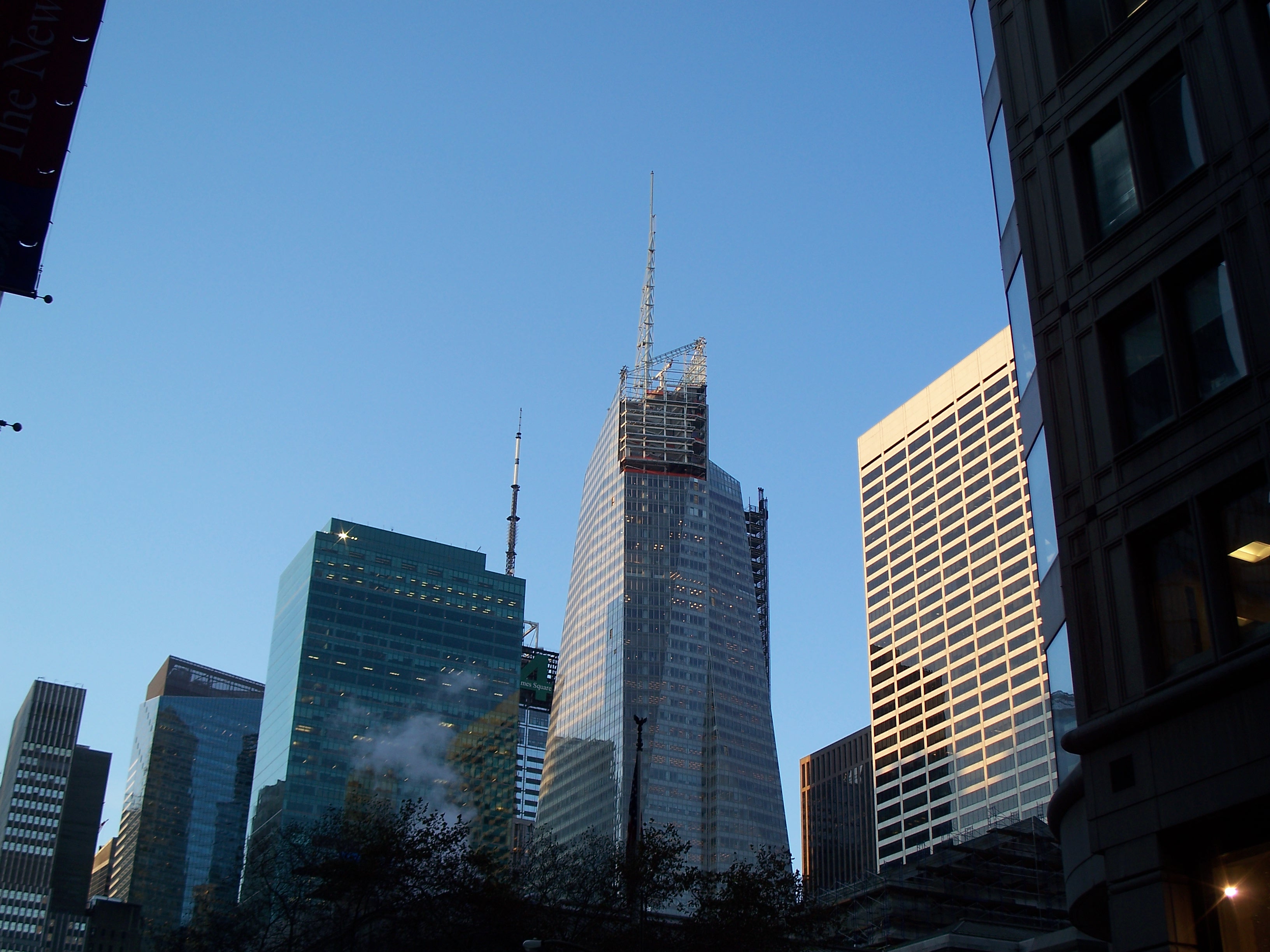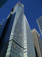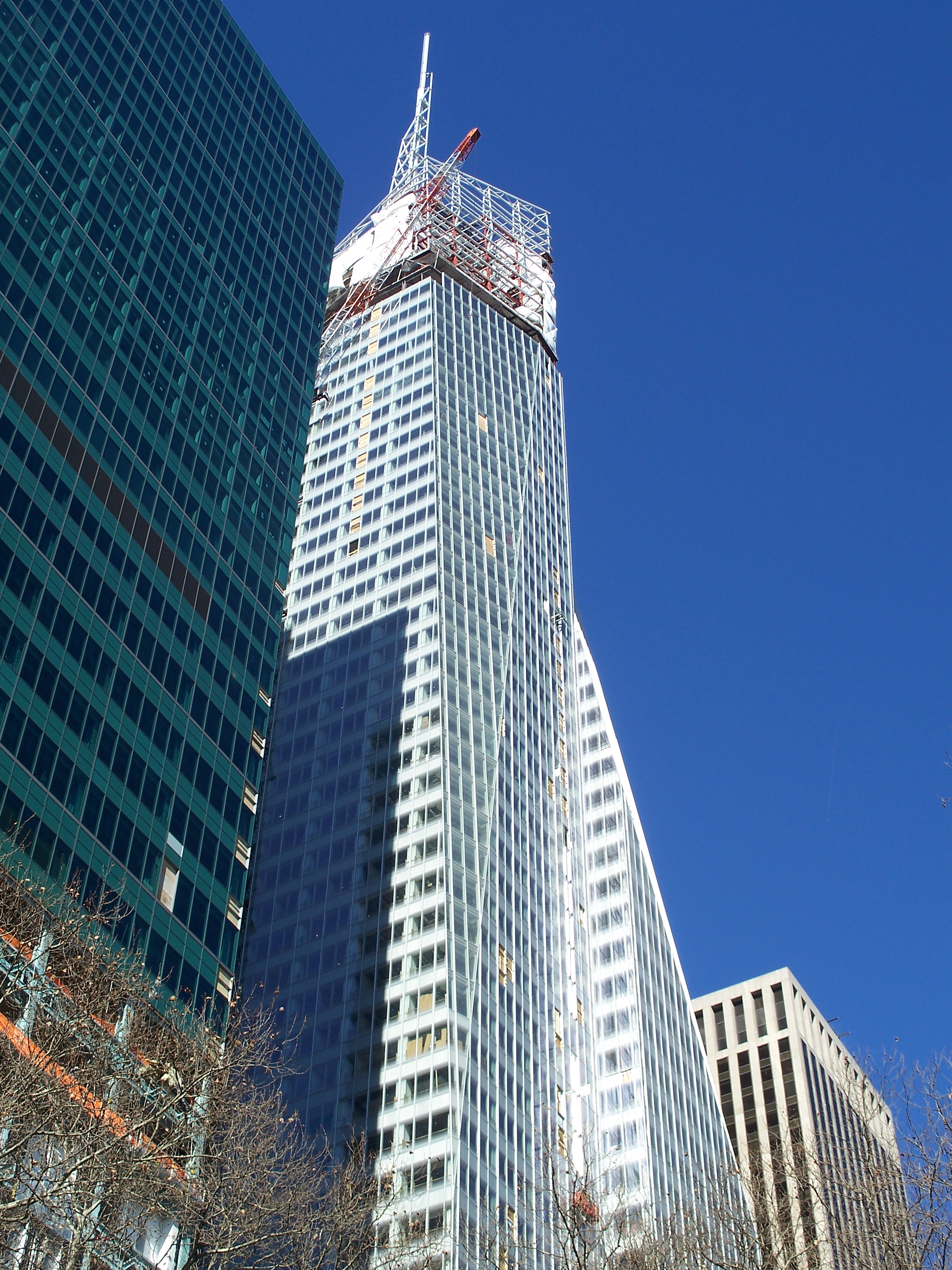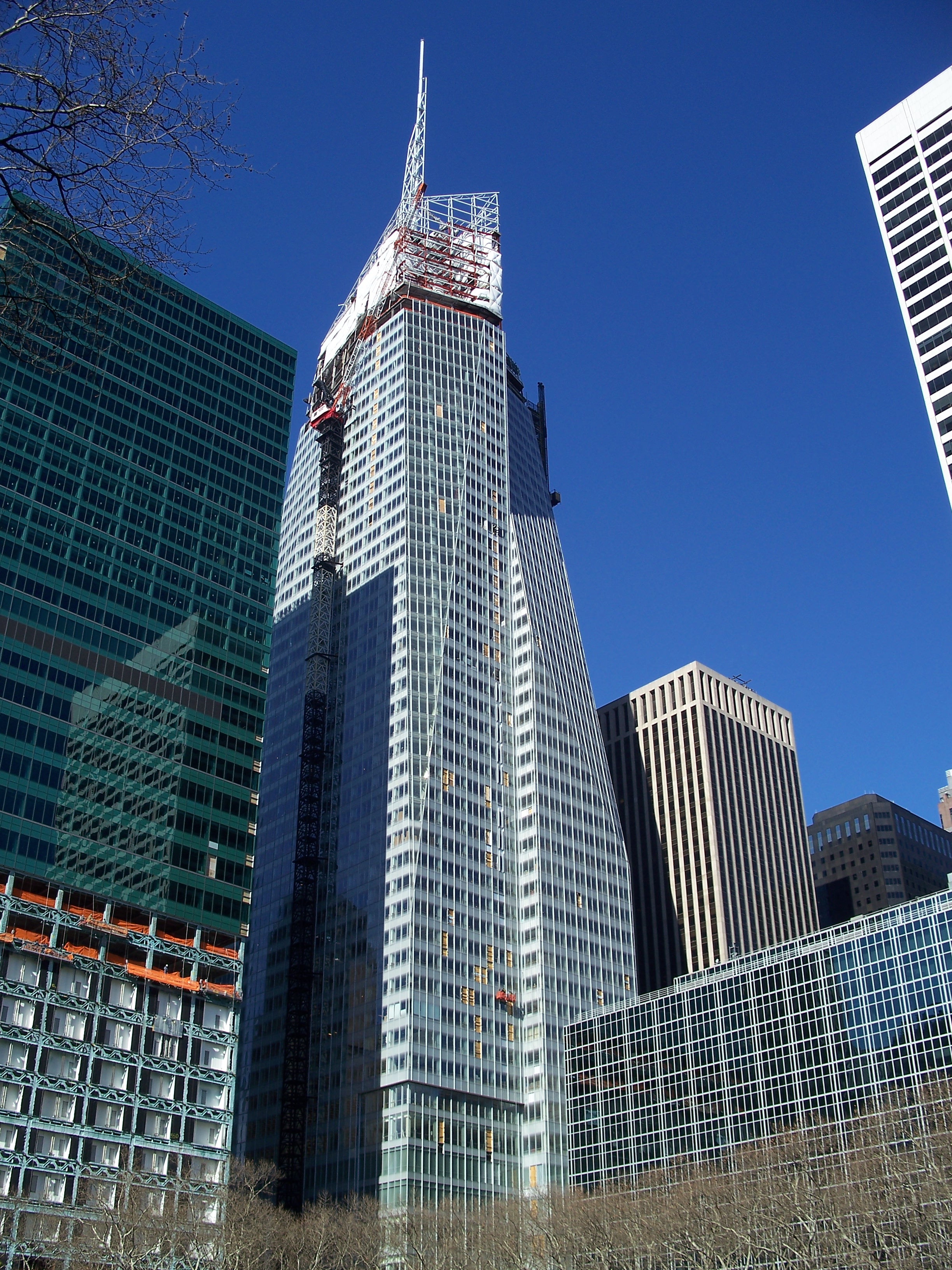 The Bank of America Tower at One Bryant Park was designed by Cook+Fox Architects and is scheduled for completion in 2009. The 54-story building has around 2.1 million square feet of office space and stands 1,200 feet tall at its architectural spire, making it, arguably, the second tallest building in New York City. (BofA press release)