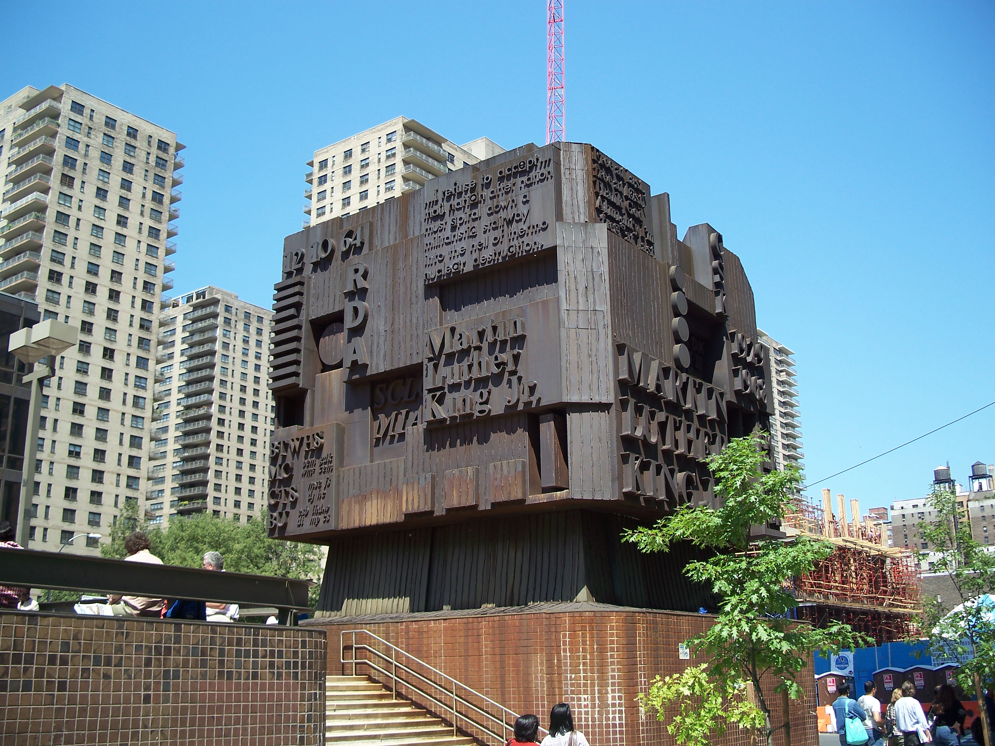 Perhaps the most desirable aspect of the whole mess is a cubist monument to the slain civil rights leader on the corner of 66th Street and Amsterdam. Although the metal has the appearance of rusted cast iron, it is actually made of Cor-ten steel - an alloy that gives a rusted appearance but remains stable and uncorroded.