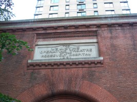 The William J. Syms Operating Theatre was a surgical building added to Roosevelt Hospital in 1892. The Romanesque building was designed by W. Wheeler Smith and named after the retired gun merchant who (turning swords to scalpals) paid for it. The building was dominated by a large operating room surrounded by semicircular tiers containing 184 seats for medical students (hence, the name theatre). The building was converted to offices in 1941 and the entire Columbus Avenue frontage was sold to a developer in the late 1980s.