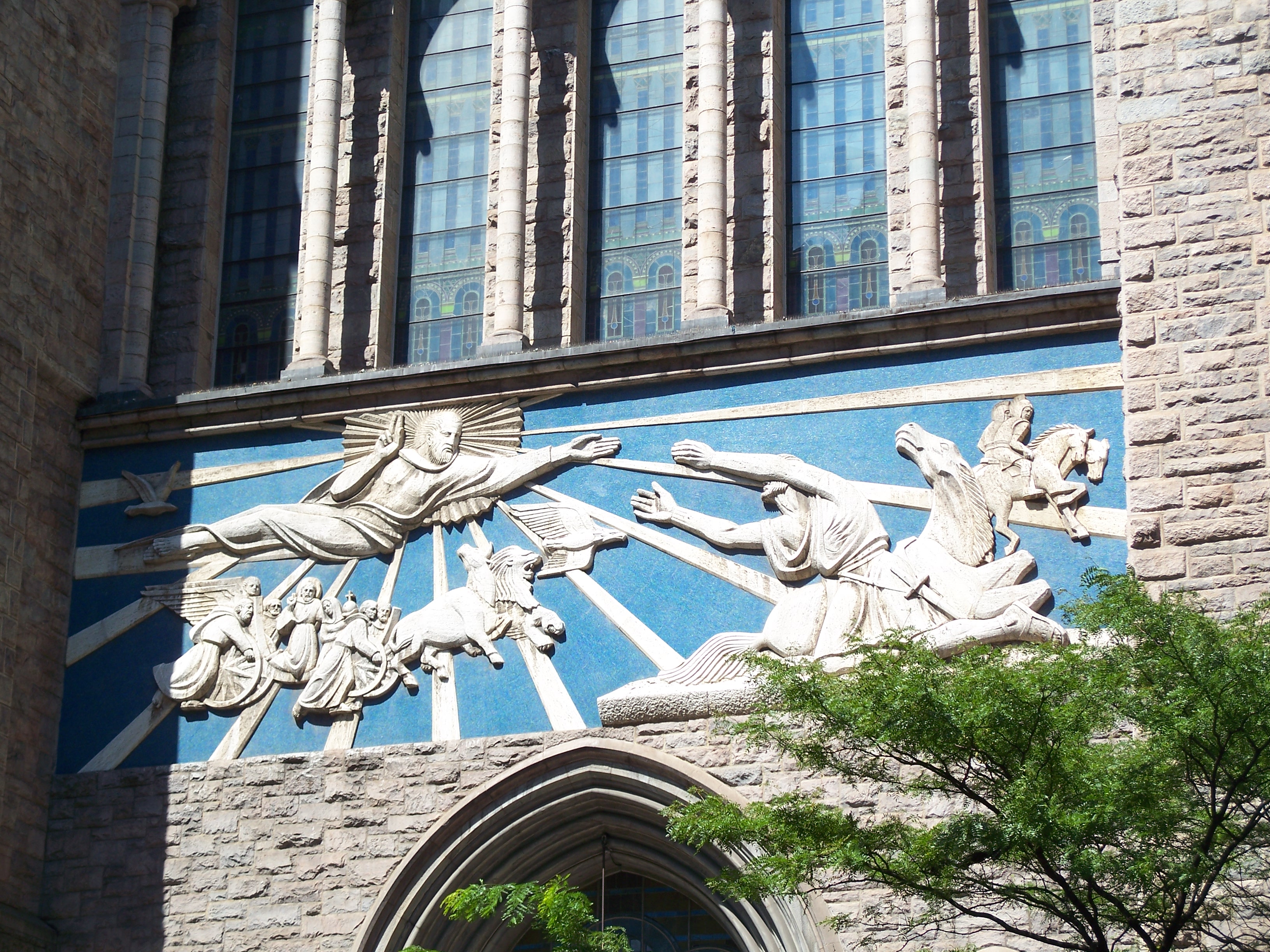 This parish was established in 1858 and assigned to Fr. Isaac Hecker, who was the driving force for construction of a new basilica. The church is 284 feet long, 121 feet wide and rises to 114 feat at the tops of the towers. The exterior is in 13th-century Old Gothic style and interior ornamentation was designed by American artists John LaFarge, Augustus Saint-Gaudens, Lumen Winter, Stanford White, and William Laurel Harris. The building is the mother church of the Paulist Fathers, a group of Roman Catholic priests who work as missionaries in the United States and Canada.