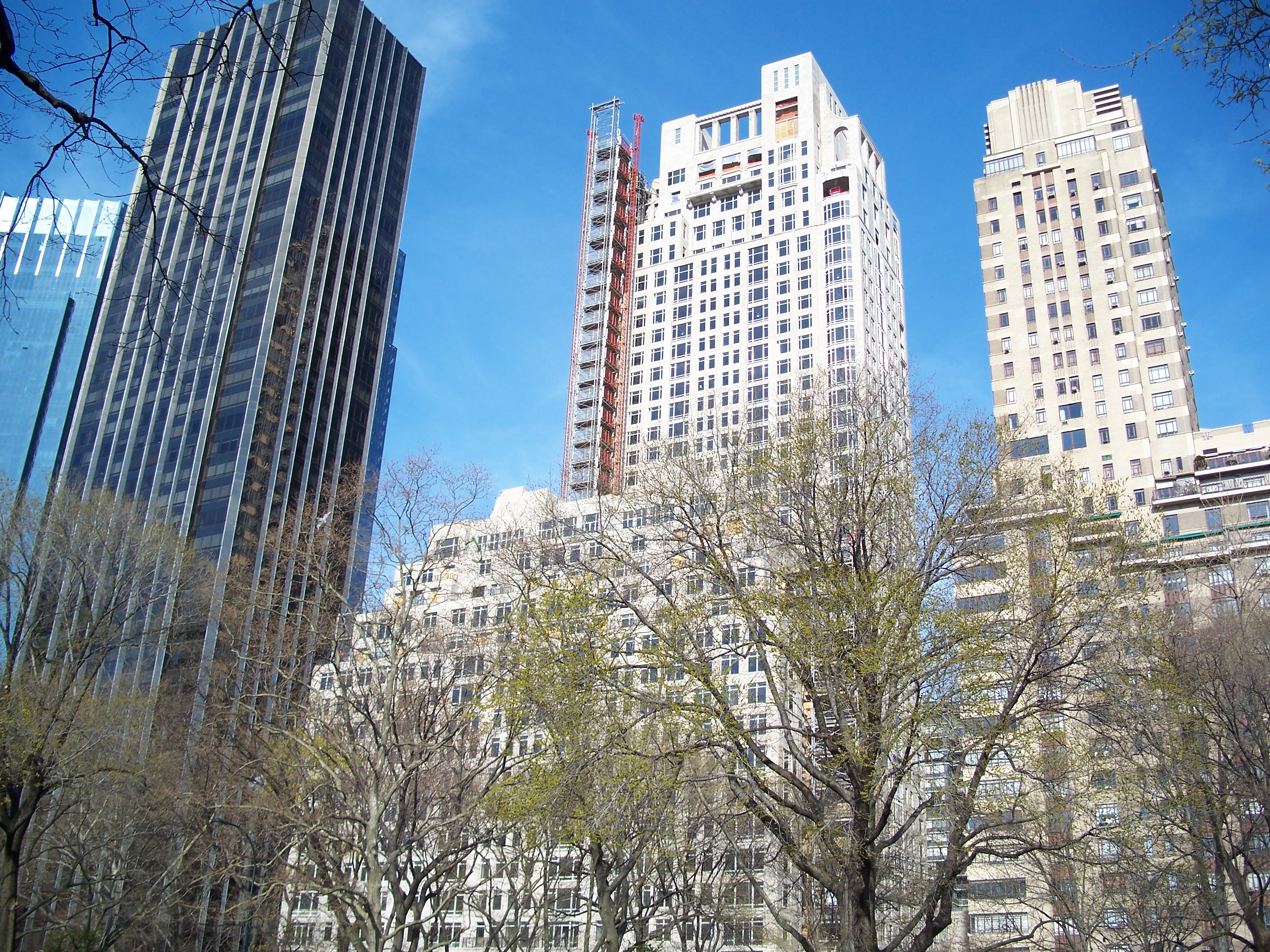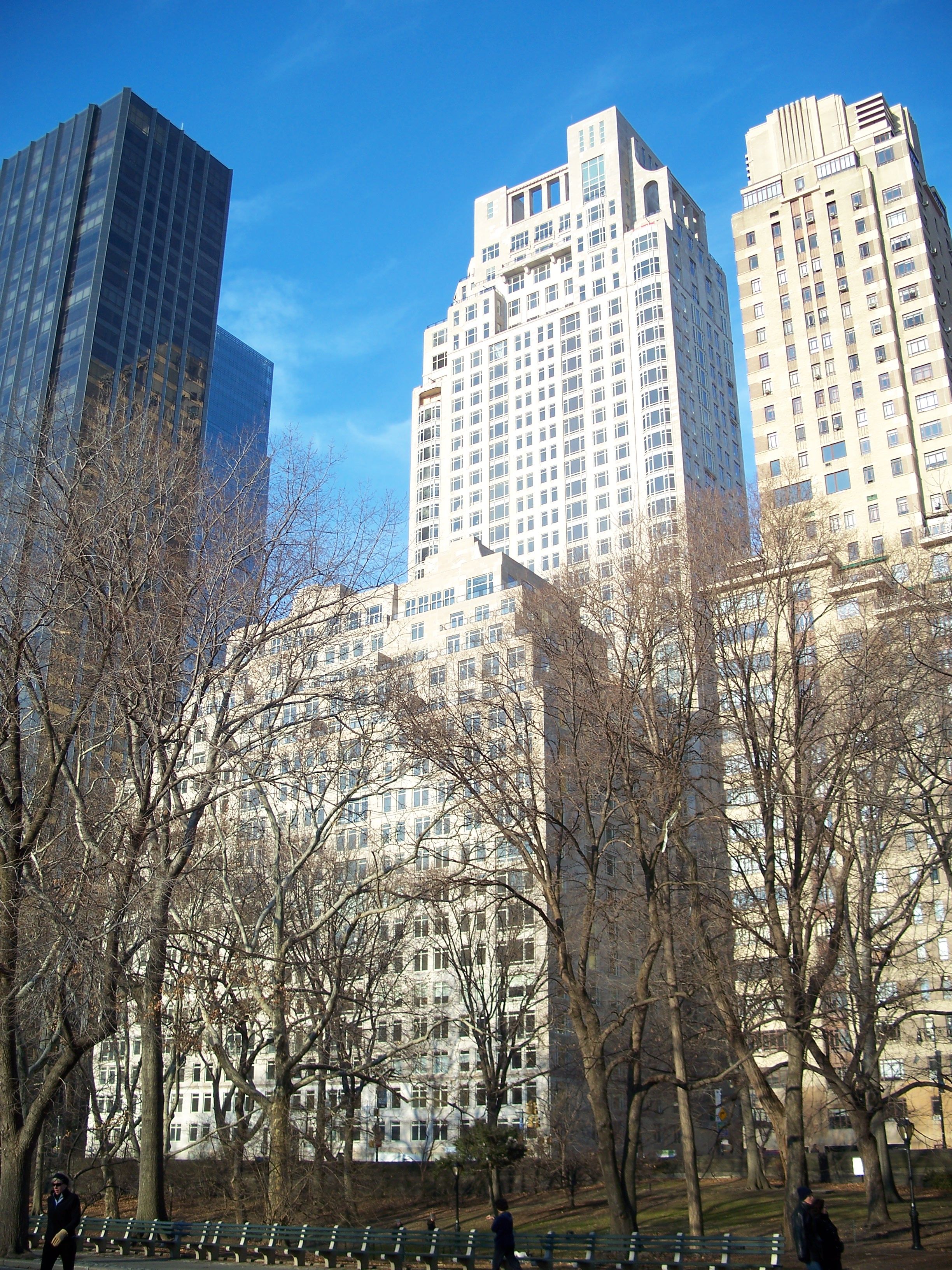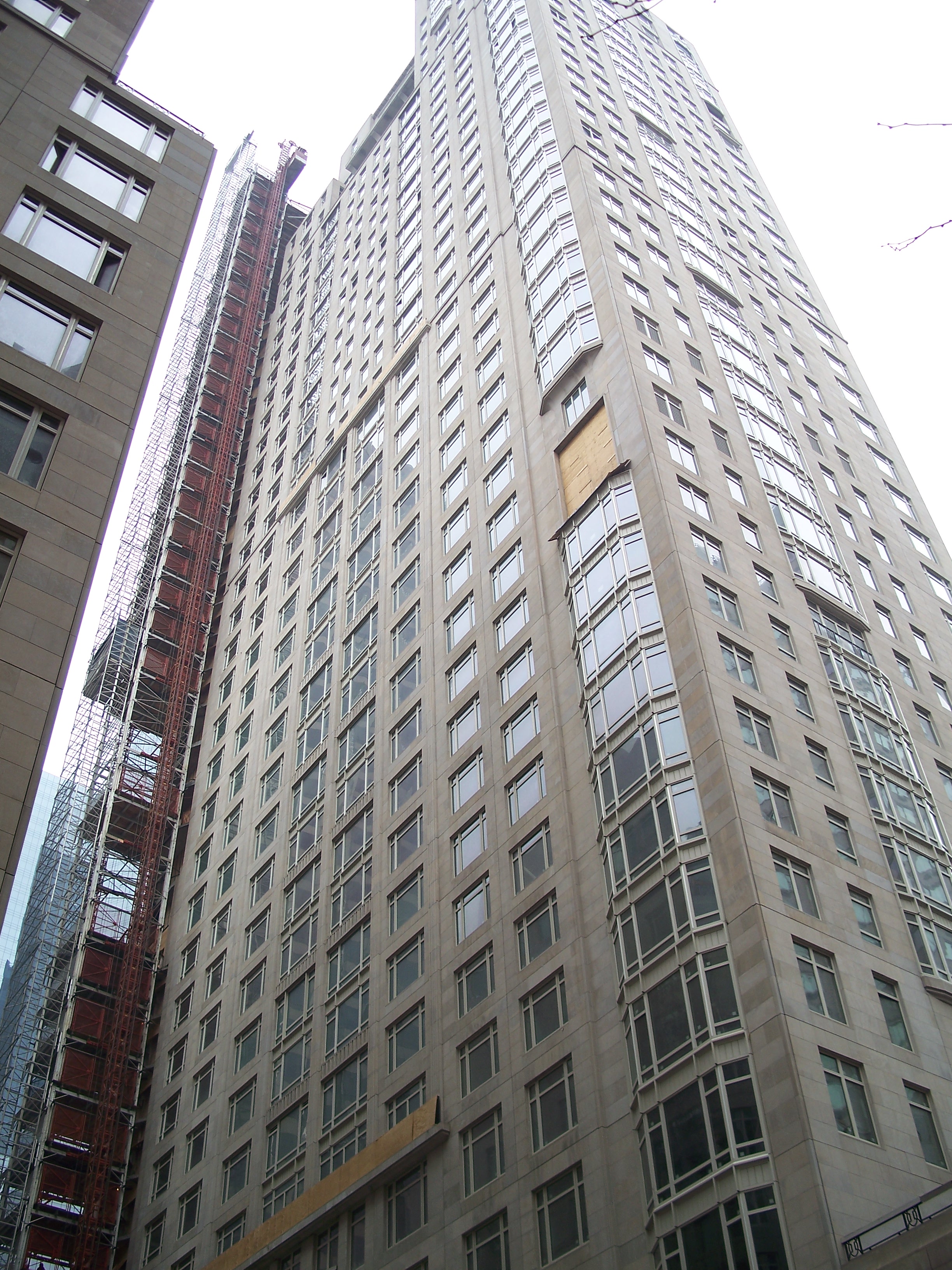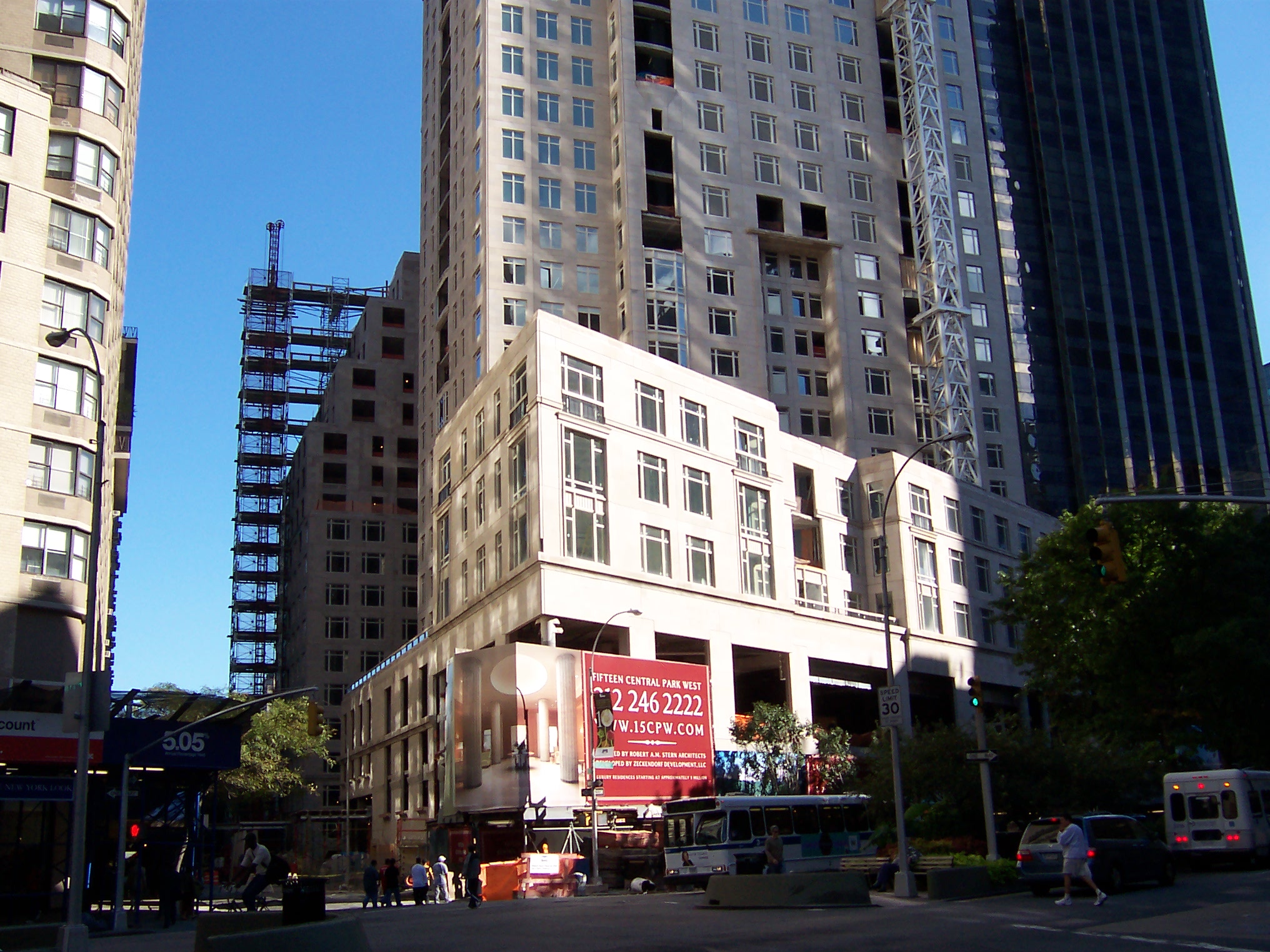 Fifteen Central Park West is bounded by West 61st and 62nd streets, Broadway on the west and Central Park West on the east. The east side of this irregular block was the home of the Mayflower Hotel and the west side had been a vacant lot since I moved to the city in the early 1990s. I followed construction of of the building since the beginning of the excavation for the foundation in 2005. In contrast to the numerous asymmetrical glass curtain-wall microtowers that were, unfortunately, very fashionable during this time period for new construction, the twin 15 CPW buildings as designed by Robert A.M. Stern Associates has a very formidable limestone exterior, which is harmonious with many of the other magnificent early 20th century residential towers on CPW. Unfortunately, that also means I will never be able to afford to live there on any of the 43 floors.