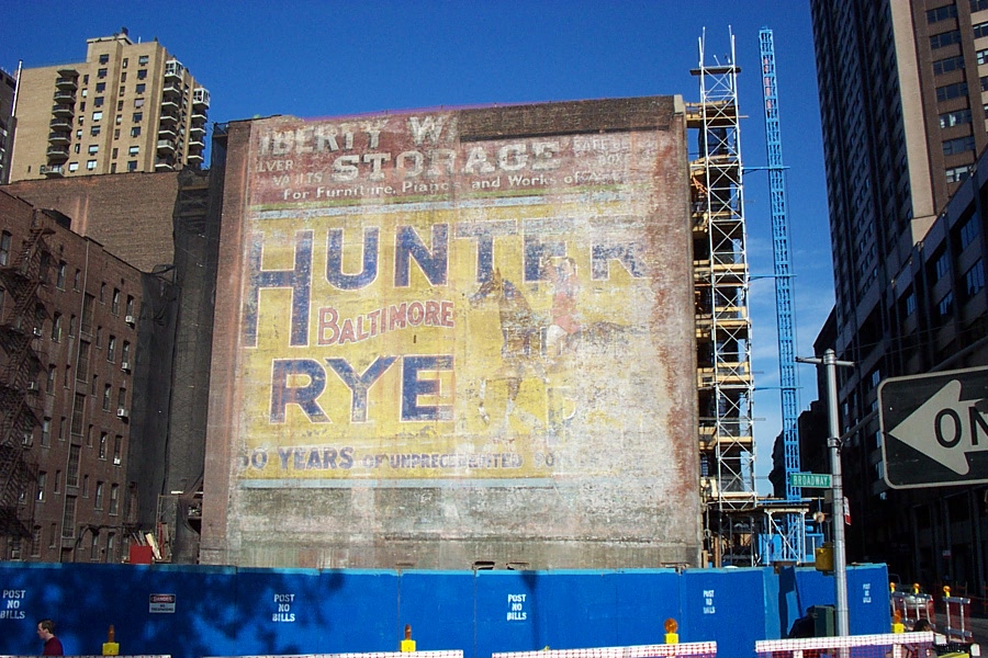 By far, the most majestic ghost sign I have ever seen in New York City was the richly-colored Hunter Rye sign that was exposed when 1930 Broadway (at 64th street) was demolished. The sign adorned the western wall of Liberty Warehouse, a structure from 1891 which itself was notable for having a replica of the Statue of Liberty on its roof. The warehouse became luxury apartments, although it is not clear if the building was entirely new or an enlargement of the warehouse. Regardless, the sign is almost certainly gone.