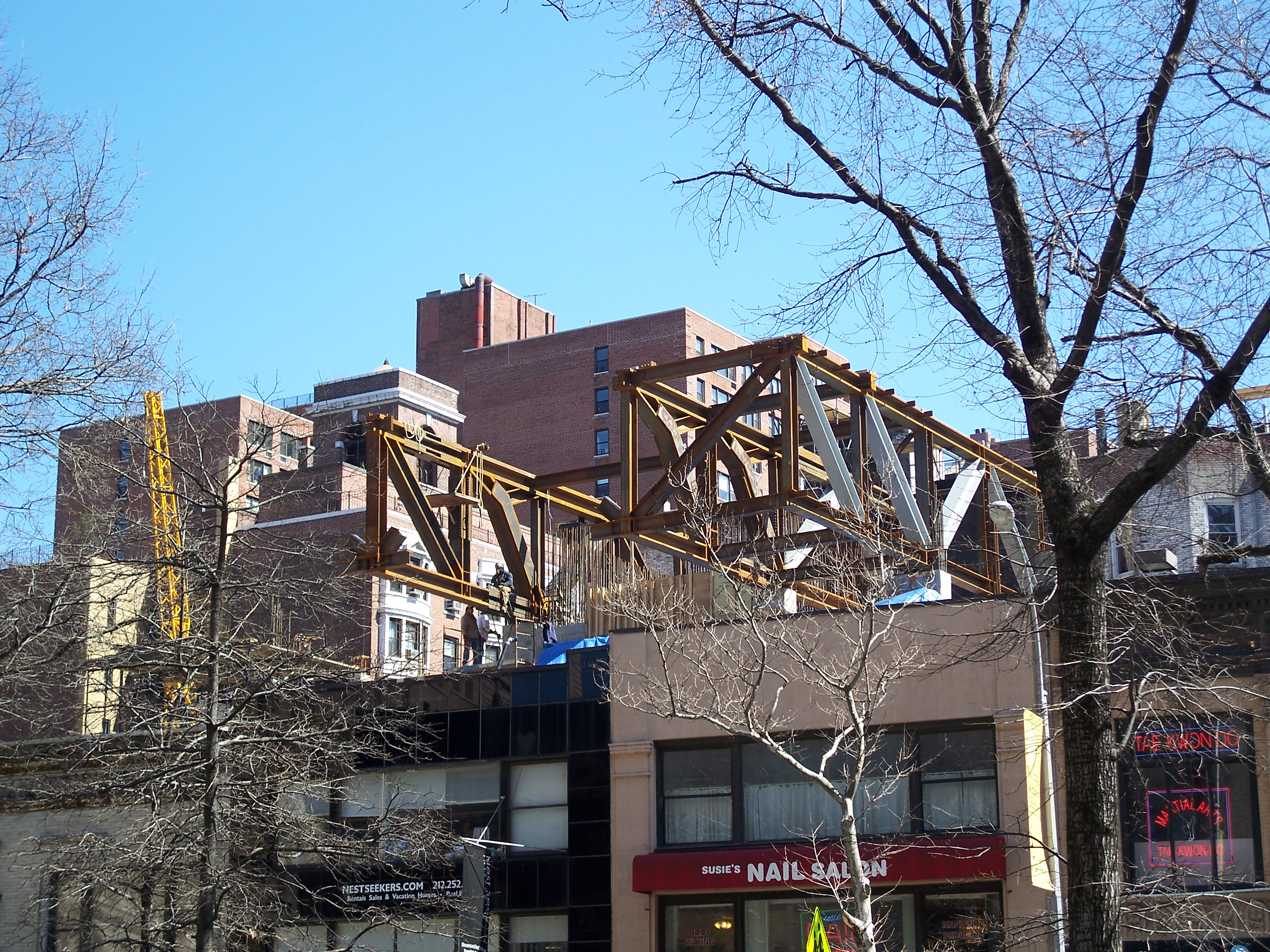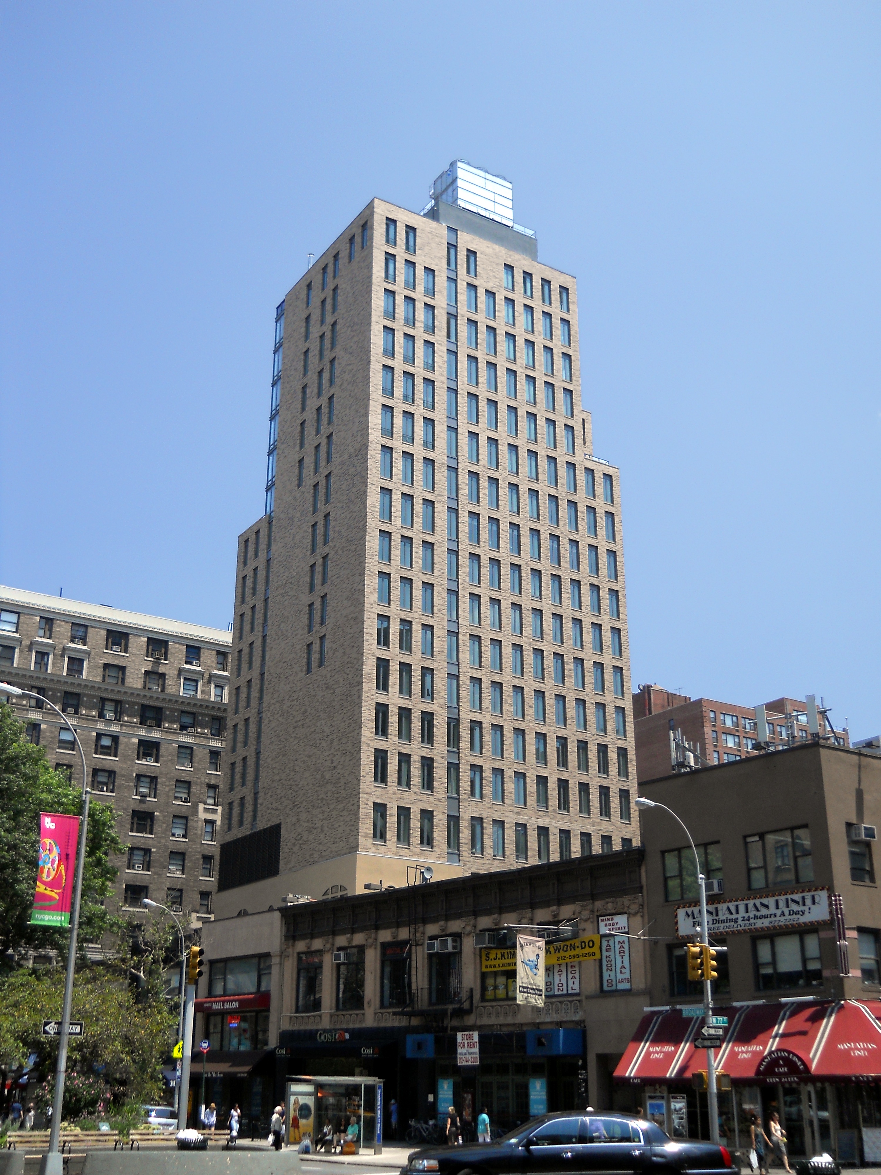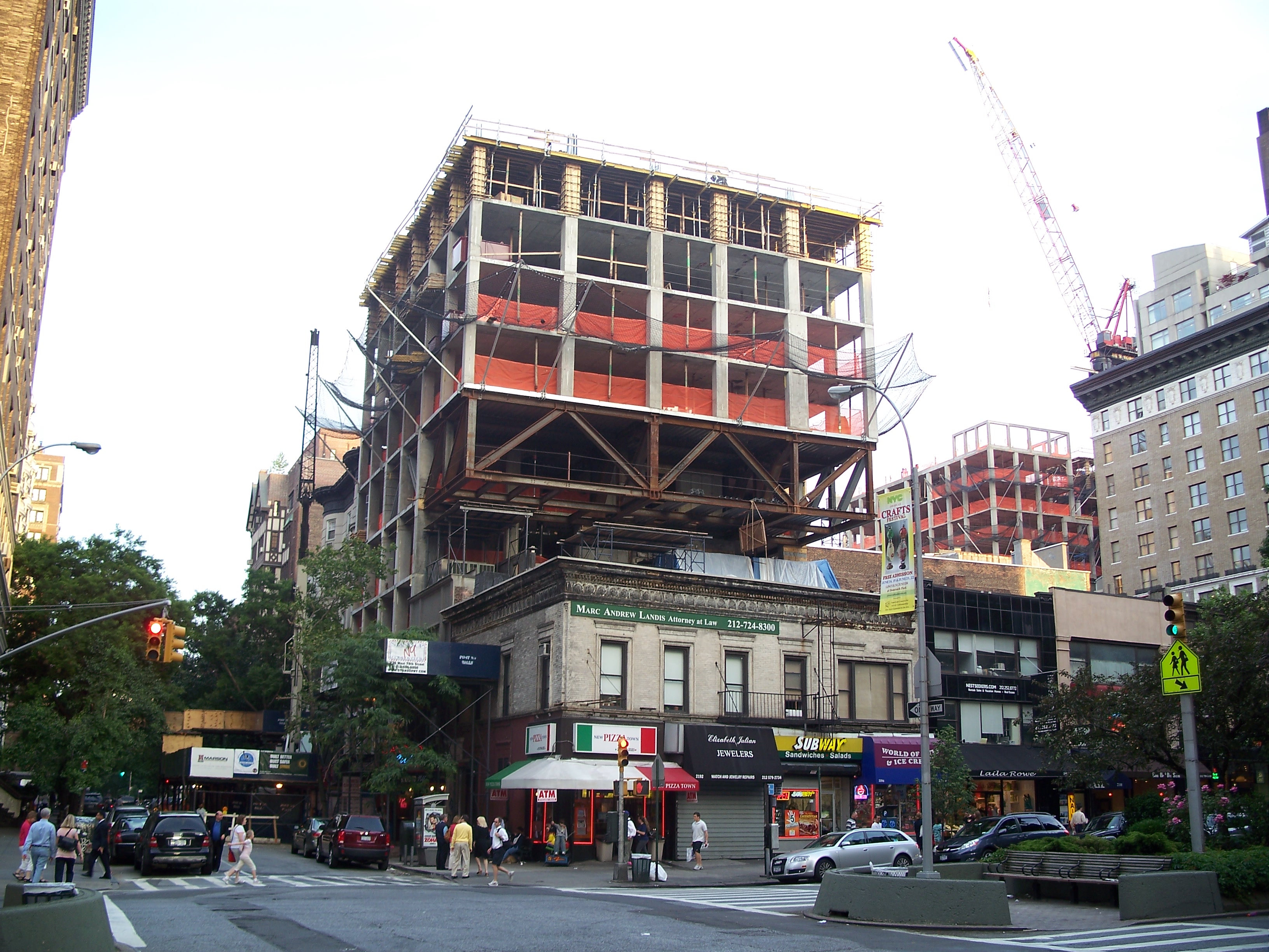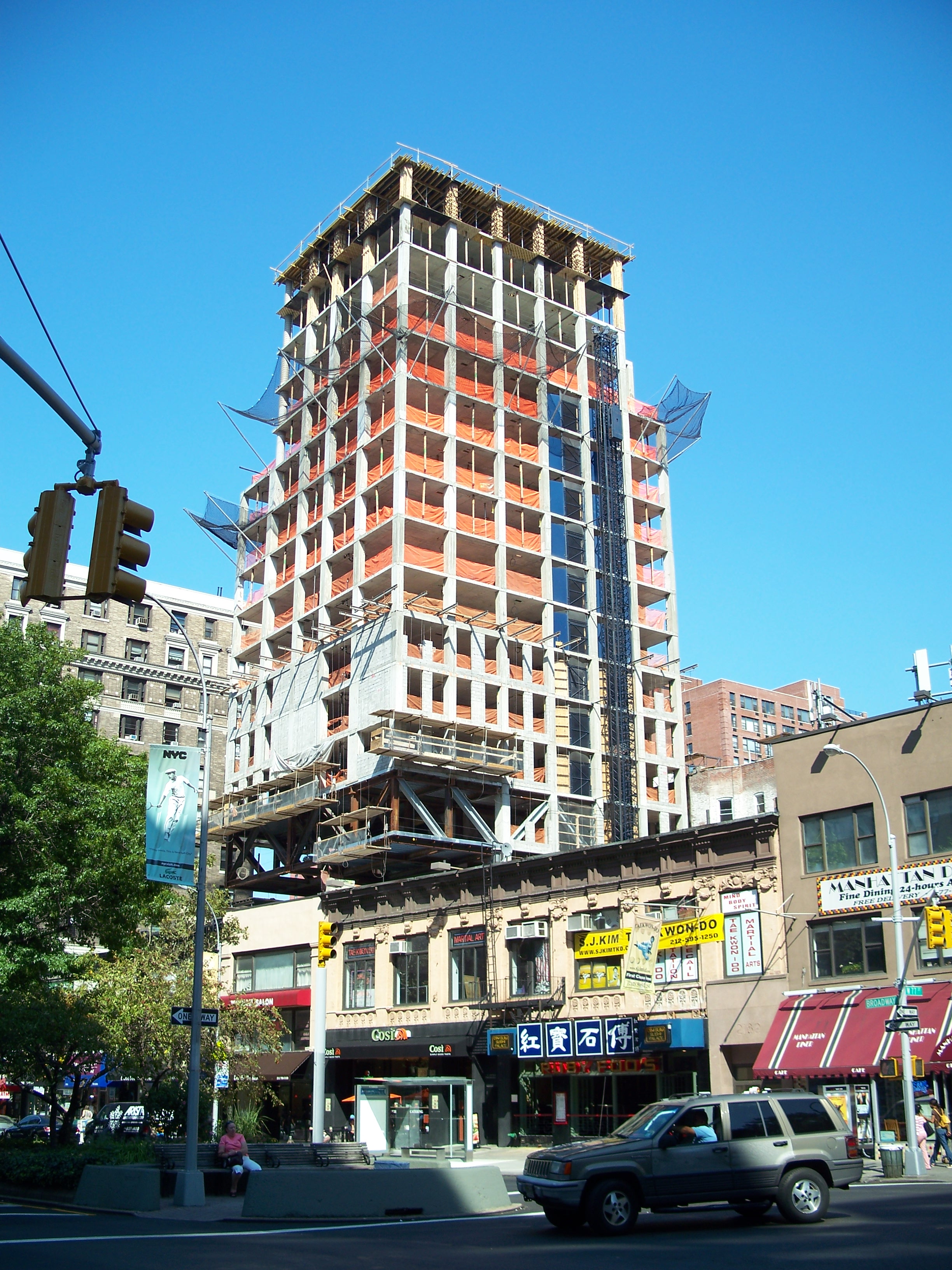 The Linden 78. Perhaps most notable for it's use of an internal truss to cantilever the western part of the building over an adjacent brownstone (housing the 78th Street Theatre Lab and StandUp NY Comedy Club). The brownstone was purchased with air rights in the 1970s when this was a much less expensive neighborhood. Presumably, this was a way to use the air rights while preserving his own building.