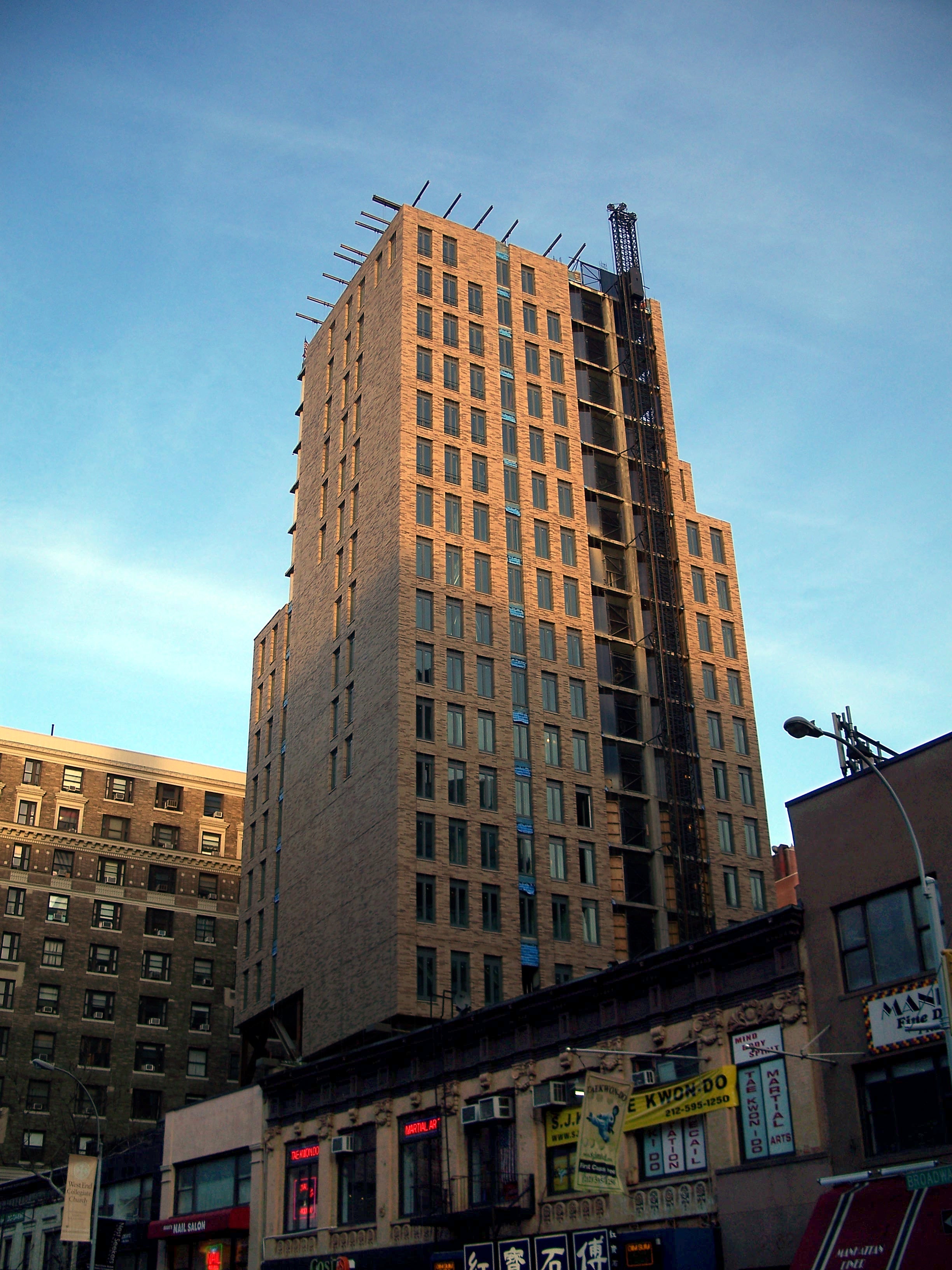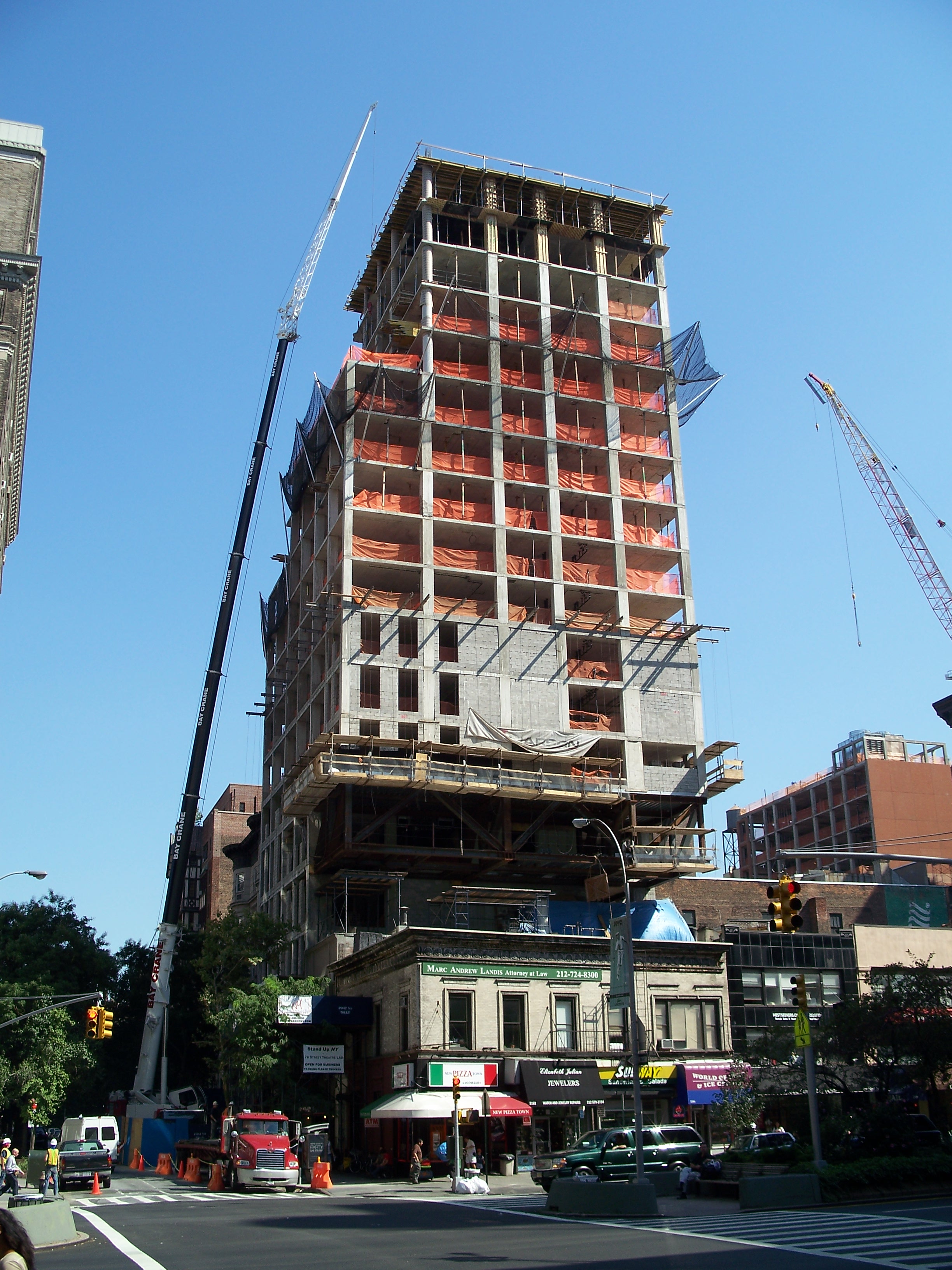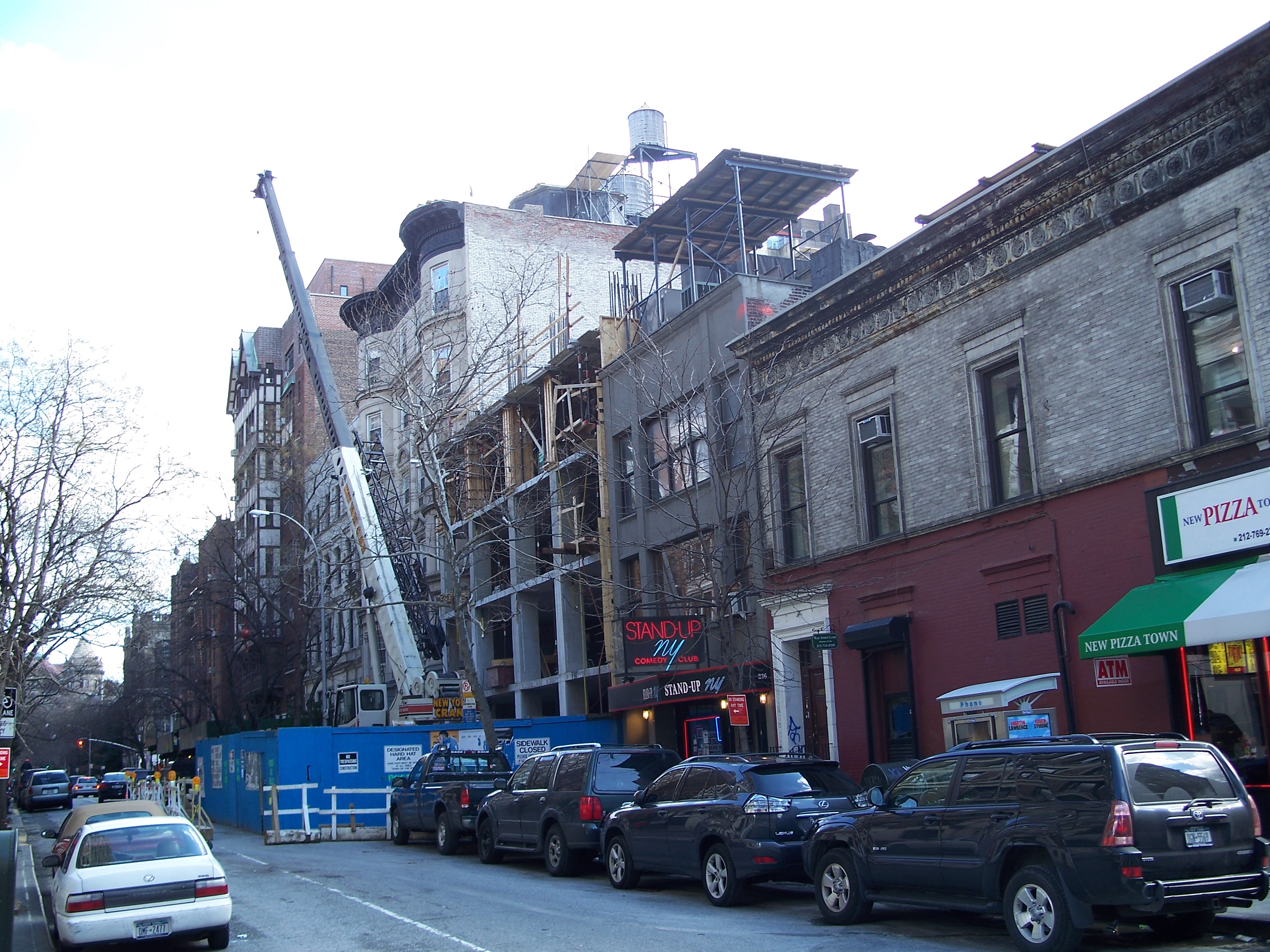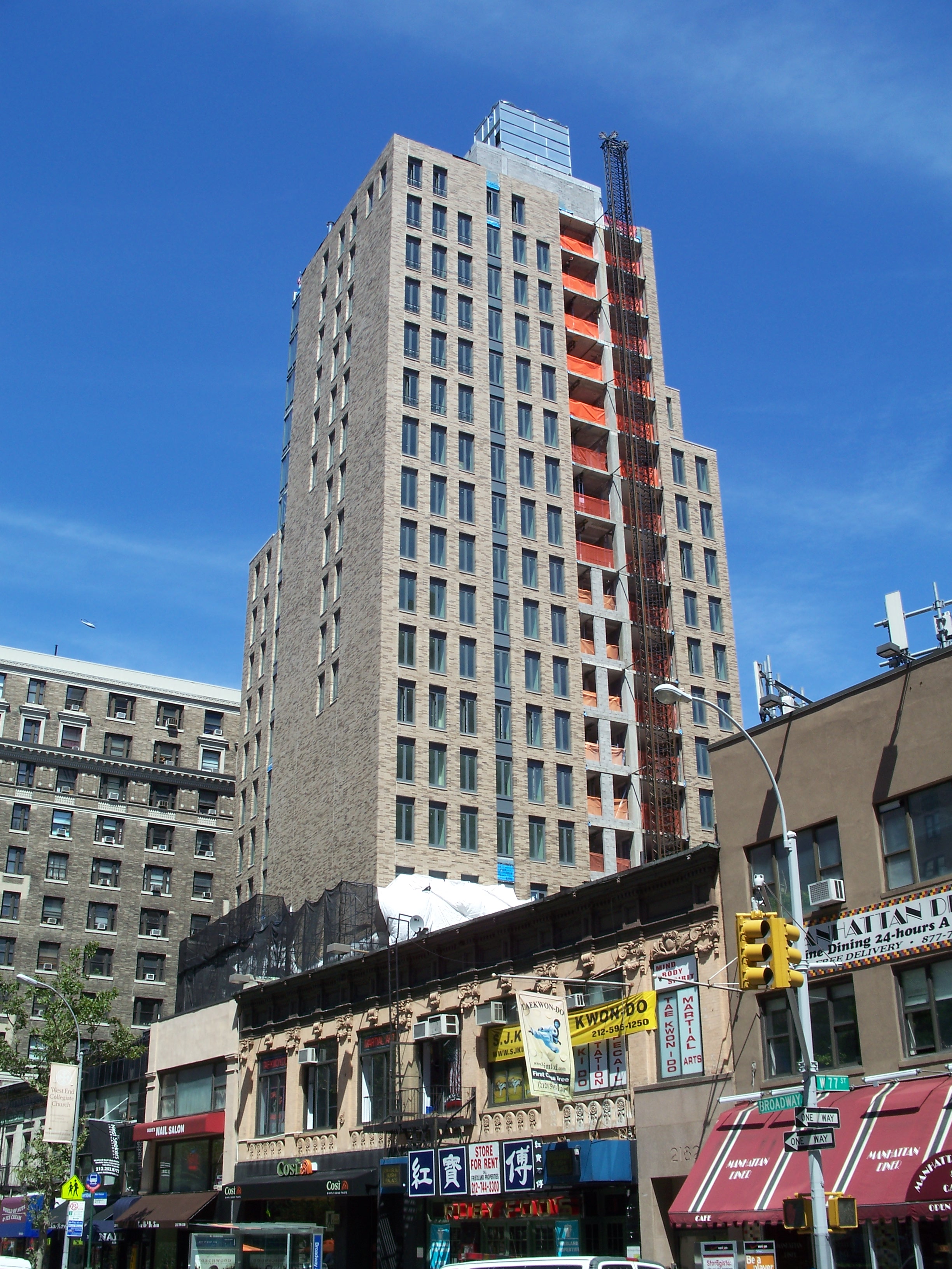 The Linden 78. Perhaps most notable for it's use of an internal truss to cantilever the western part of the building over an adjacent brownstone (housing the 78th Street Theatre Lab and StandUp NY Comedy Club). The brownstone was purchased with air rights in the 1970s when this was a much less expensive neighborhood. Presumably, this was a way to use the air rights while preserving his own building.